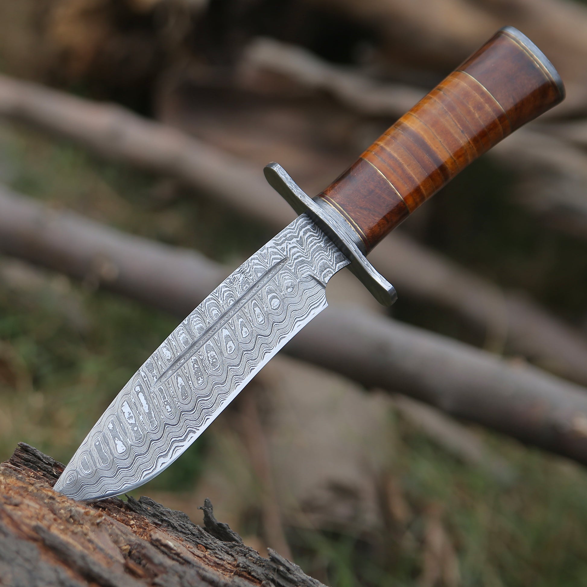 Rambo Handmade 1095 Damascus Bowie Knife with Leather Sheath - 12.0" Overall with Exotic Rose Wood & Stacked Leather Handle, Damascus Guard & Pommel, Drop Point Damascus Blade with Hand Stitched Leather Sheath, Pro Knife Sharpening & Personalized