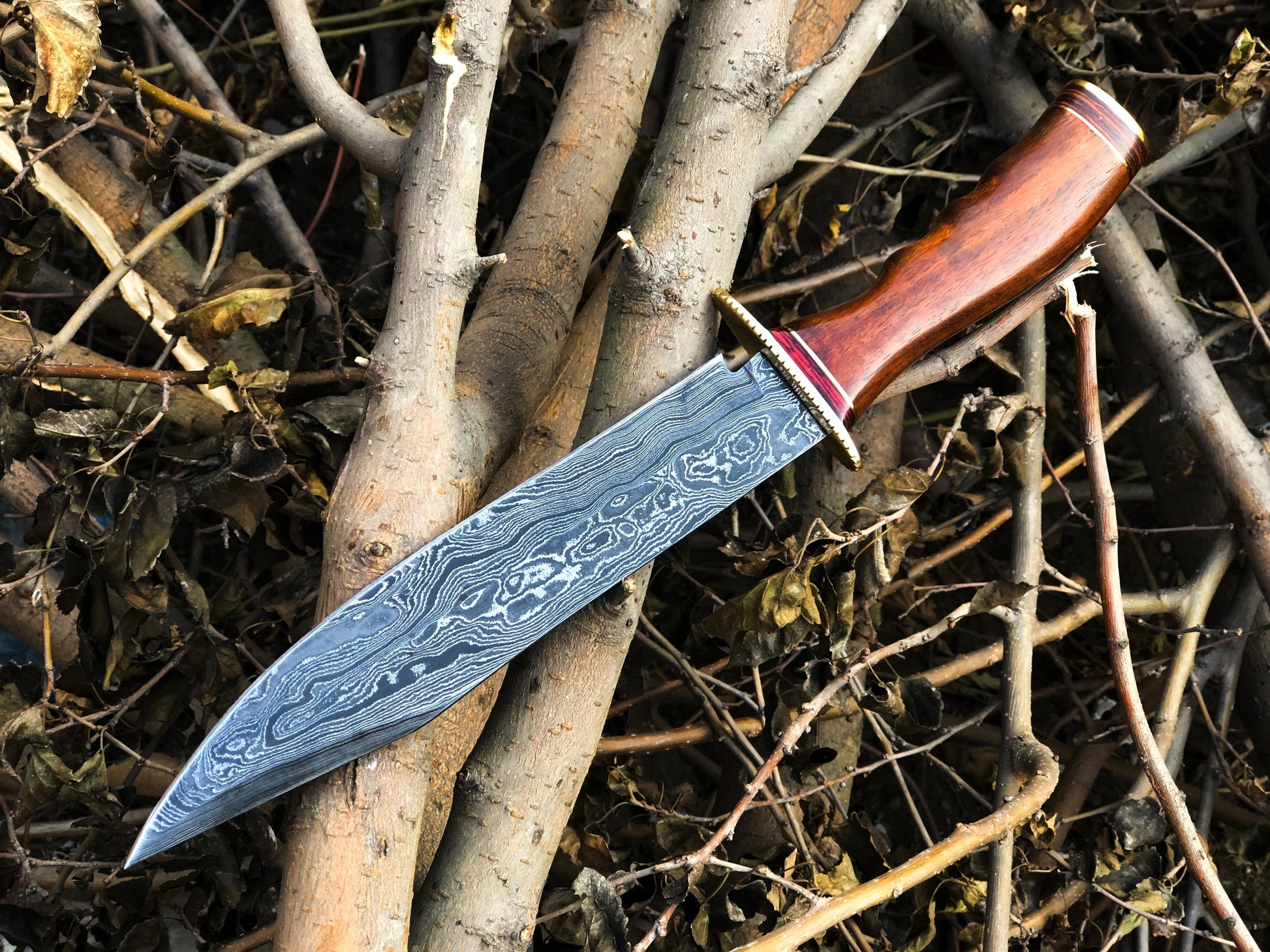 Real Bowie Knife for Sale – Custom Handmade Damascus Steel Blade with Walnut Wood Handle, Brass Guard & Leather Sheath | 14-Inch Hunting Knife – KBS Knives