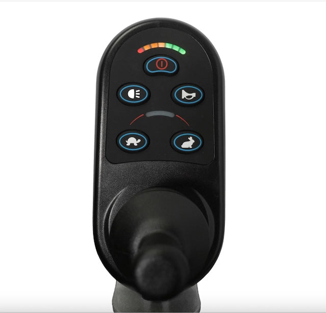-Main Controller with joystick, power on/off, speed control, battery level indicator, horn alert, headlight, charging port, and USB port for the seated user
