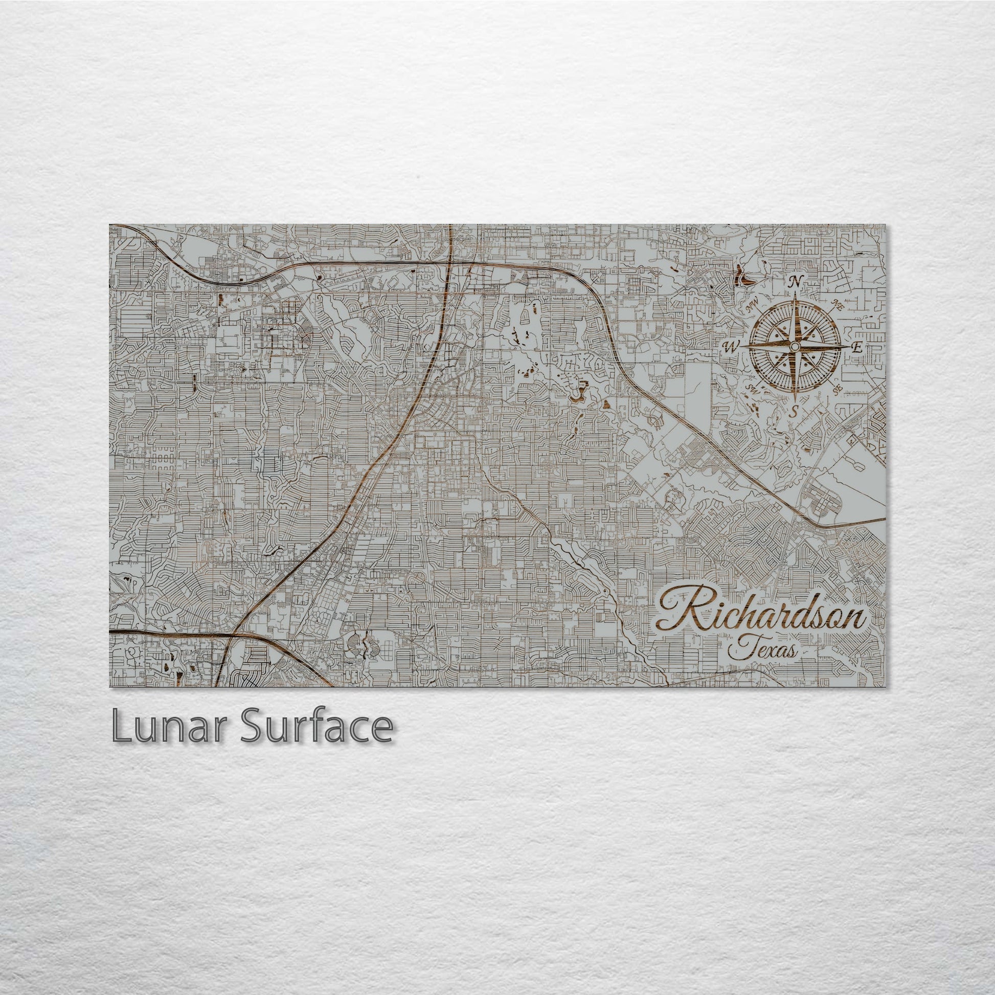 Unique gift for cartography enthusiasts: Immerse yourself in the detailed streets of Richardson, Texas with this wood-engraved artwork. Expertly crafted on premium pine wood, the precision of Richardson's layout is brilliantly showcased, making it an essential piece for those linked to the city or admirers of geographic artistry.