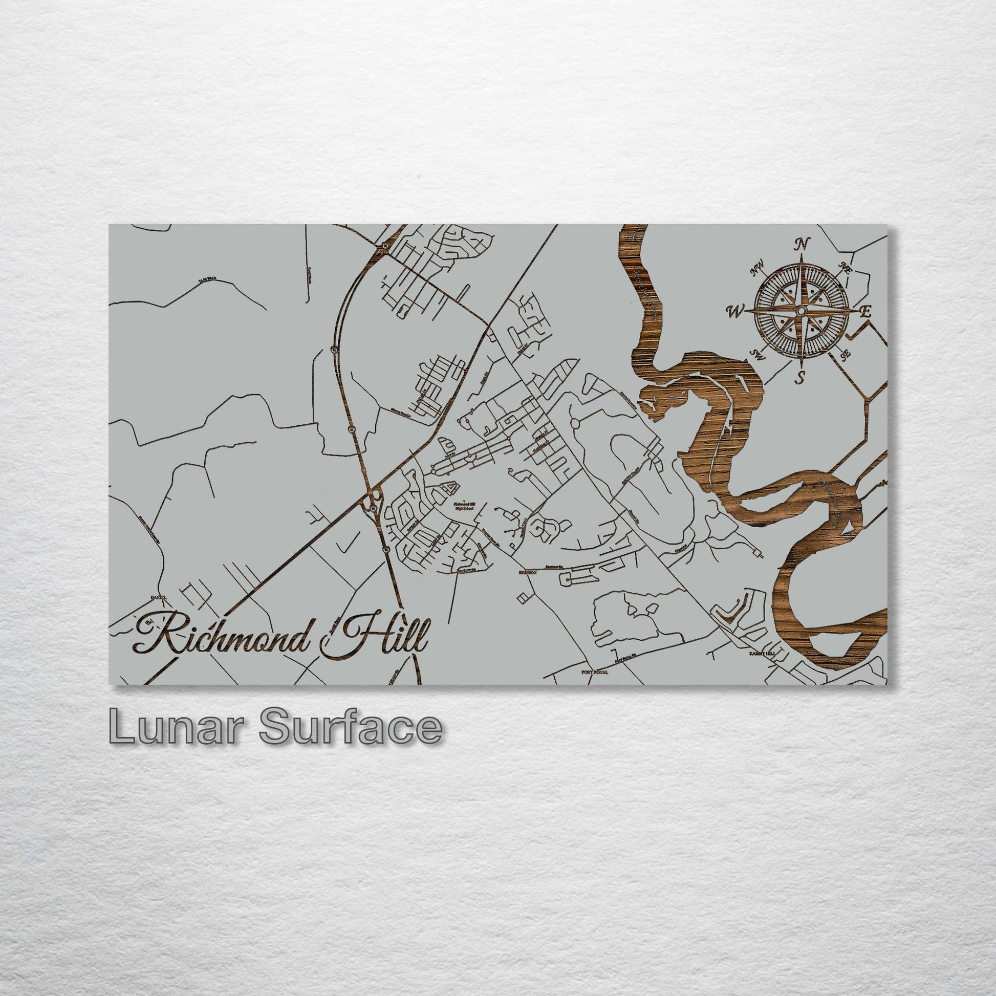 Elegant Gift for Admirers of Geographic Design: This wood-engraved Richmond Hill, Georgia street map is a beautiful addition to any art enthusiast's collection. Crafted from superior pine wood, its detailed street patterns are meticulously etched, showcasing a visually captivating piece. It's ideal for those who appreciate the intricacies of geographic layouts and the artistic depiction of street maps.