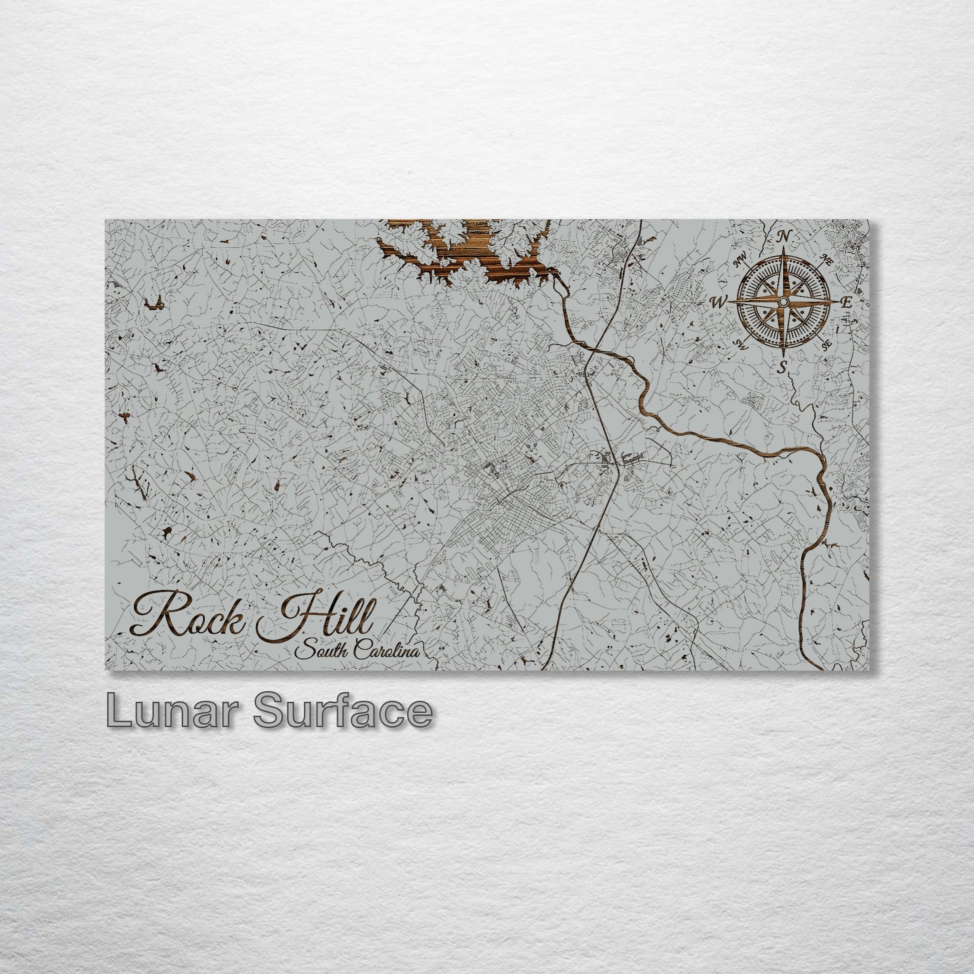 Elegant Gift for Map and Art Enthusiasts: This wood-engraved Rock Hill, South Carolina street map is a unique addition to any art collection. Crafted with care from high-quality pine wood, its intricate street layouts are delicately etched, showcasing a visually stunning piece. It's perfect for those who have a passion for the artistic representation of geographic designs and street maps.
