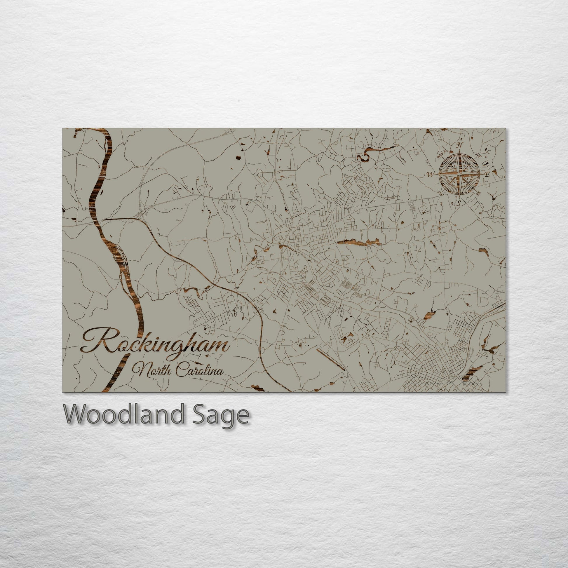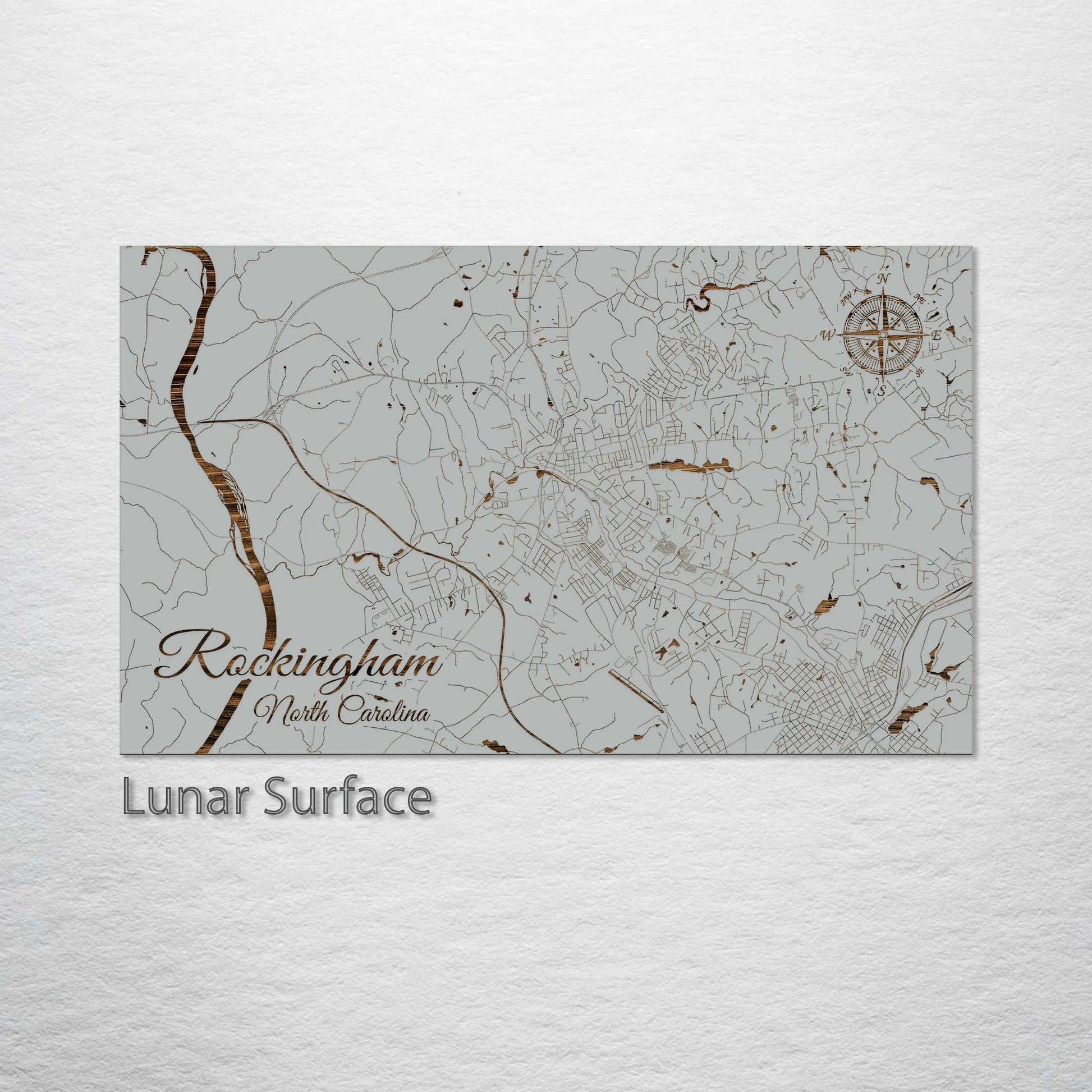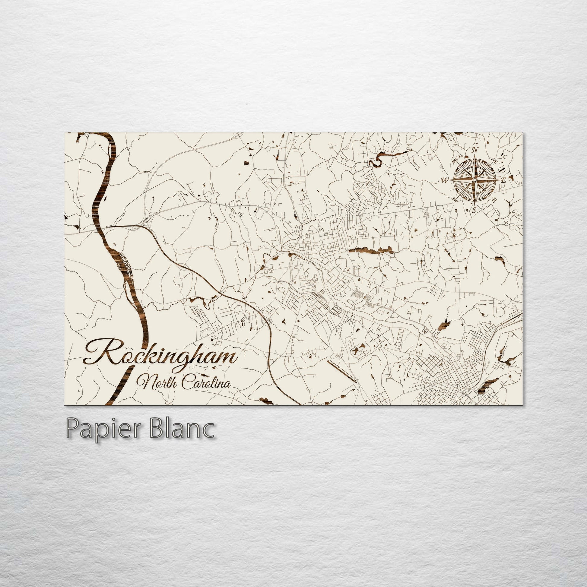 Sophisticated Gift for Map Enthusiasts: This wood-engraved Rockingham, North Carolina street map is an exquisite addition to any art collection. Meticulously crafted from premium pine wood, it showcases the elaborate street network of Rockingham with precision and artistic flair. This piece is ideal for those who appreciate a fusion of geography and art, rendered in a style that's rich in detail yet elegantly straightforward.