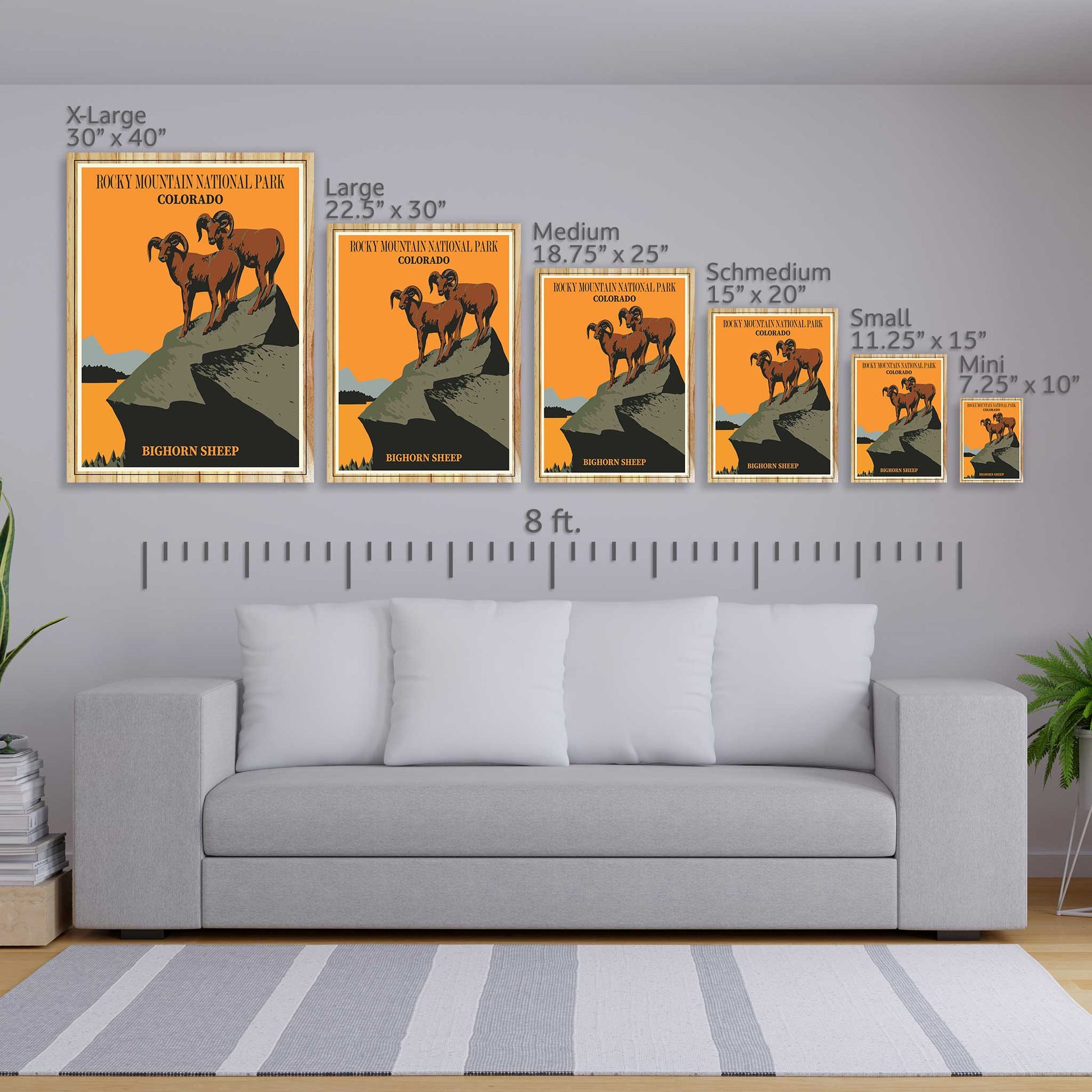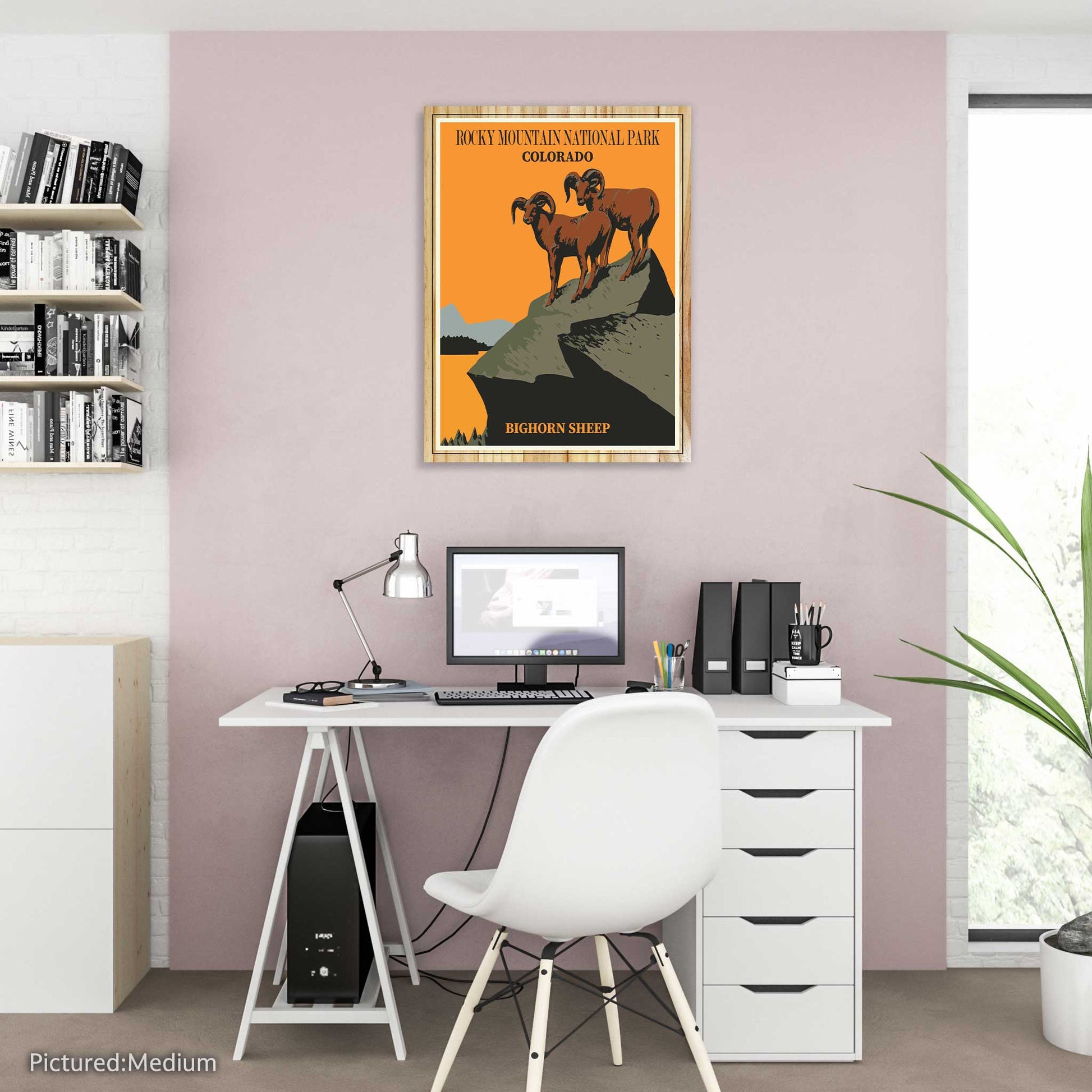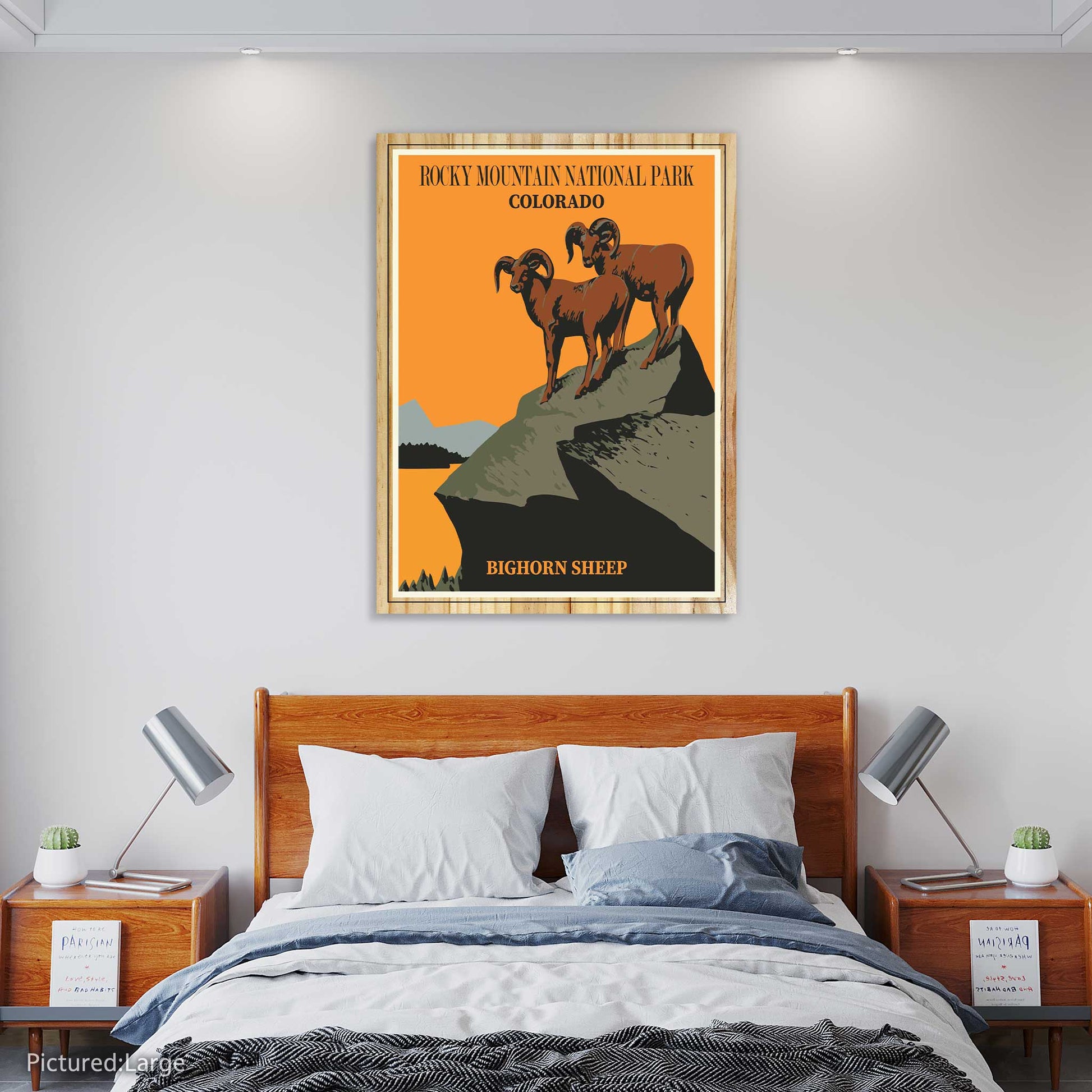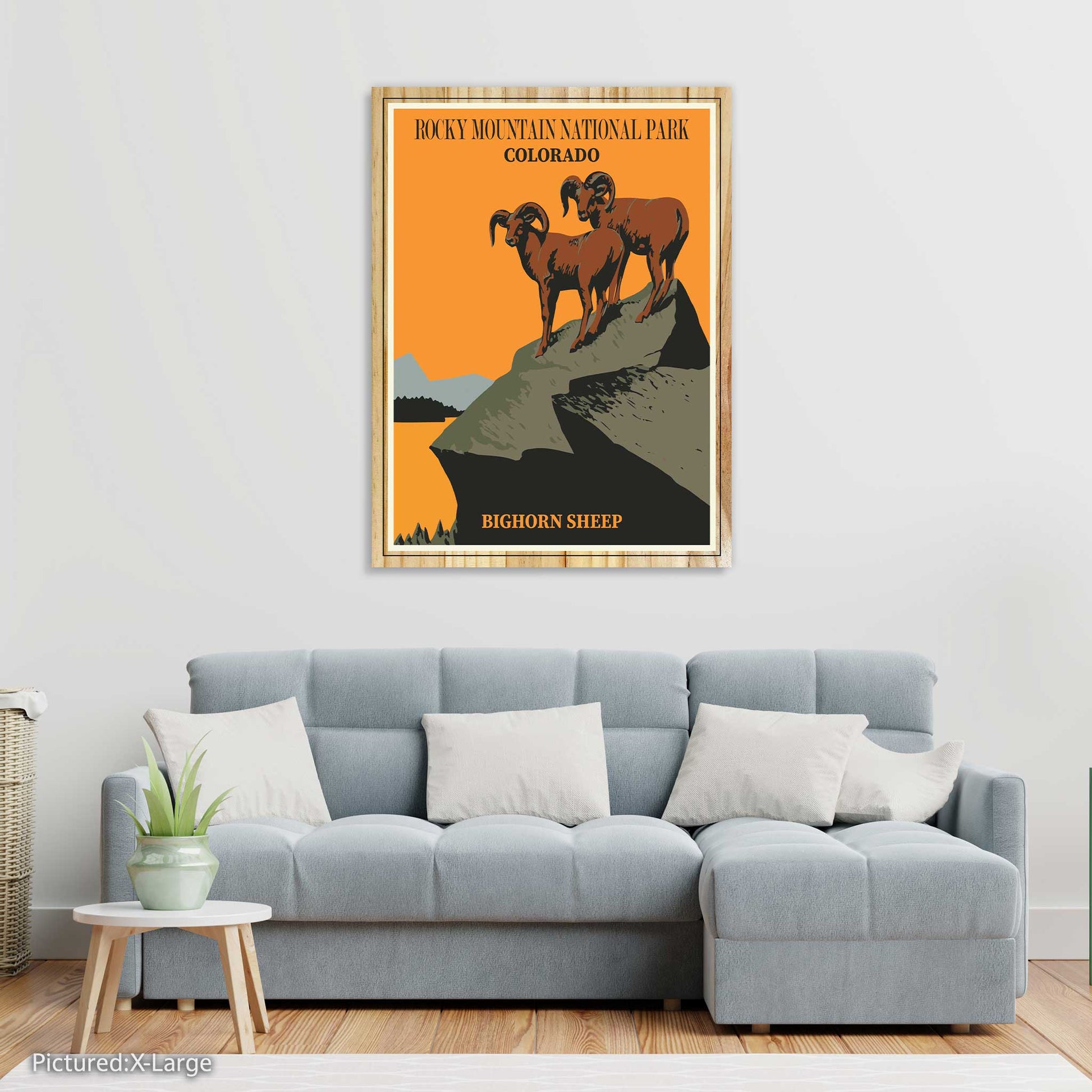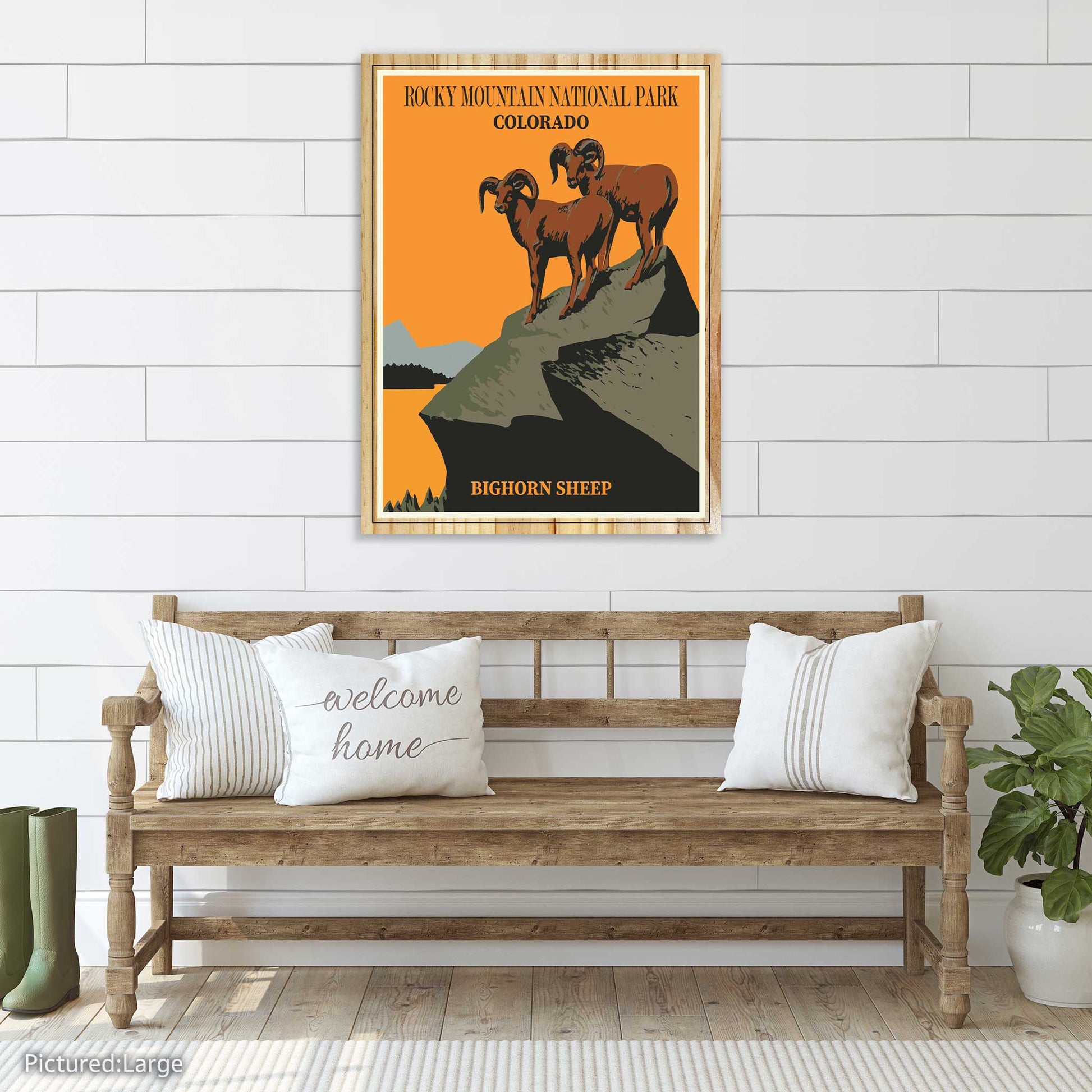 Capture the beauty of Rocky Mountain National Park, Colorado with this vintage-inspired travel poster, printed on natural pine wood for a unique look and texture. Elevated or flat print options make it easy to display your wall art wherever you'd like.