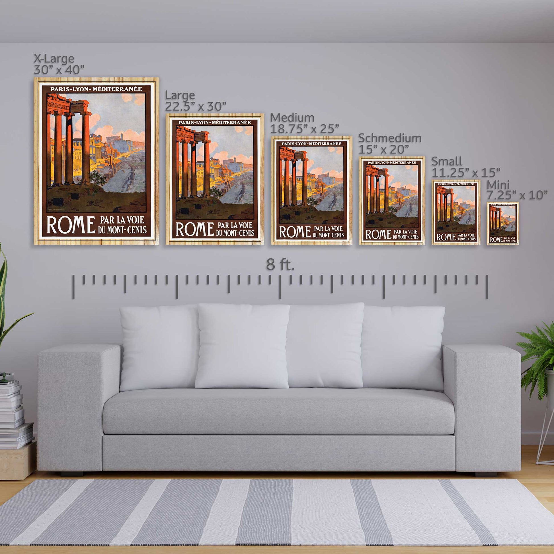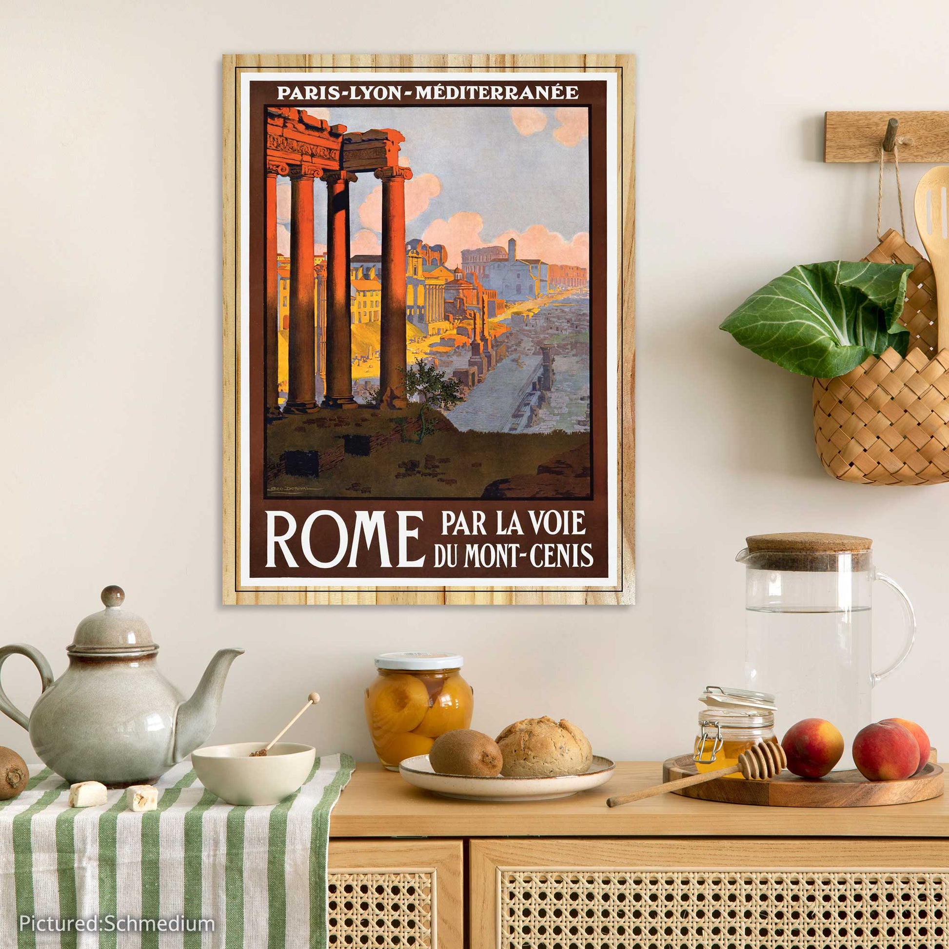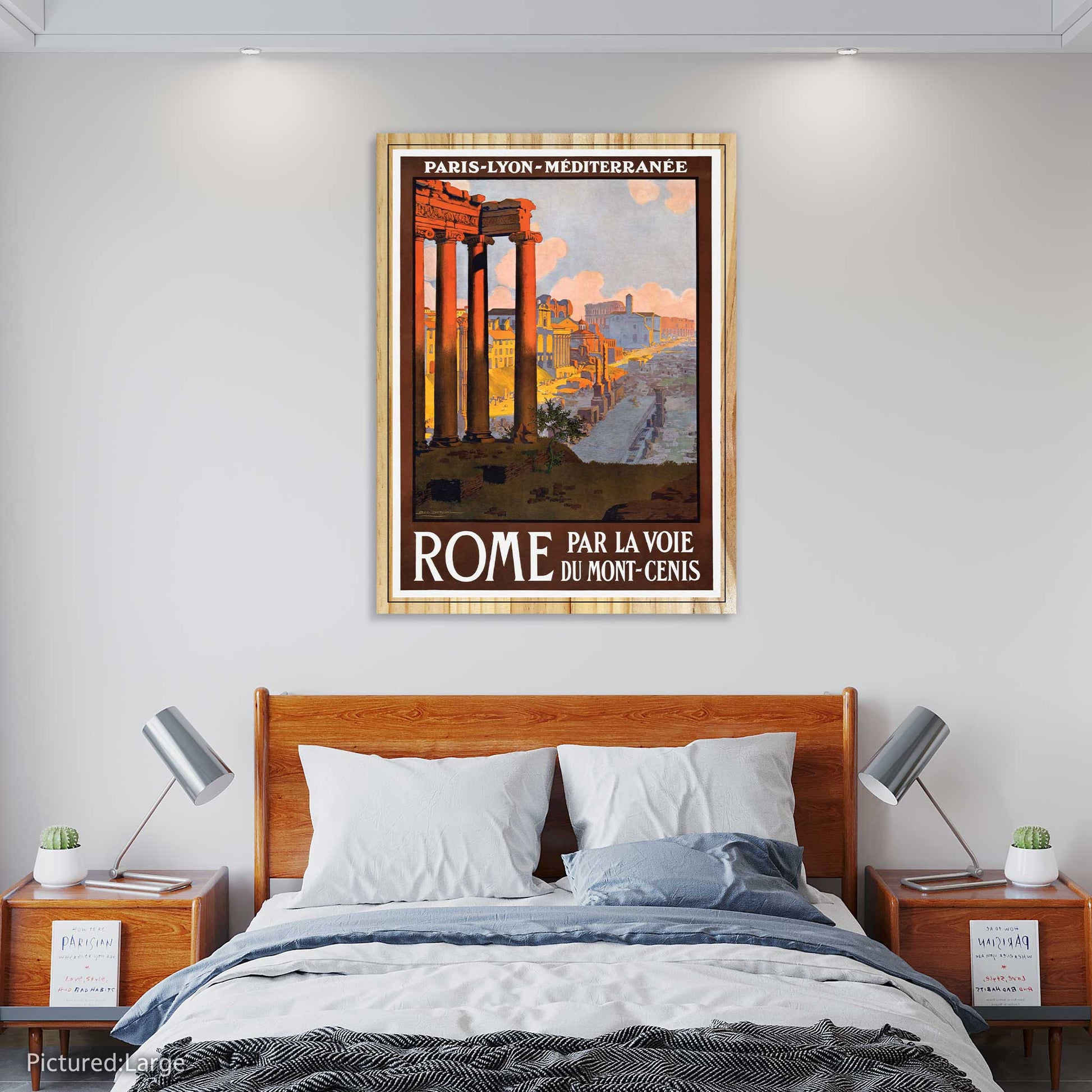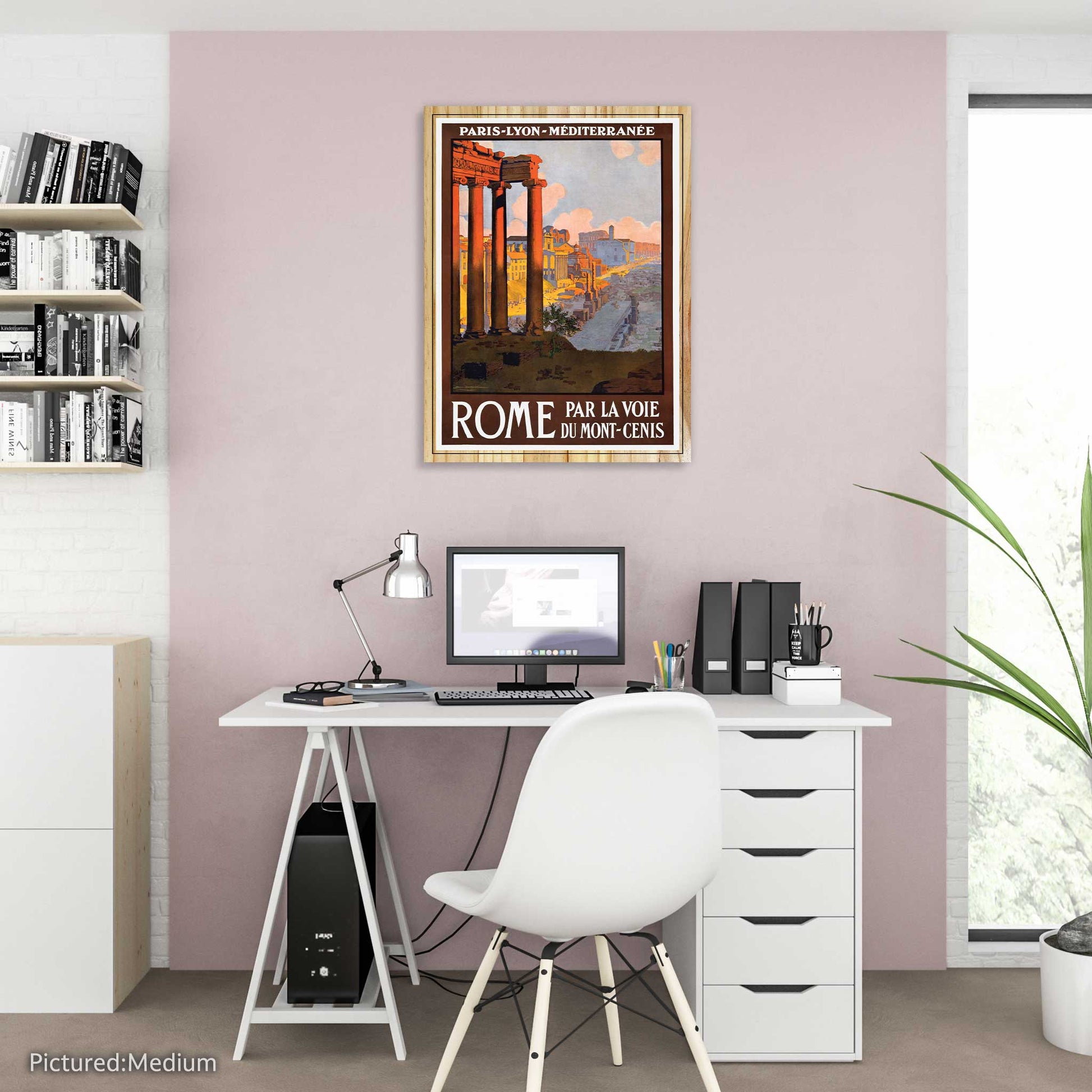 Vivid and beautiful, this Rome via the Mont-Cenis Route travel poster, printed on pine wood, adds an eye-catching touch of vintage to any home or office. Choose between an elevated or flat print for the perfect fit in any space.