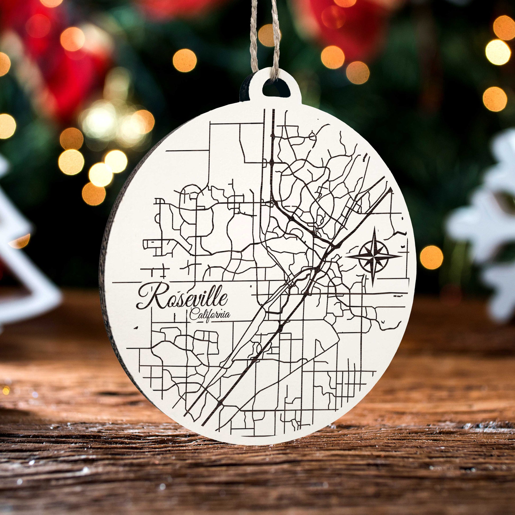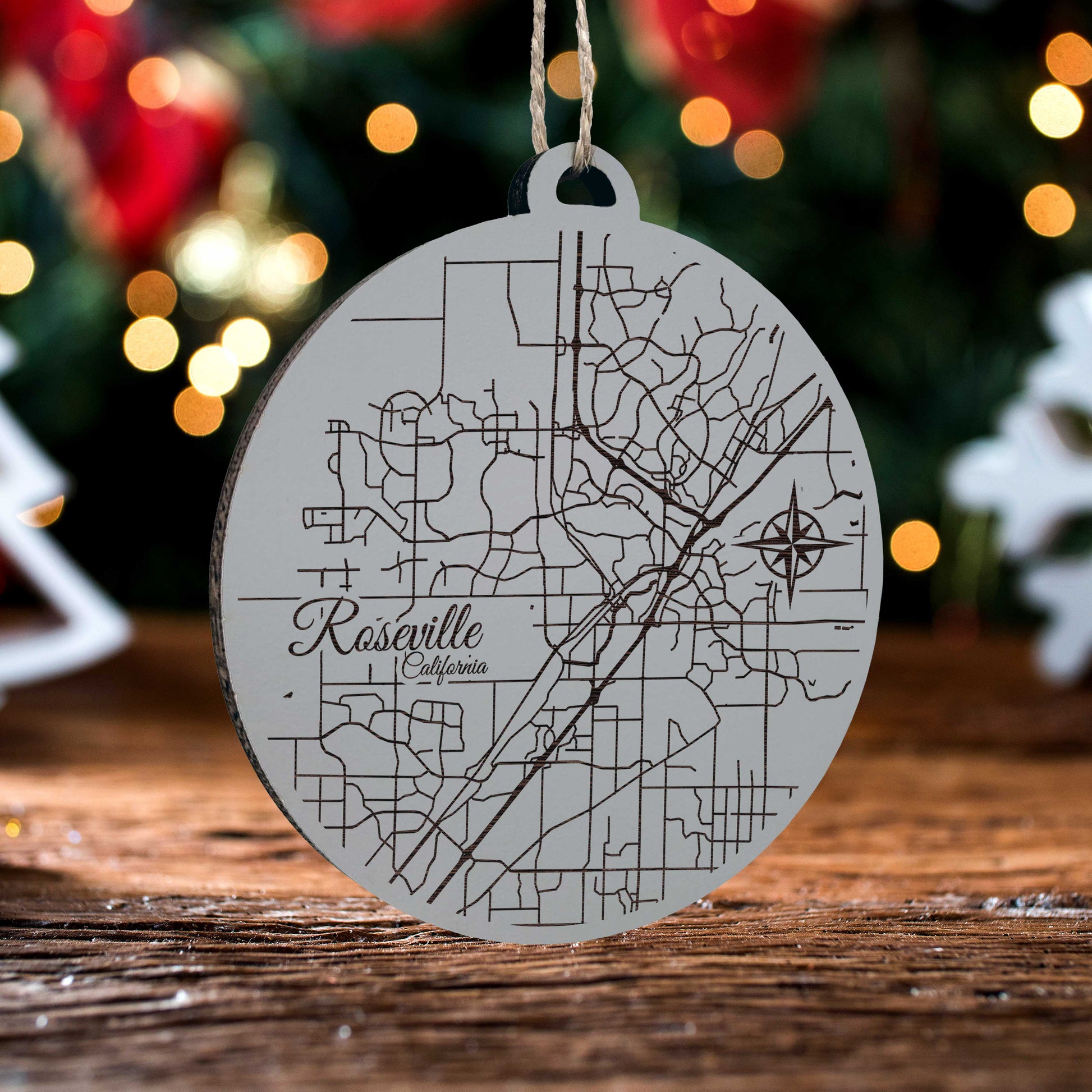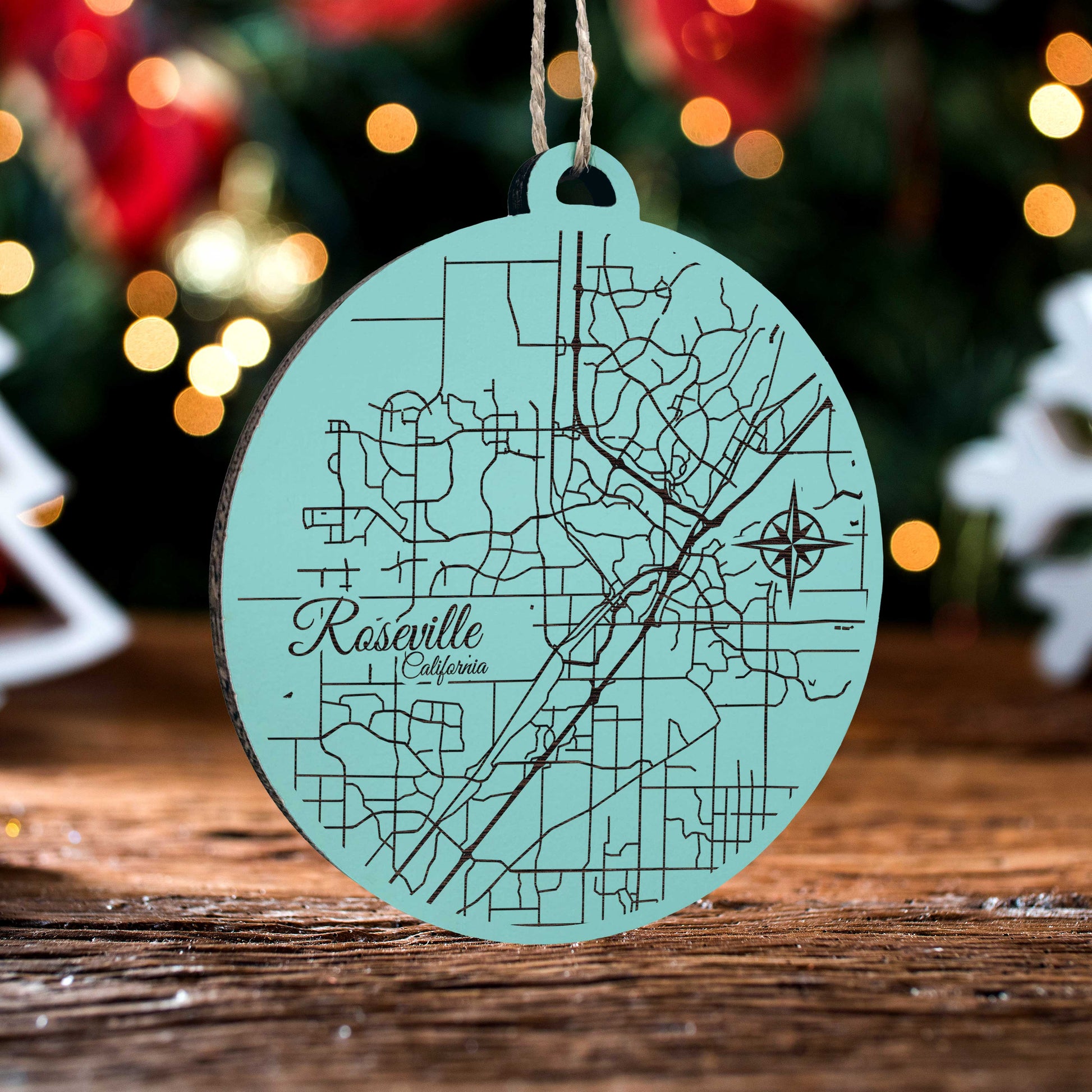 Enjoy Roseville, California during the holidays with our handcrafted wooden map ornament! Sized at 4” x 5” and available in 6 color options, this ornament is meticulously carved from premium pine wood, featuring Roseville, California's unique layout. It's an artistic blend of memory and decor, ideal for the holidays or as a treasured memento.