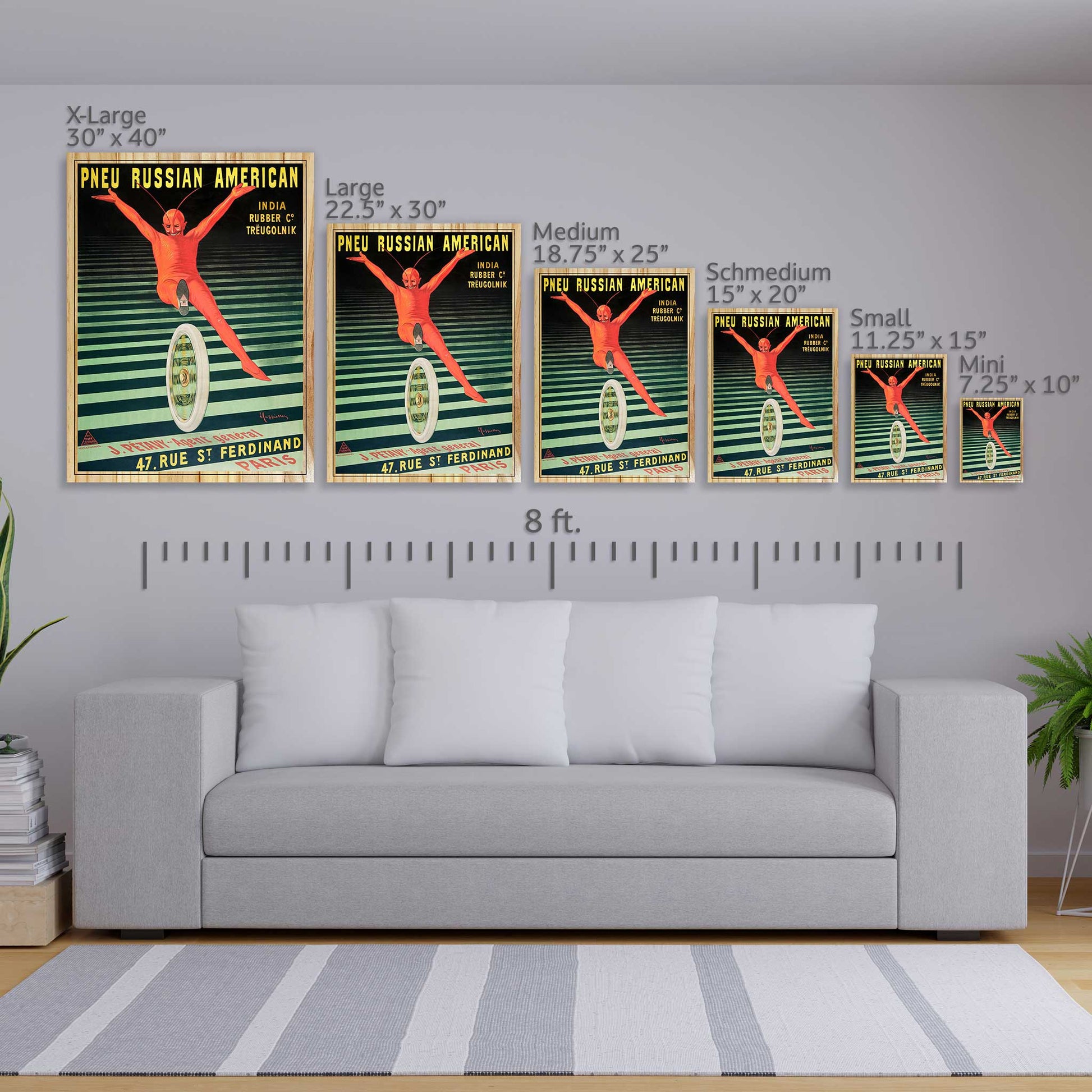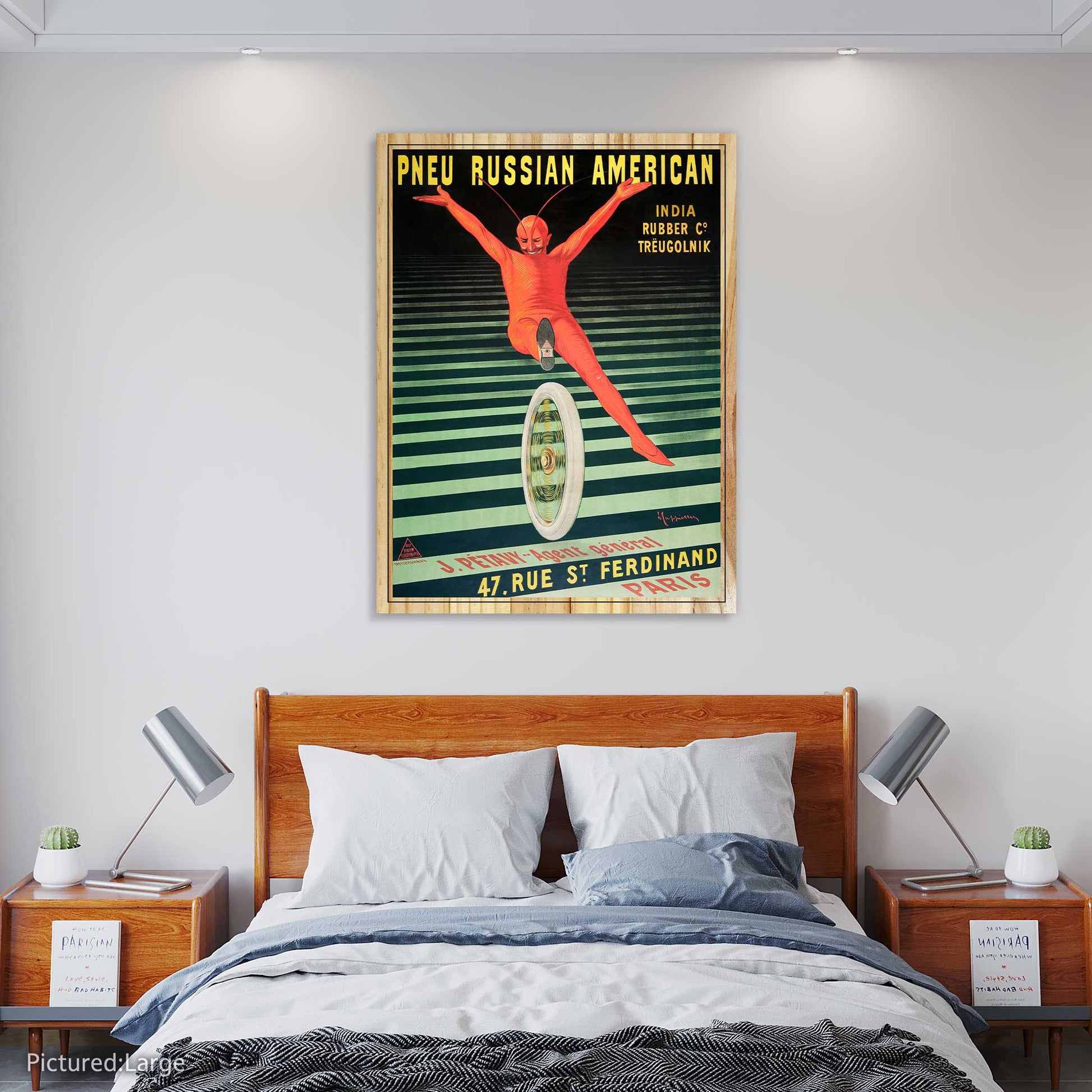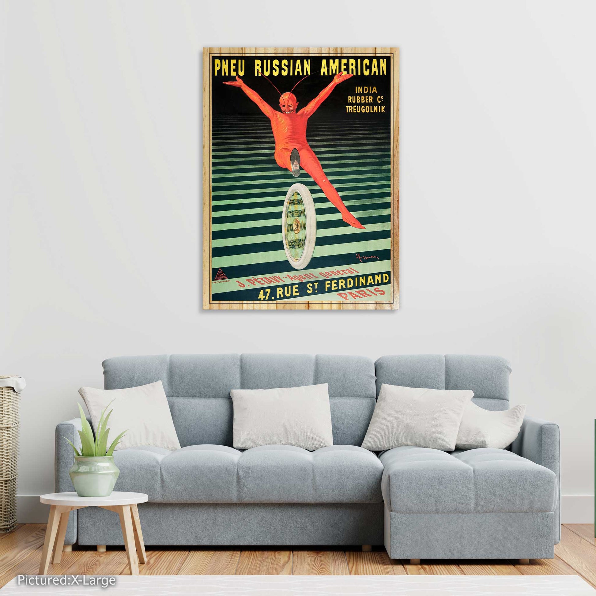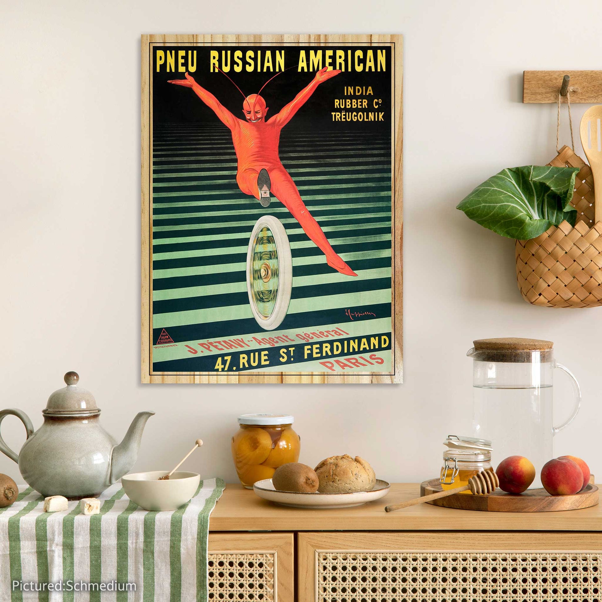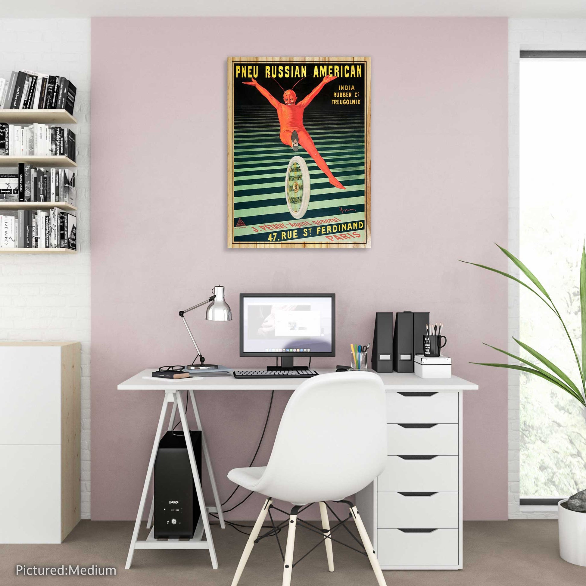 "Russian American Tire" is a vintage advertising poster created by Italian-French artist Leonetto Cappiello in 1906. The poster was commissioned to promote the Russian American Rubber Company, which was a prominent tire manufacturer at the time.