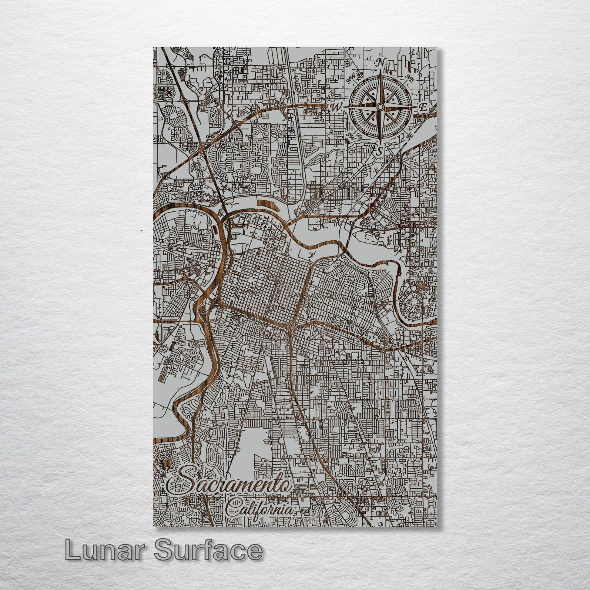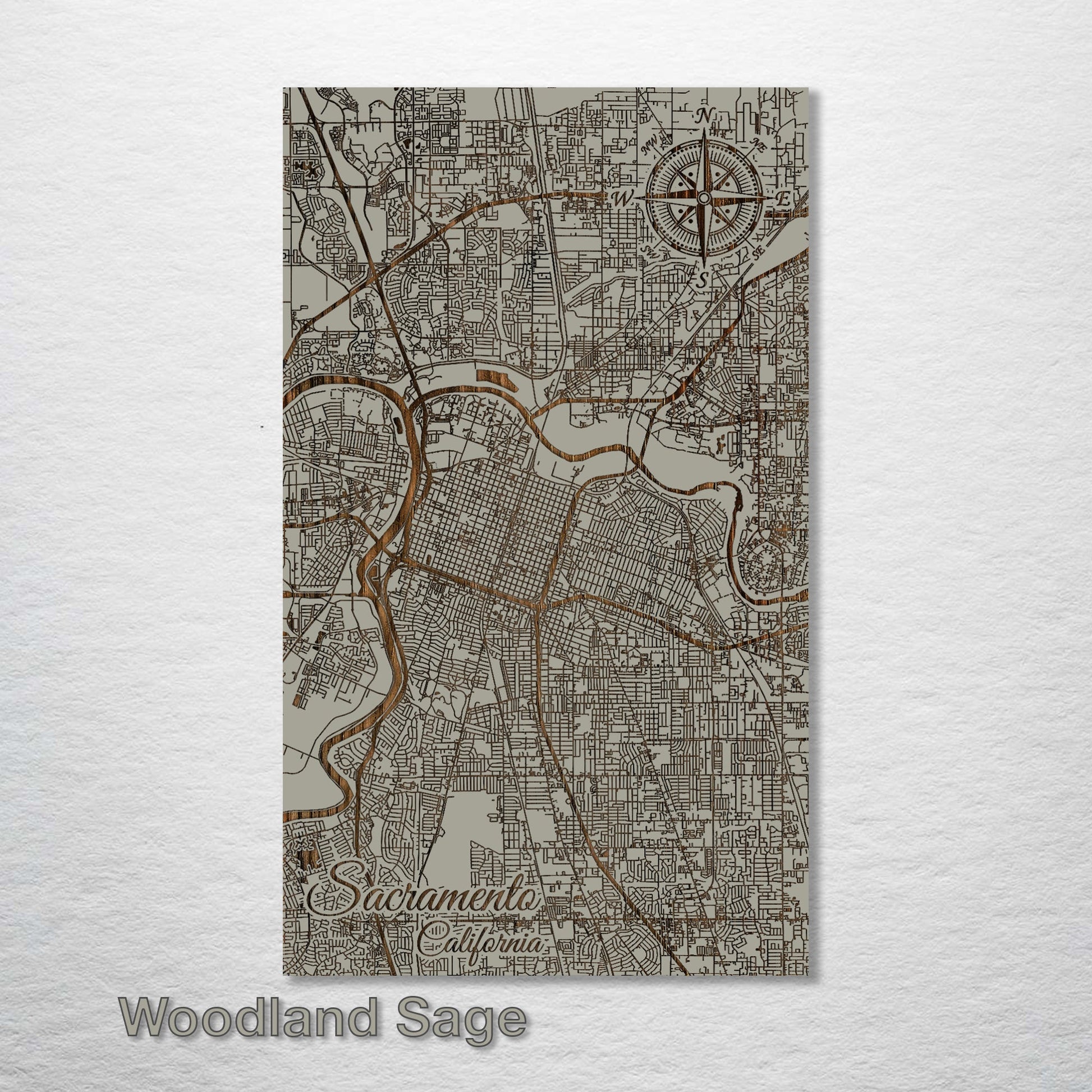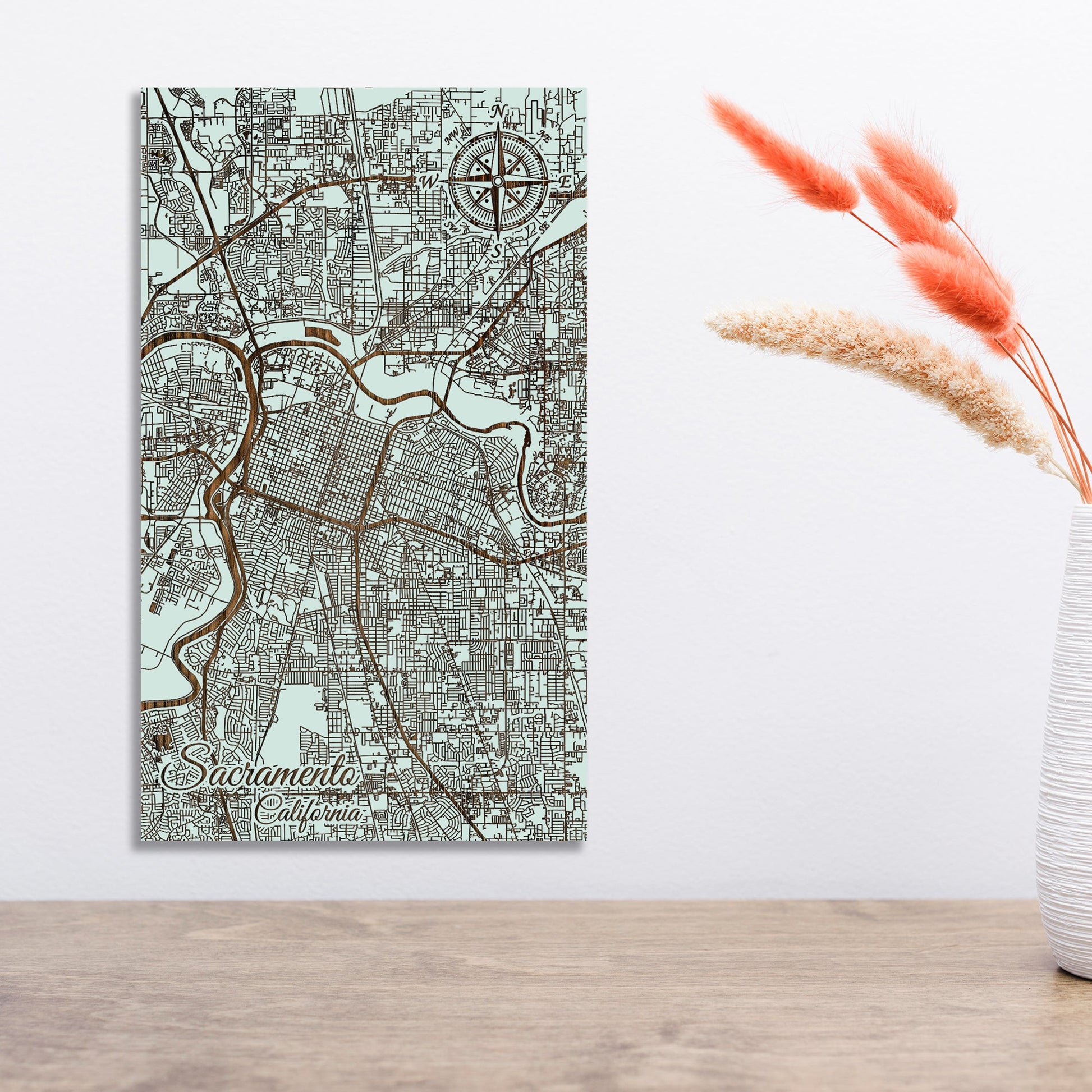 This Sacramento, California street map is made from high-quality pine wood and engraved to depict the city's streets and landmarks. Ideal for anyone who has a special connection to Sacramento or appreciates the city's history and culture.