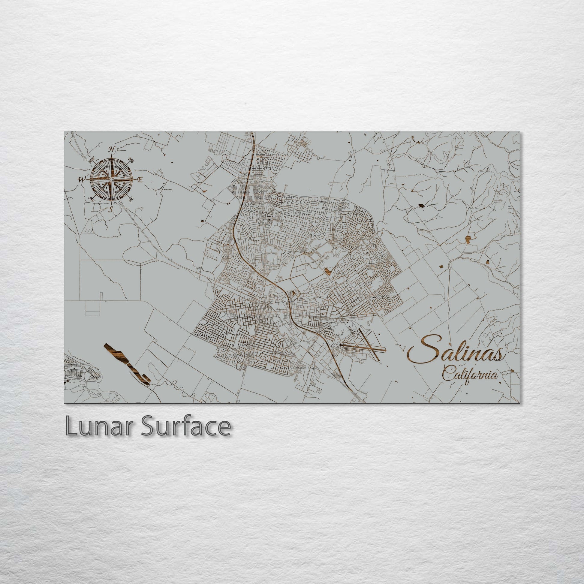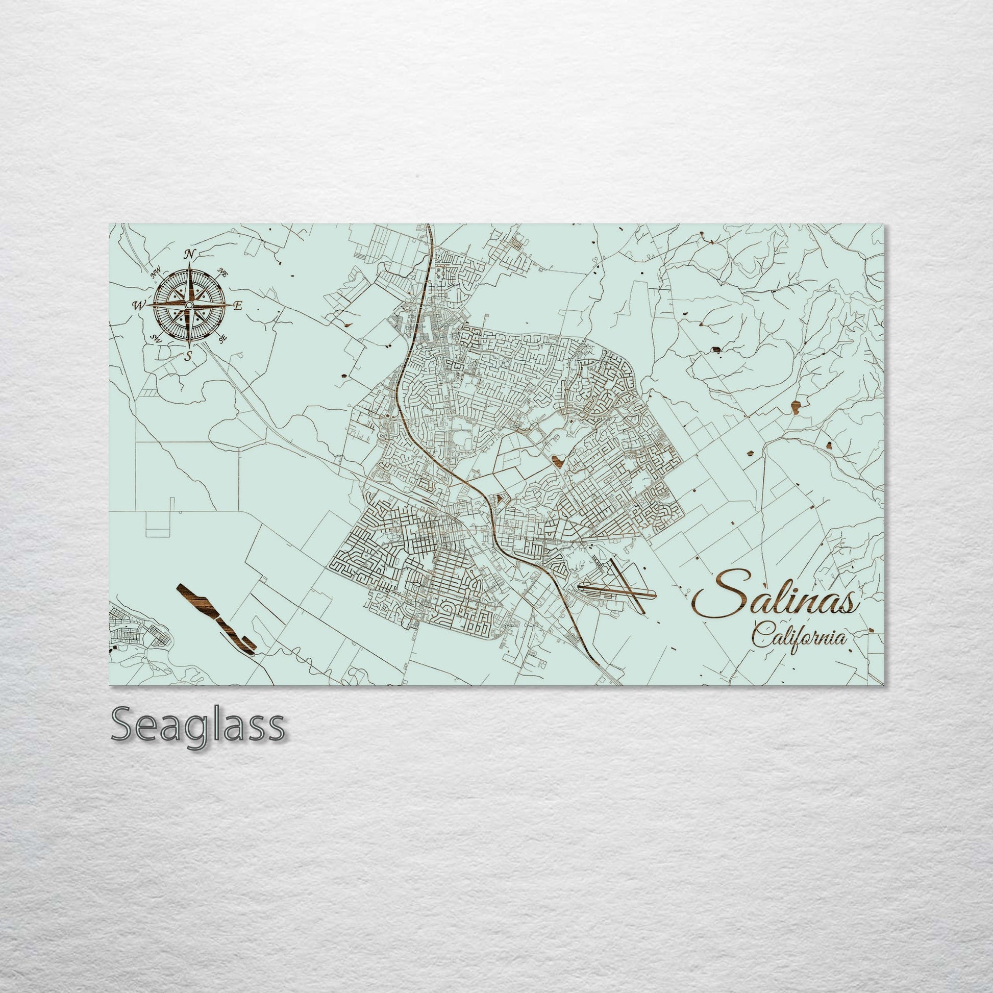 MADE IN USA: This wood-engraved street map of Salinas, California is designed and manufactured in the United States, making it a collectible of noteworthy quality.