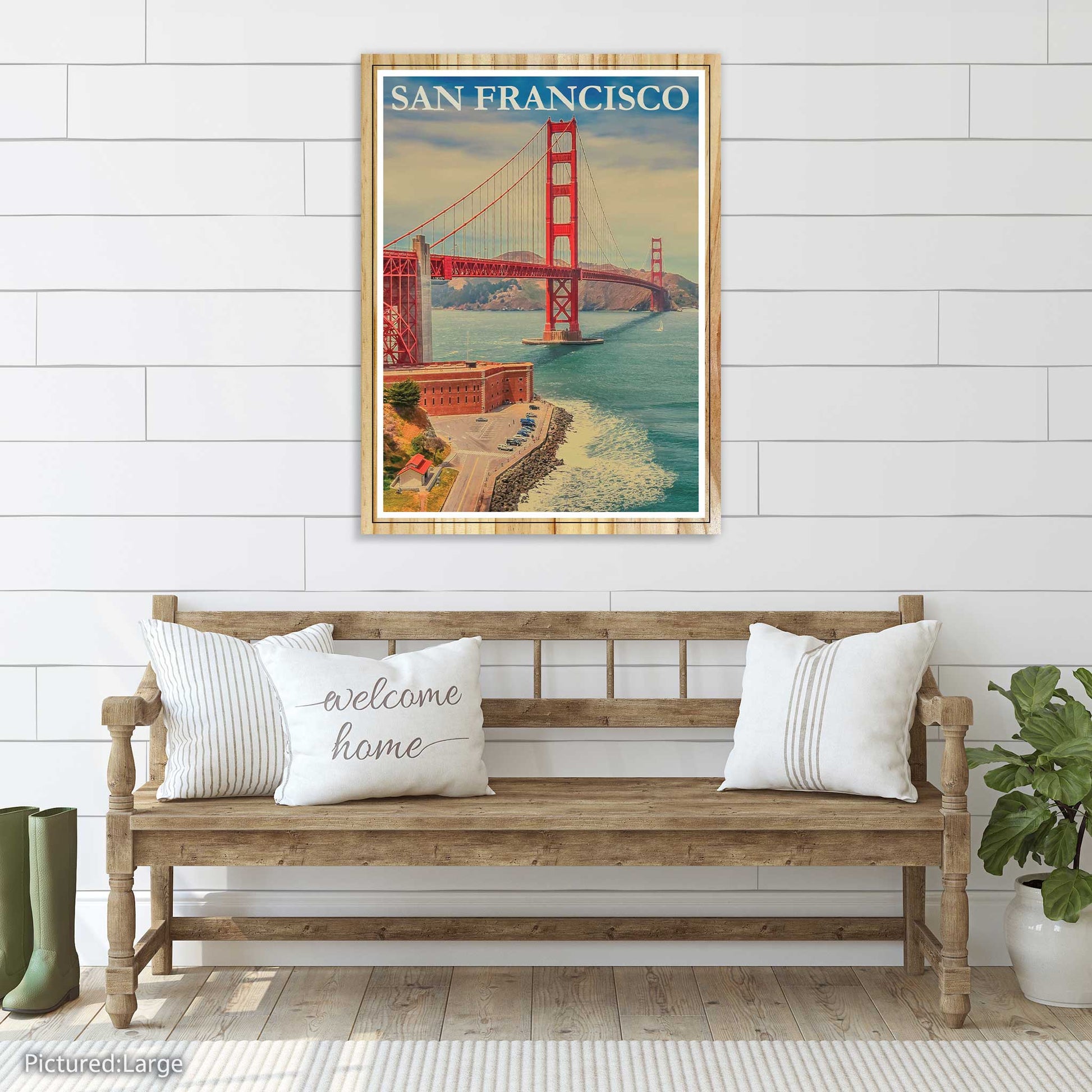 Make your decor stand out with the San Francisco travel poster, vintage-printed on durable pine wood. Choose between an elevated or flat print, perfect for adding an elegant touch to your home or office.