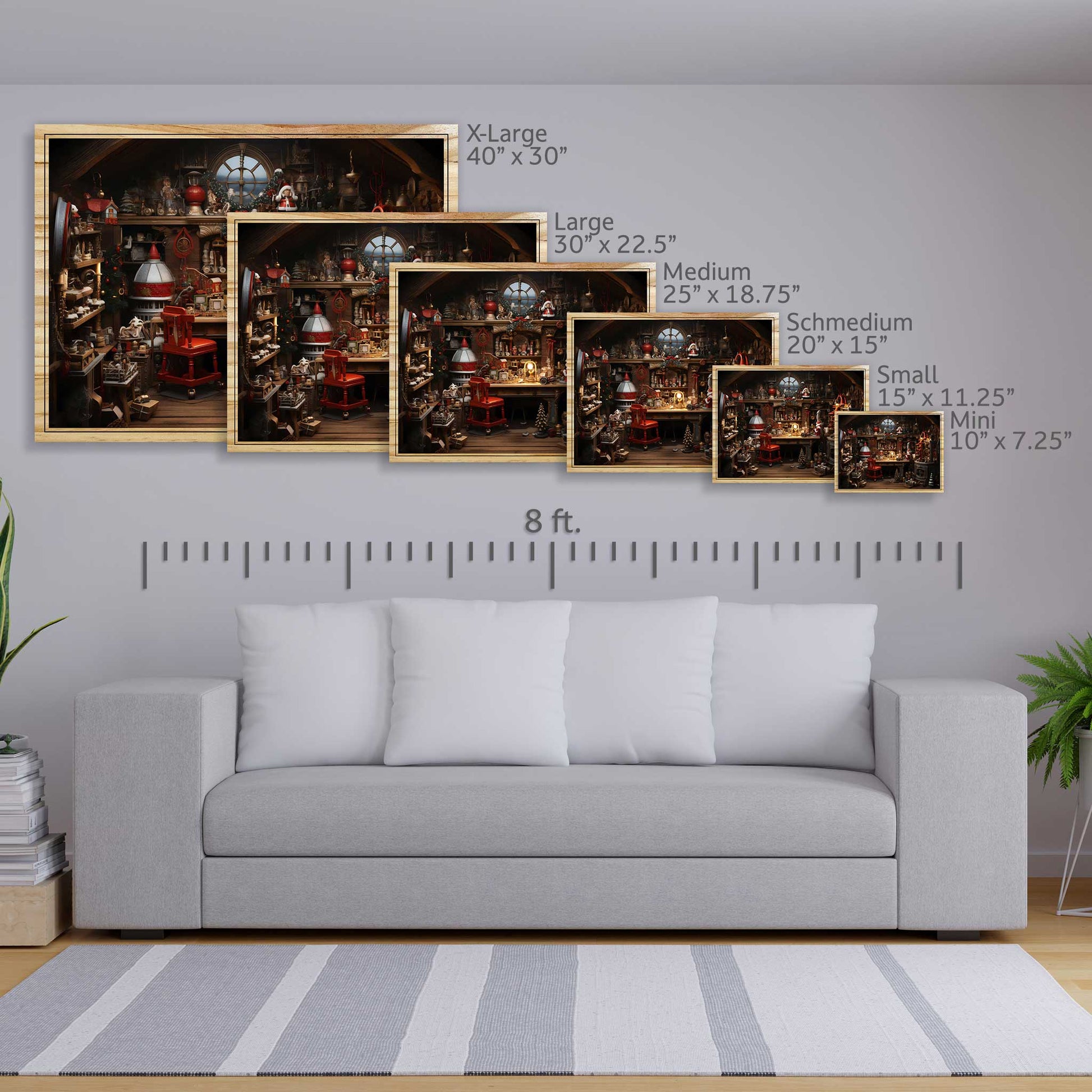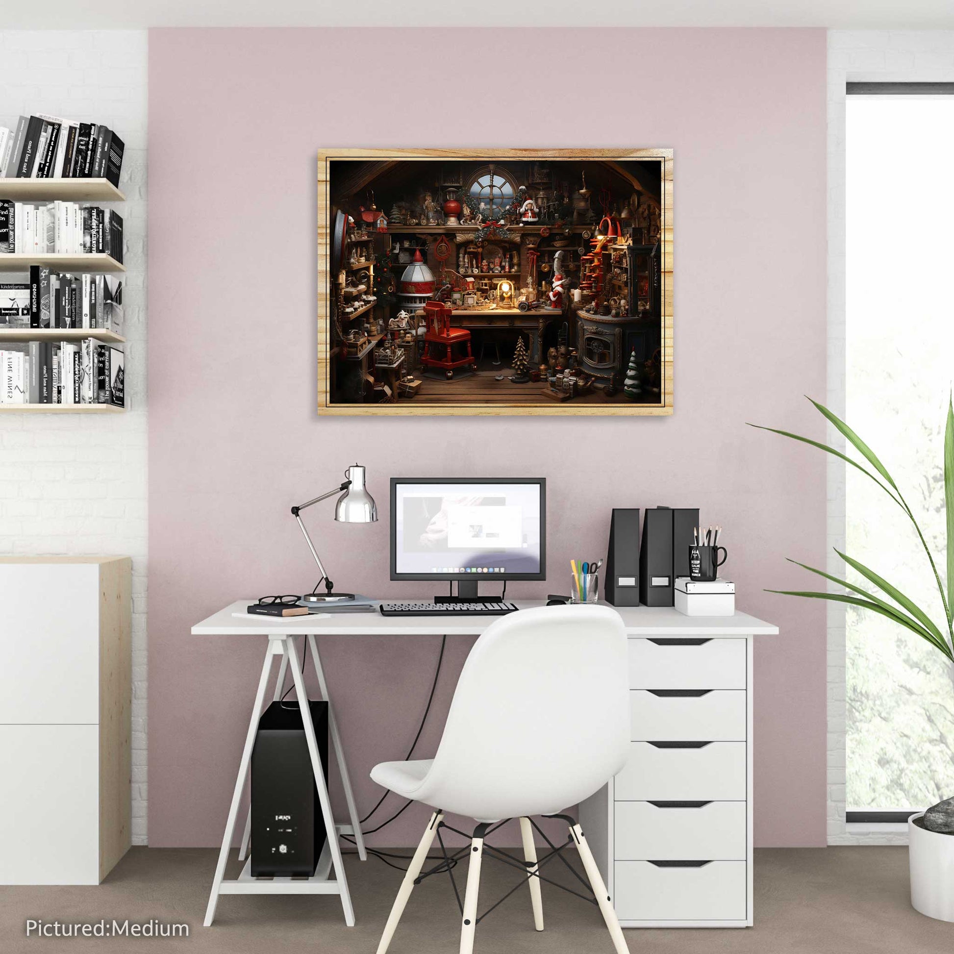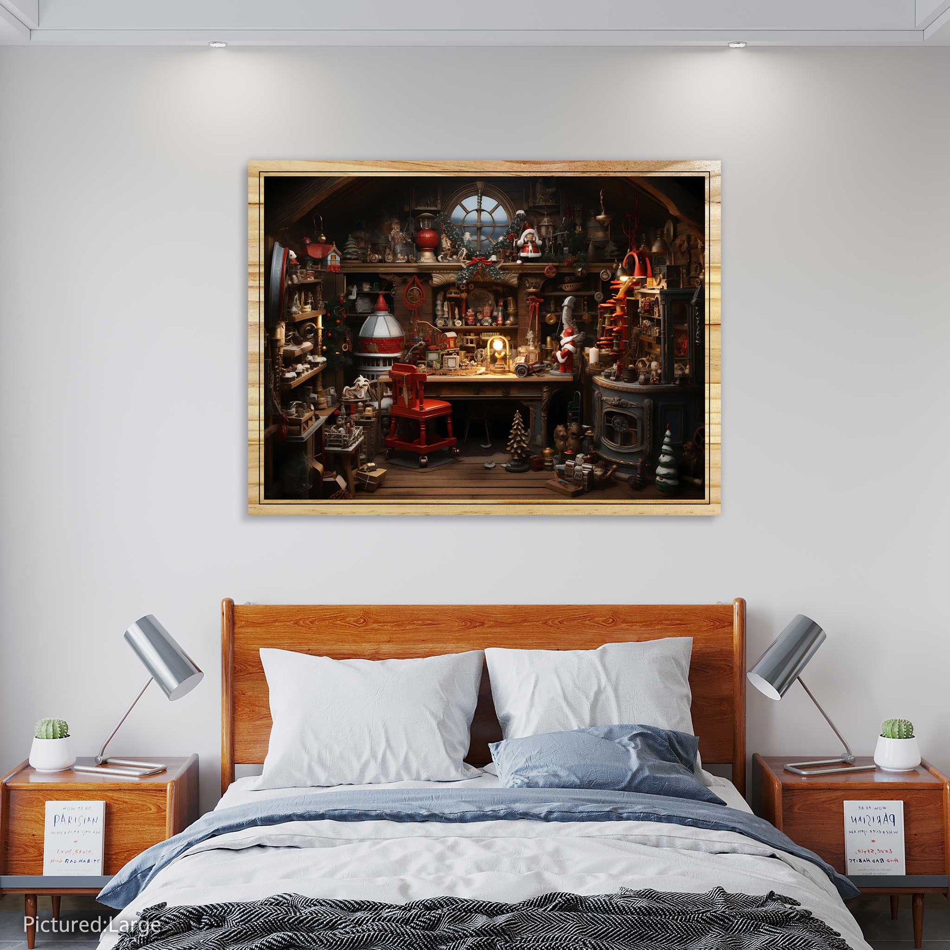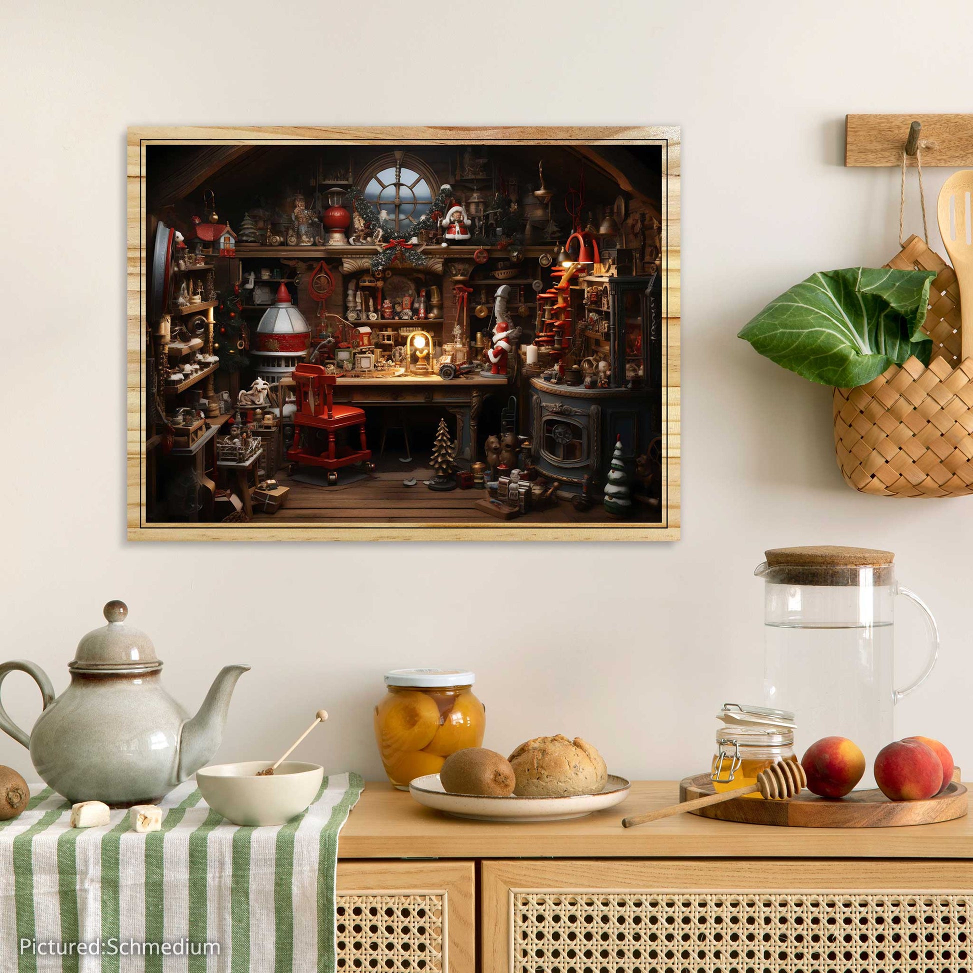 Enjoy the magic of Christmas with this print of Santa’s workshop. It’s printed on sturdy pine wood and has a wooden border. It has two alternatives: flat or elevated. The elevated alternative creates more depth and texture to the print, making it resemble a real workshop. This print is an exquisite product that will delight you with its elegance and style.