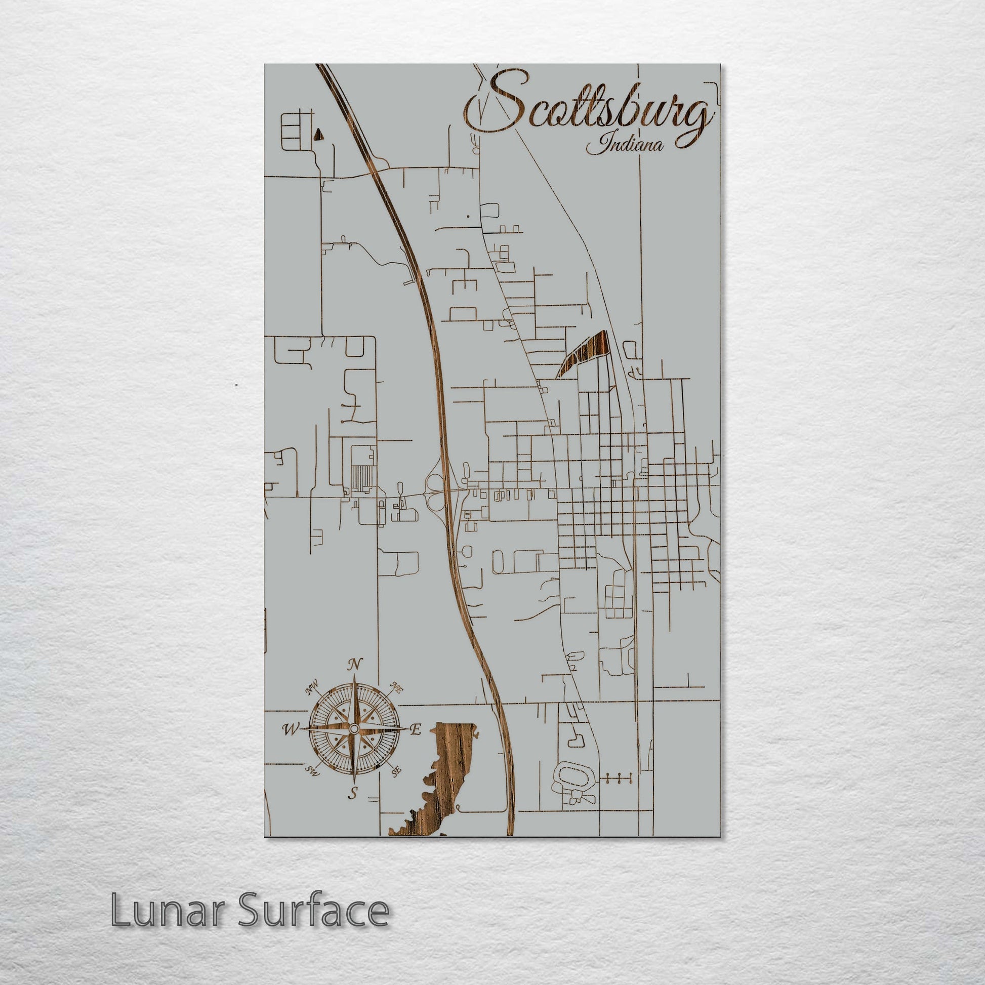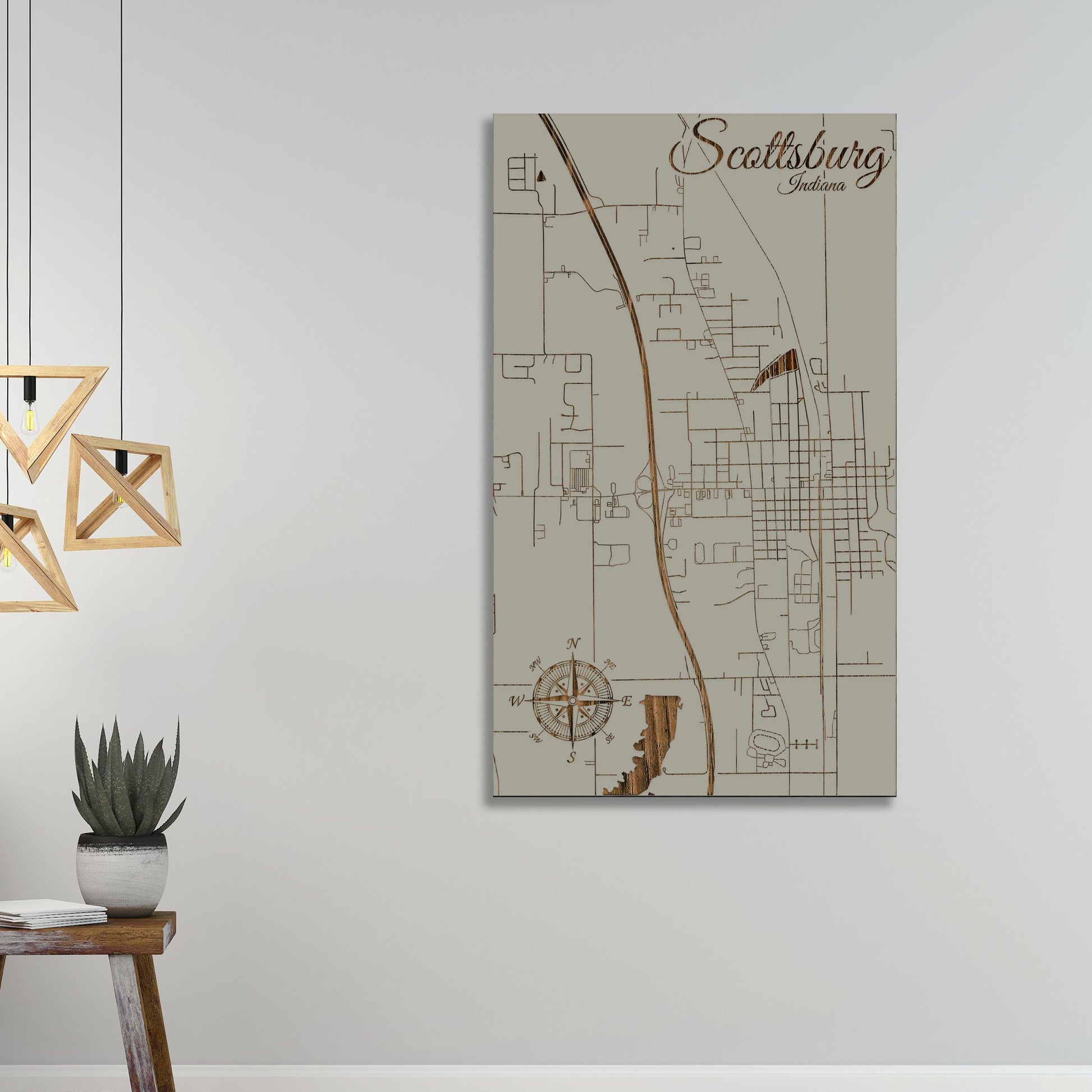 Scottsburg, Indiana Street Map: Exquisite Pine Wood Wall Art: Elevate your home decor with this wood-engraved wall art showcasing the intricate street layout of Scottsburg, Indiana. Made from premium pine wood, this piece captures the essence of Scottsburg with detailed engraving, providing a unique and artistic representation of the city. It’s a perfect piece for those with a connection to Scottsburg or a love for distinctive city maps.