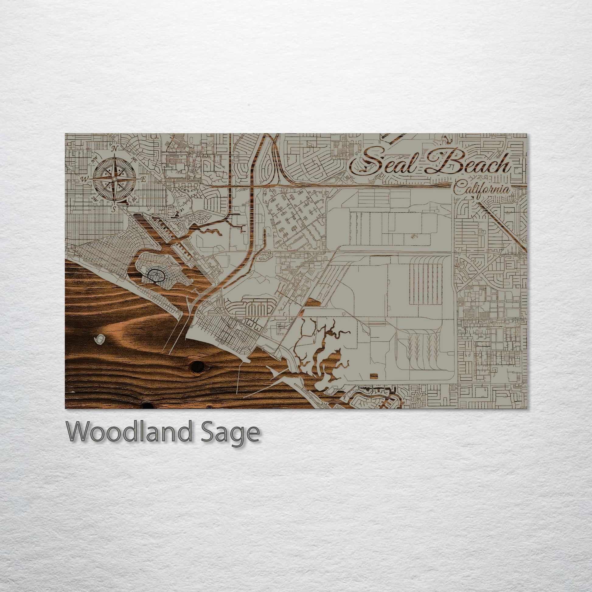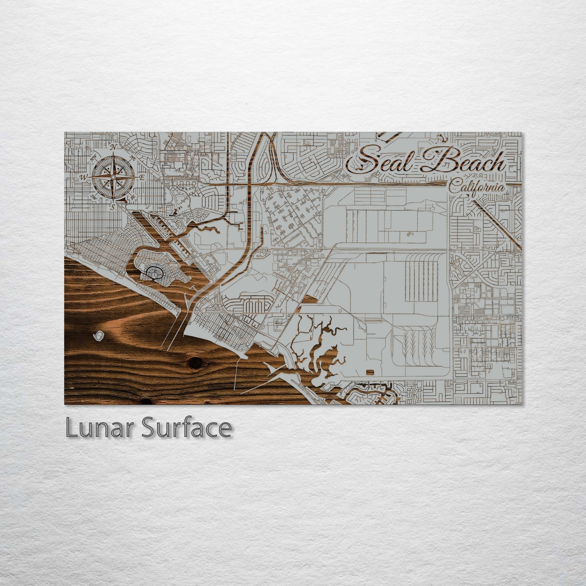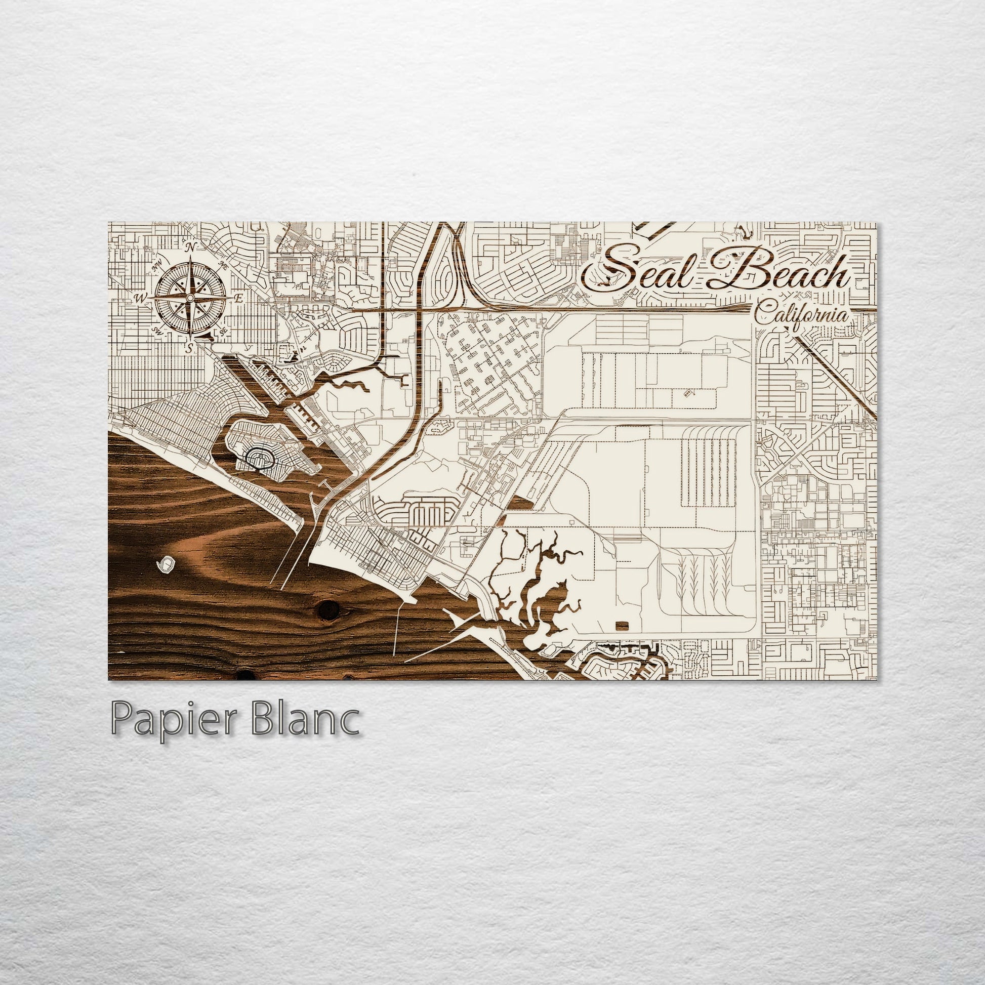 Presenting this Seal Beach, California street map, masterfully crafted through laser engraving on superior pine wood. This piece showcases the streets of Seal Beach with exquisite detail, making it a unique addition to any collection. It is especially appealing for those with a keen interest in geography and artistic representations of city layouts.