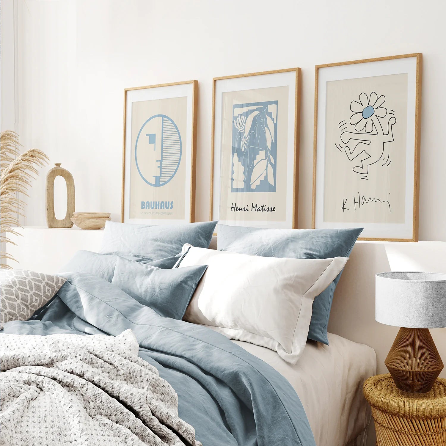 Enhance your living space with this stunning 3 piece wall art set featuring the iconic works of Henri Matisse and Bauhaus. With a unique mix of abstract cut-outs, pastel blue hues, and neutral tones, these framed prints will add a pop of color to any room in your home. Perfect as a gift or for your own bedroom or living room decor.