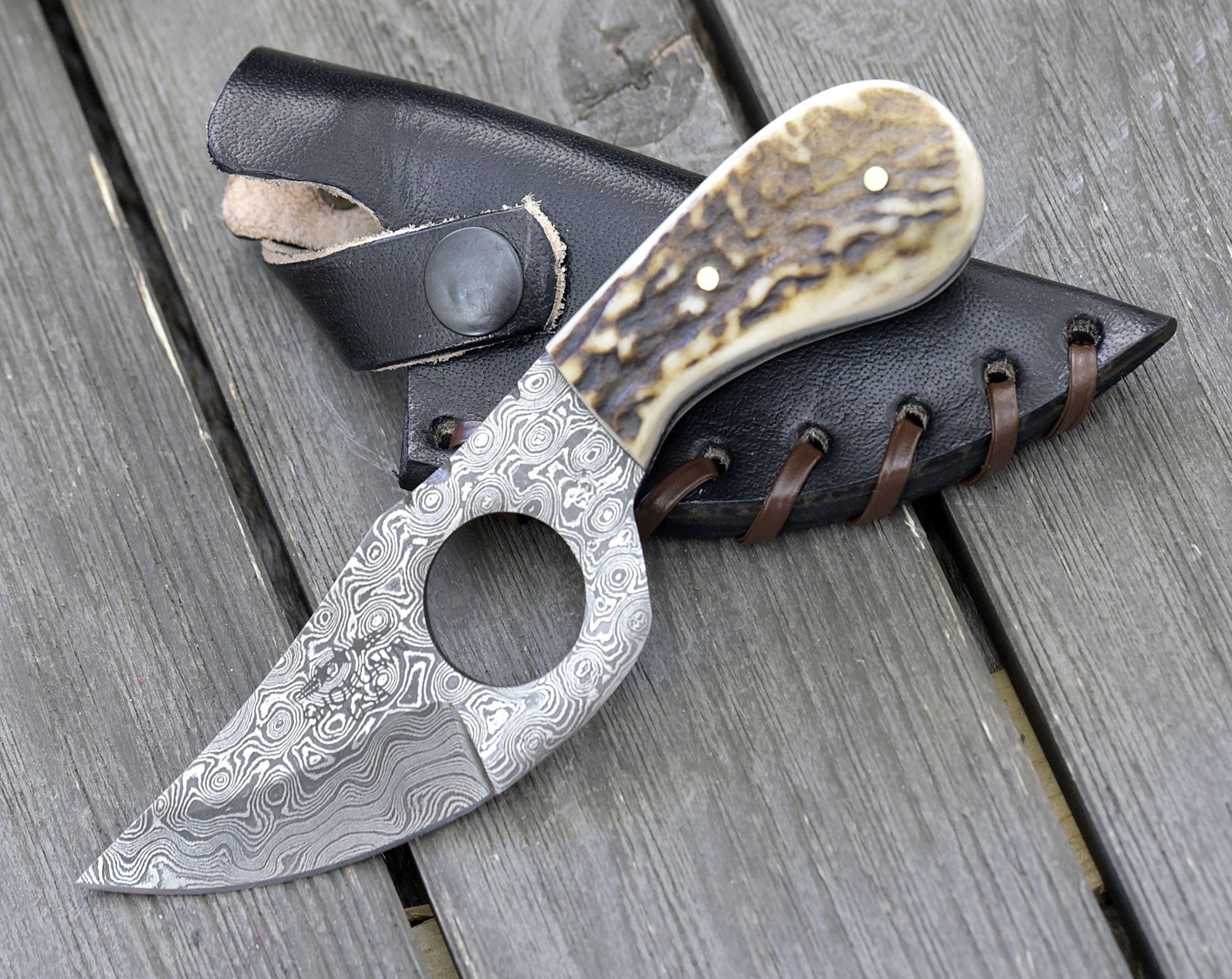 Damascus Skinning Knife, Damascus Knife 6" OA, 3" Blade , Staghorn Handle with Leather Sheath