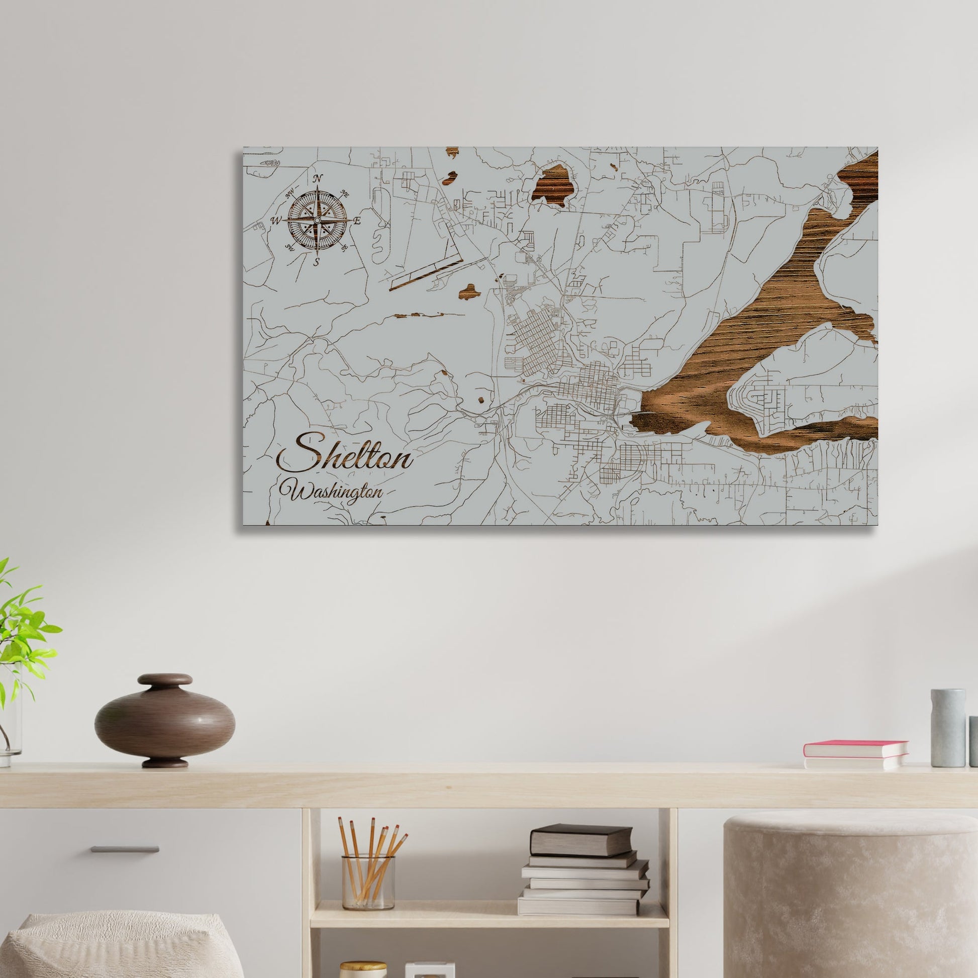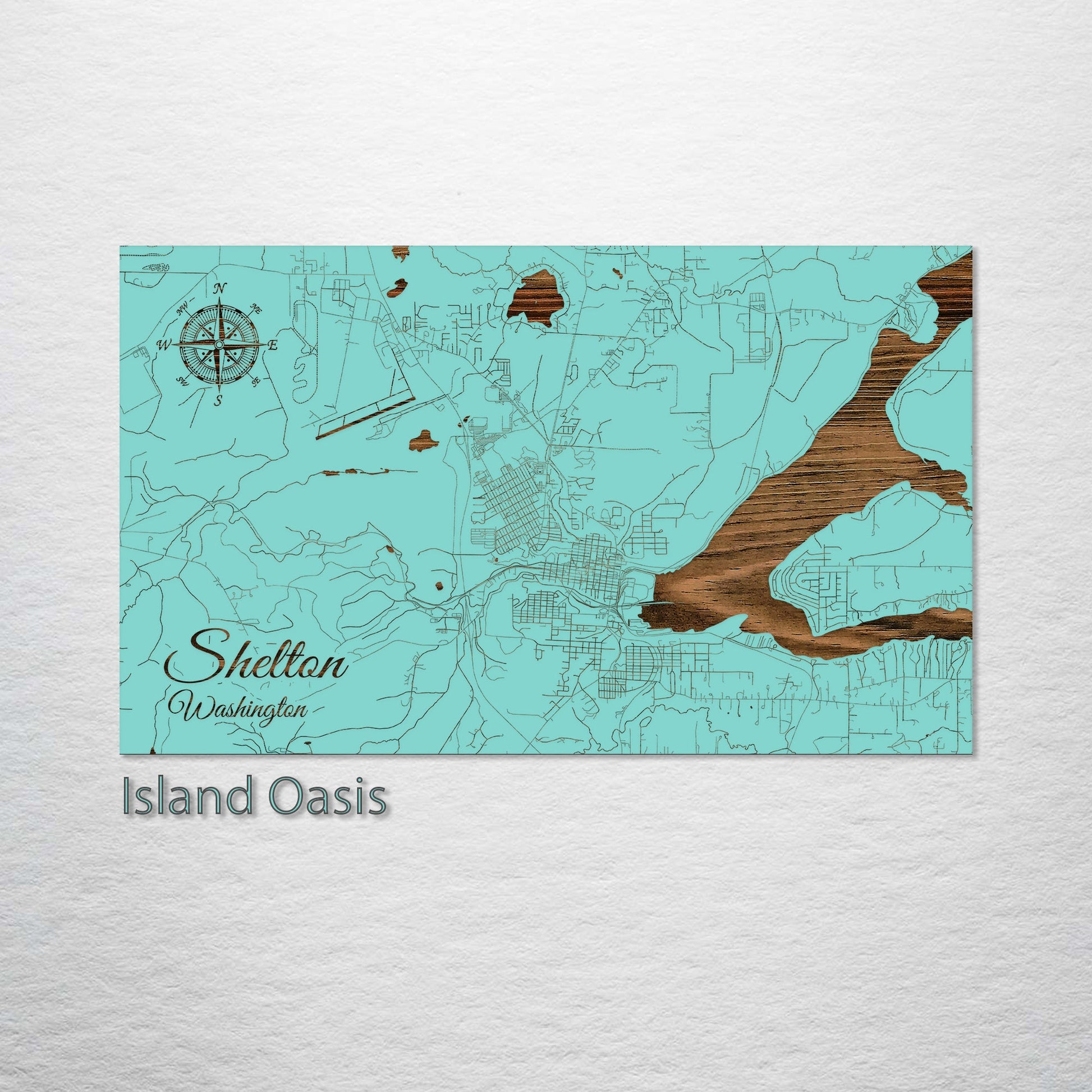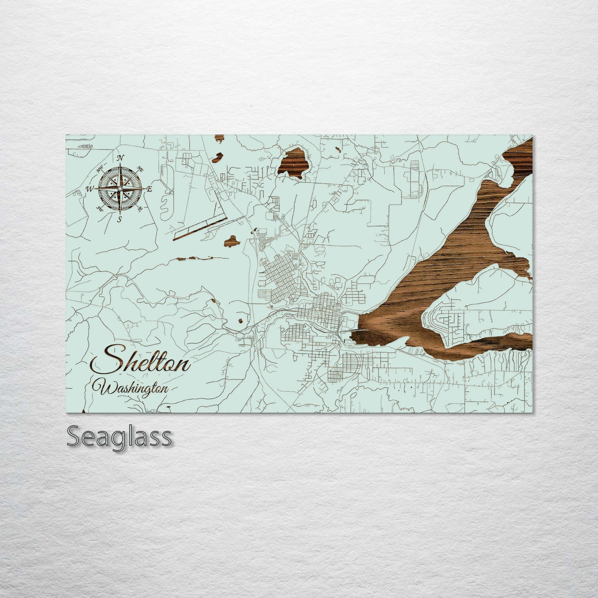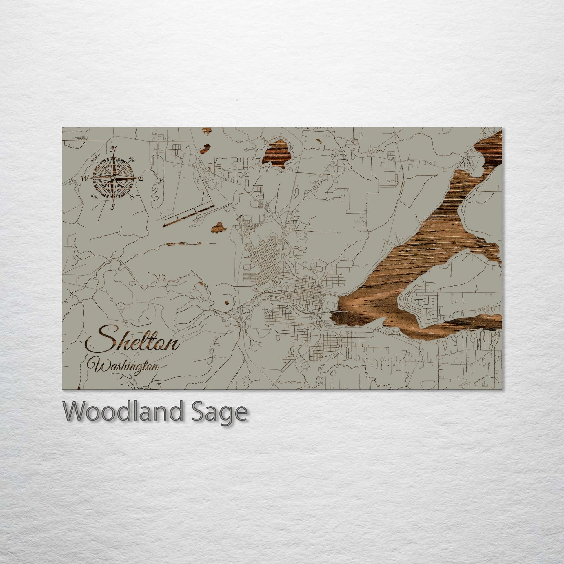 This is a street map of Shelton, WA designed by Fire & Pine artists.