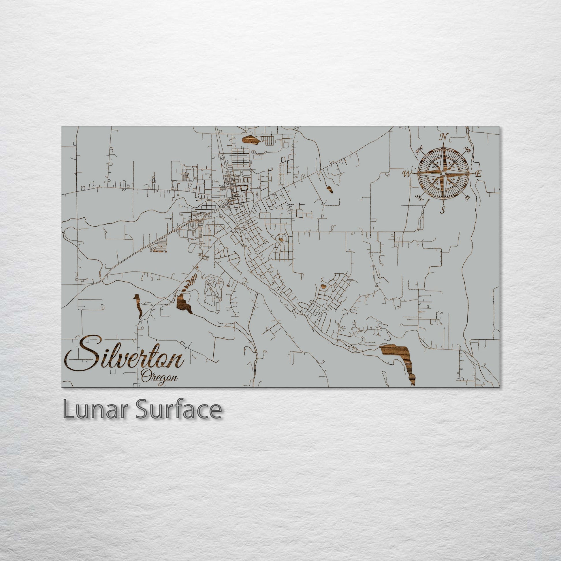 This is a street map of Silverton, OR designed by Fire & Pine artists.