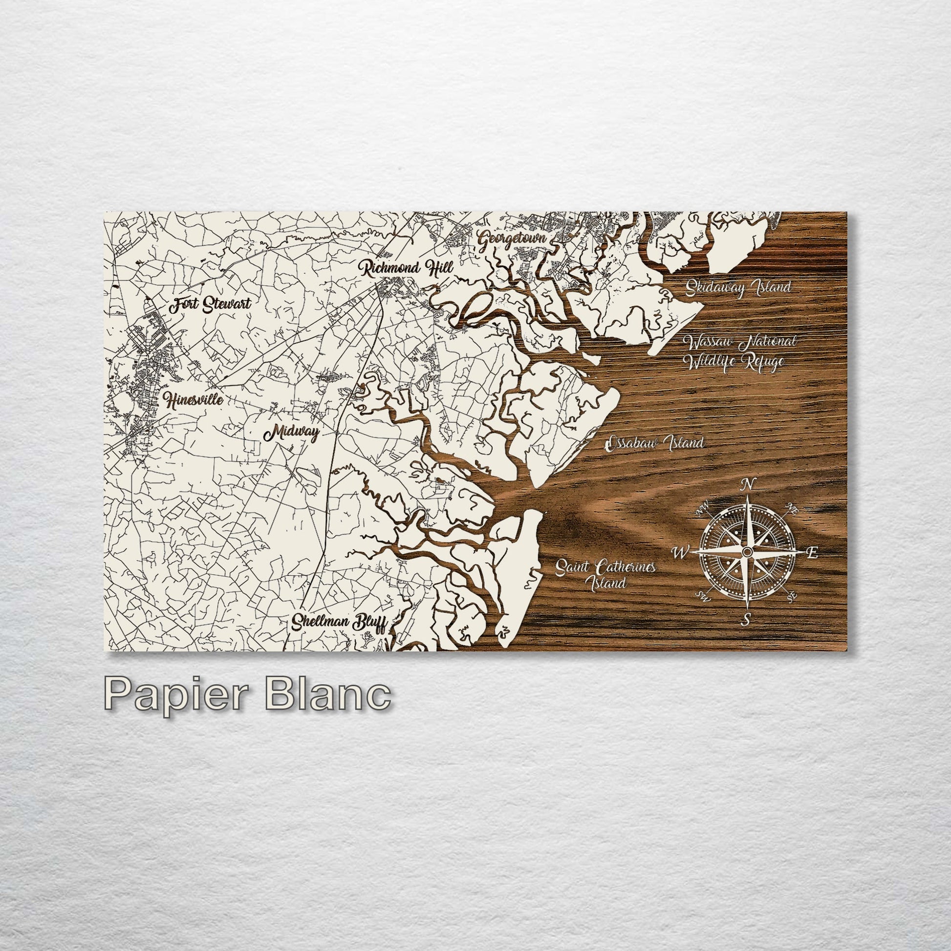This wood-engraved wall art of Skidaway to Saint Catherines Island, Georgia whimsical map is a unique and exceptional addition to any collector’s lineup. Crafted from high-quality pine wood, the intricate details of the whimsical map are brought to life, making it a standout piece. It’s an ideal gift for anyone interested in geography, architecture, or history.