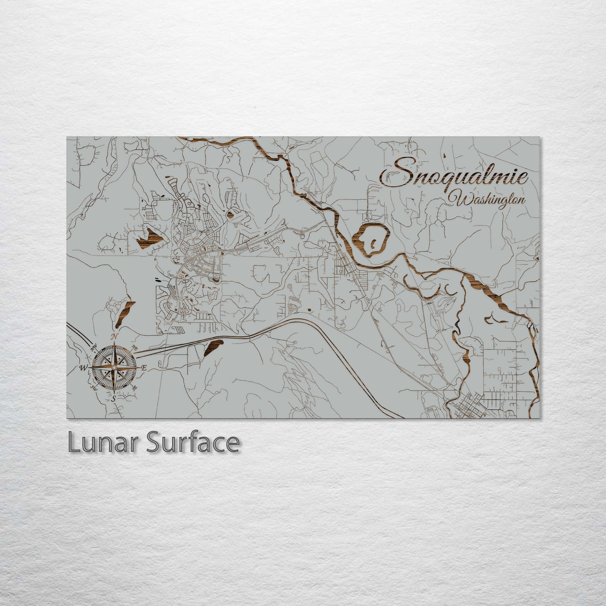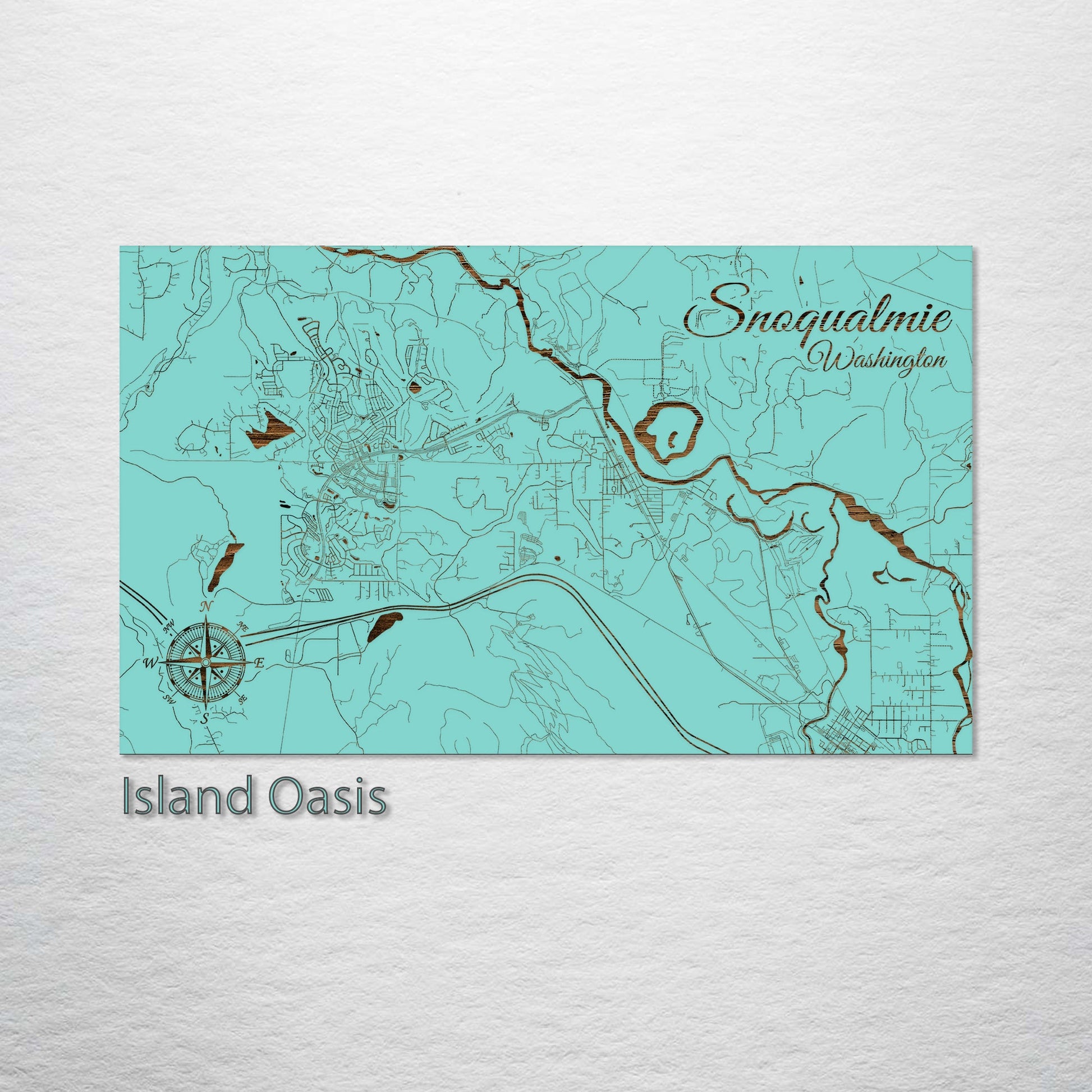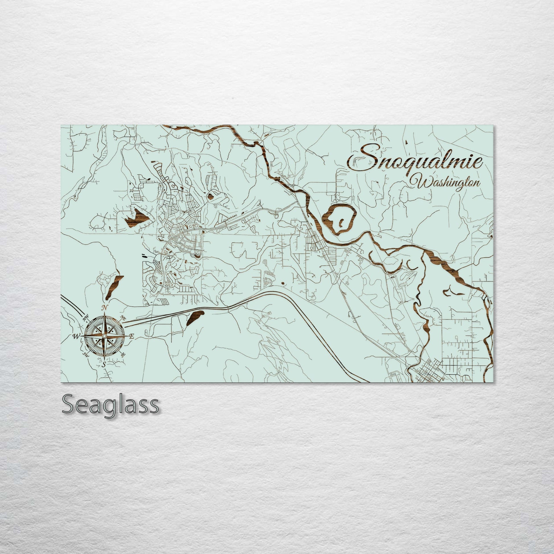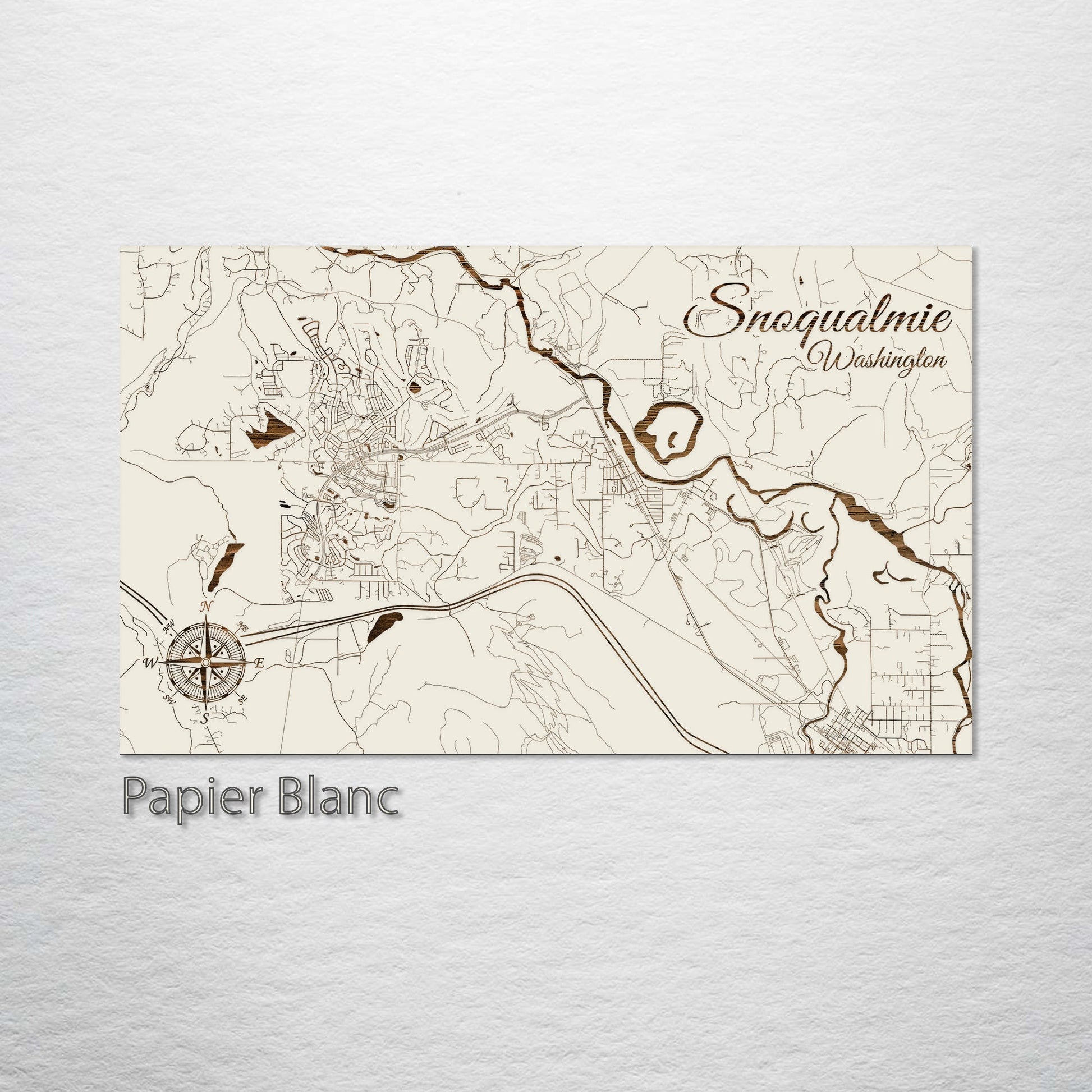 This is a street map of Snoqualmie, WA designed by Fire & Pine artists.
