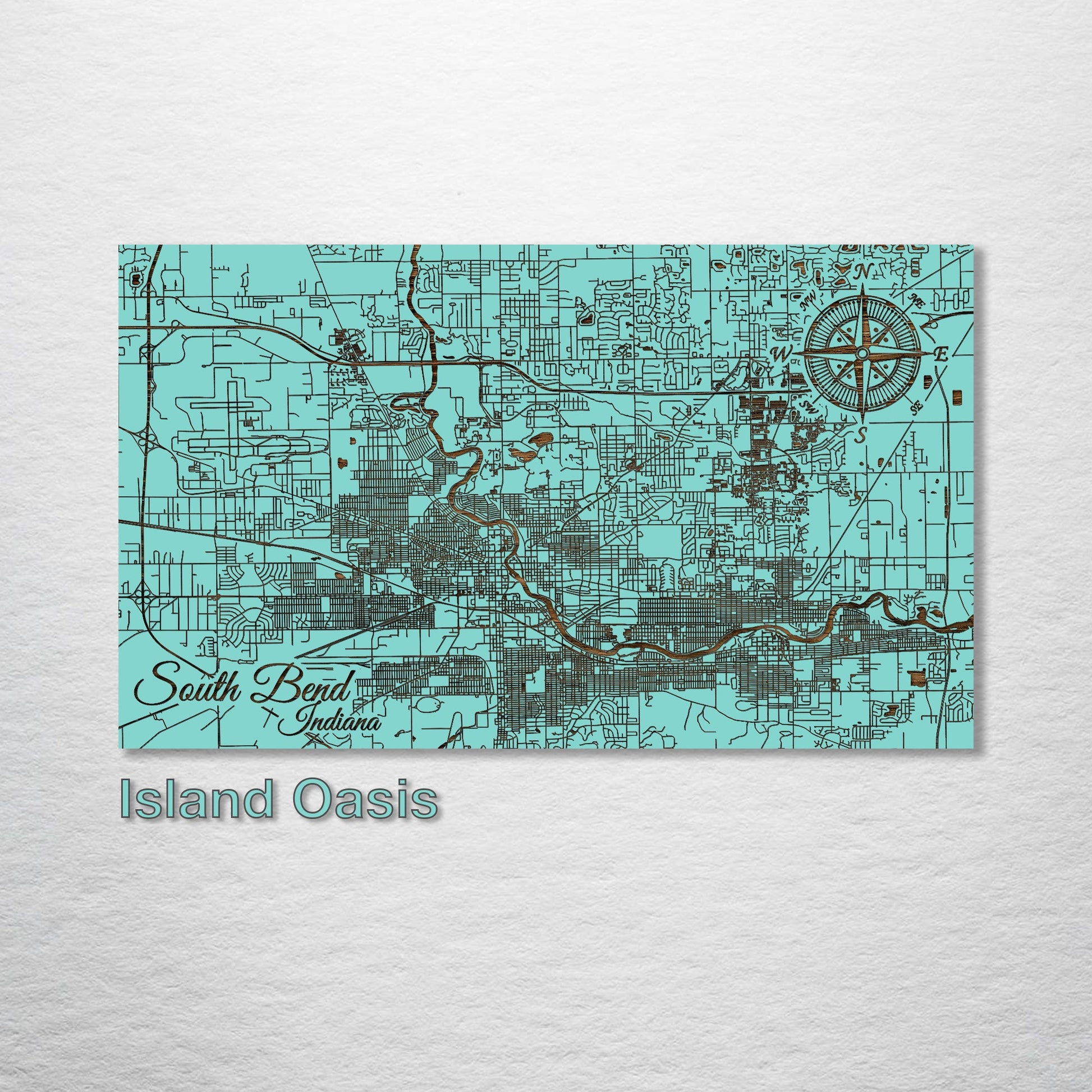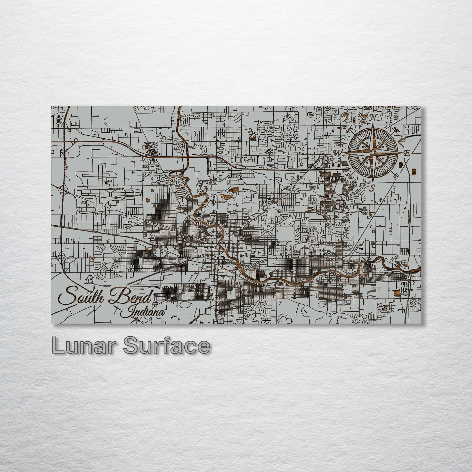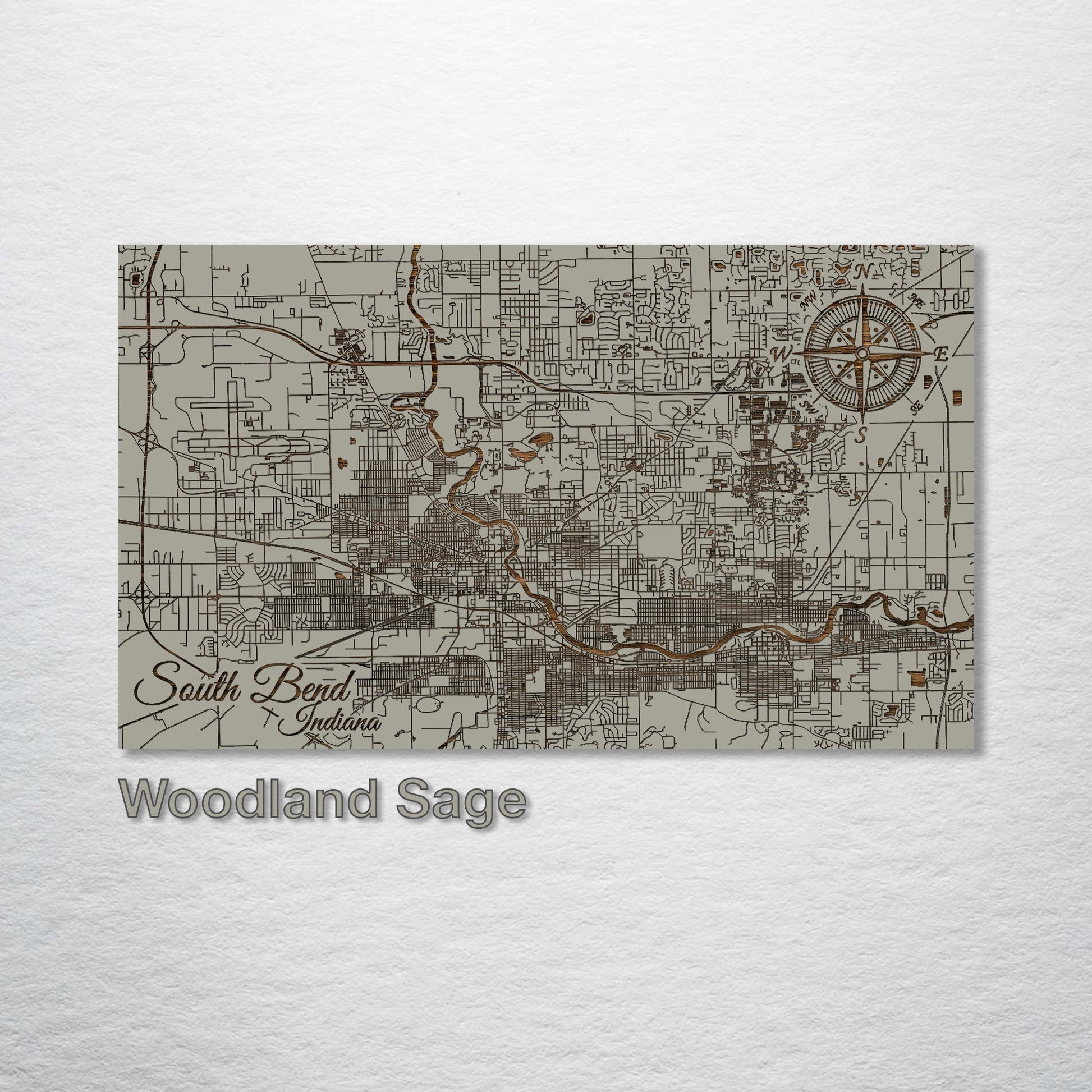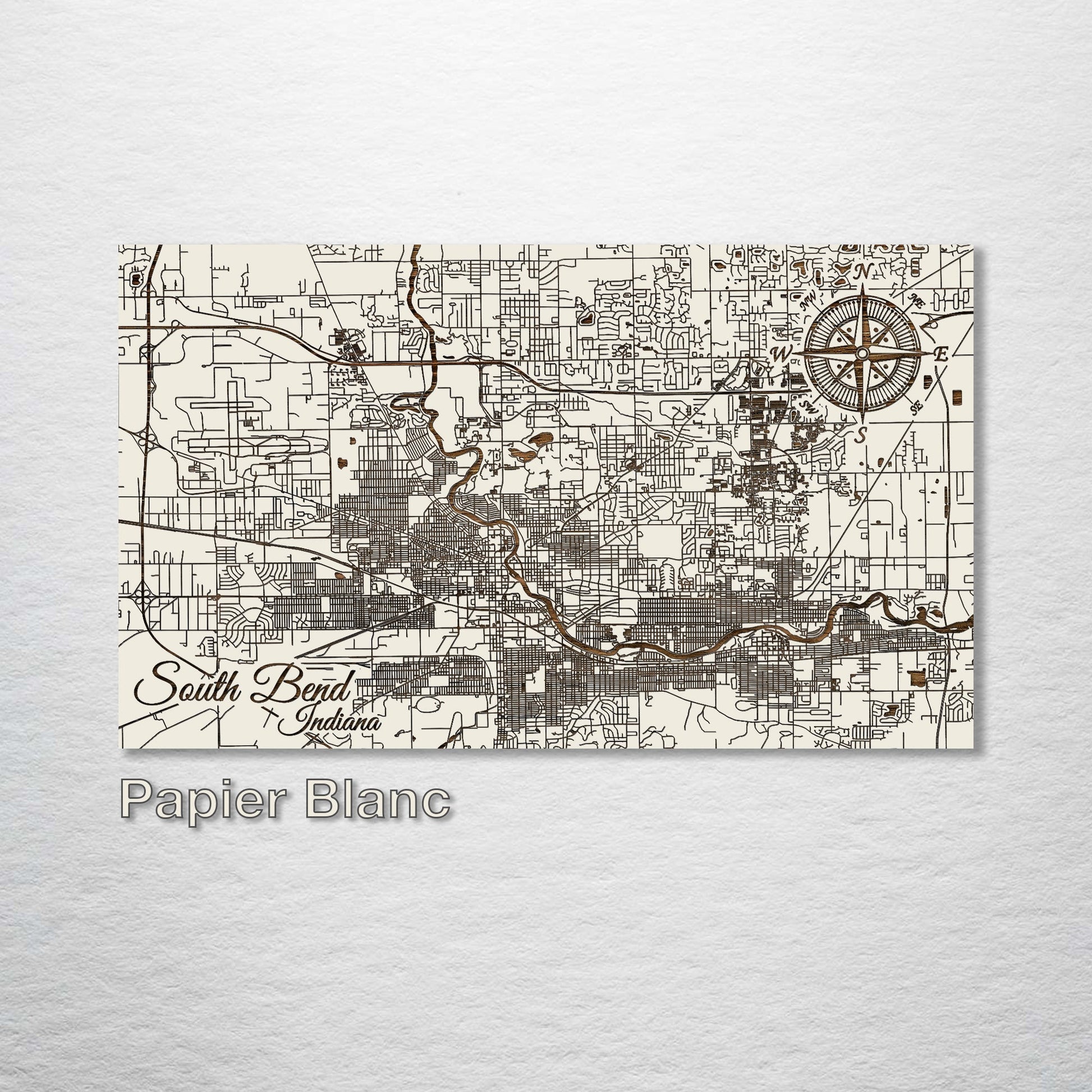 Unique gift for cartography enthusiasts: Discover the detailed streets and avenues of South Bend, Indiana with this meticulously wood-engraved representation. Made from premium pine wood, every aspect of South Bend is depicted with clarity, creating a piece that will captivate both locals and those with an appreciation for intricate city diagrams.
