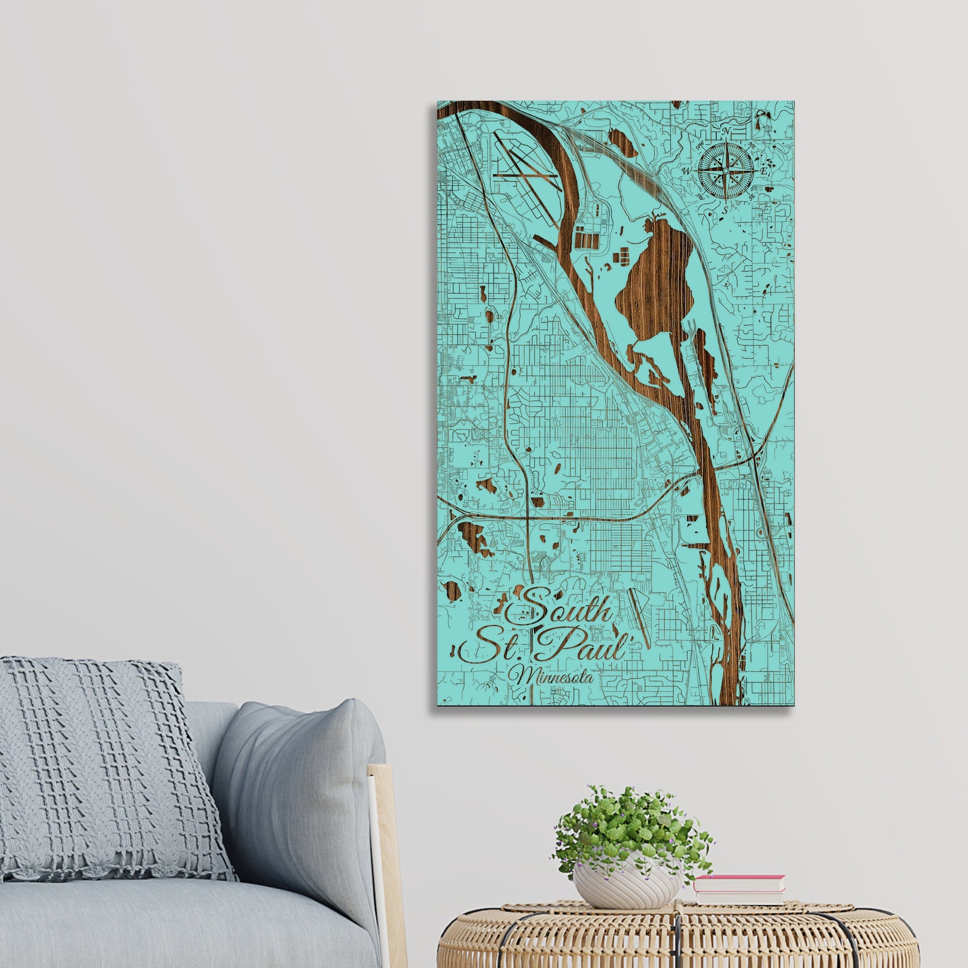 This is a street map of South St. Paul, MN designed by Fire & Pine artists.