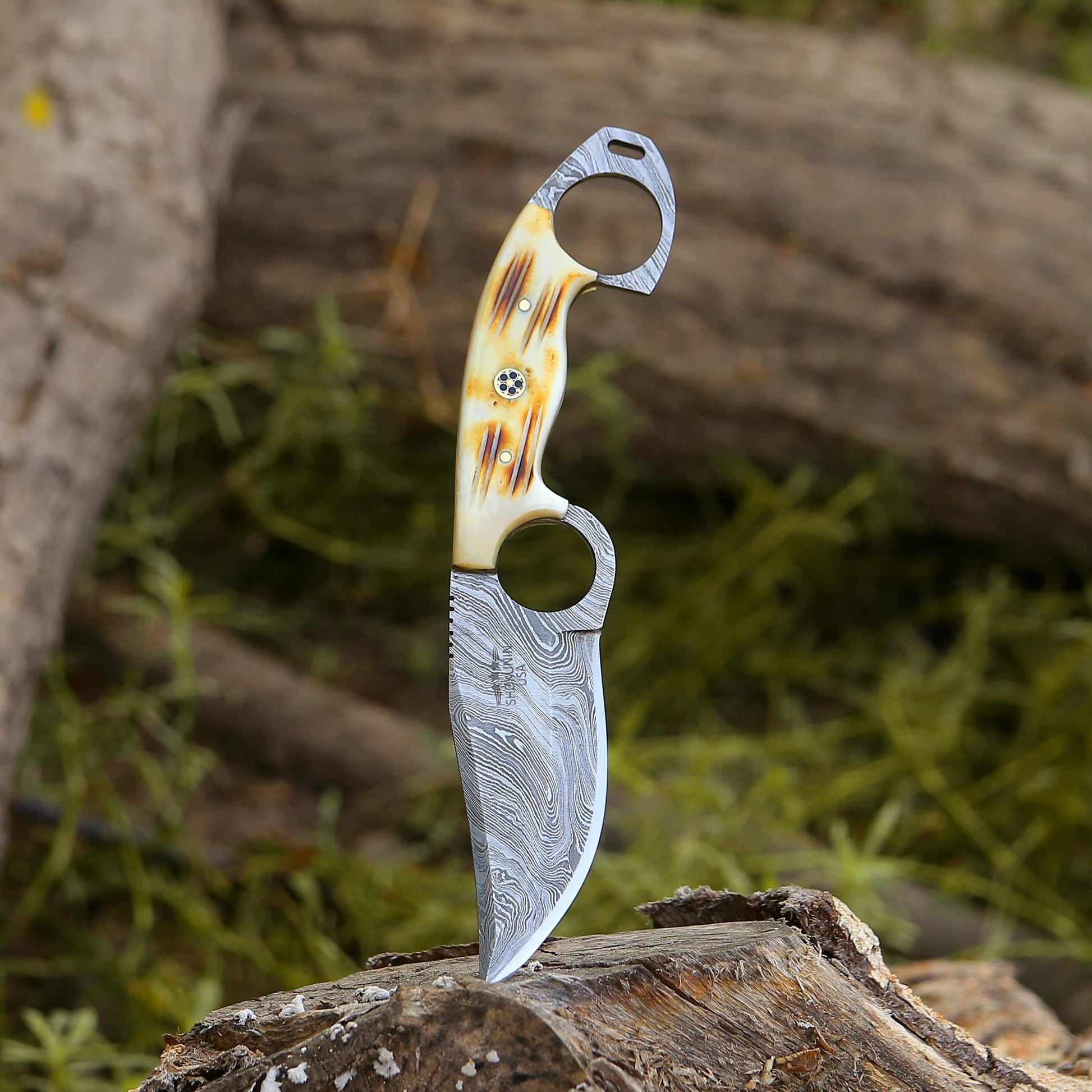 Spark Damascus Hunting Knife, 9.0” Overall, 325 Layers Damascus Steel Trailing Point Blade, Charred Bone Handle, Hand Forged Fixed Blade, Full Tang, Hand Stitched Leather Sheath, Pro Knife Sharpening & Personalized
