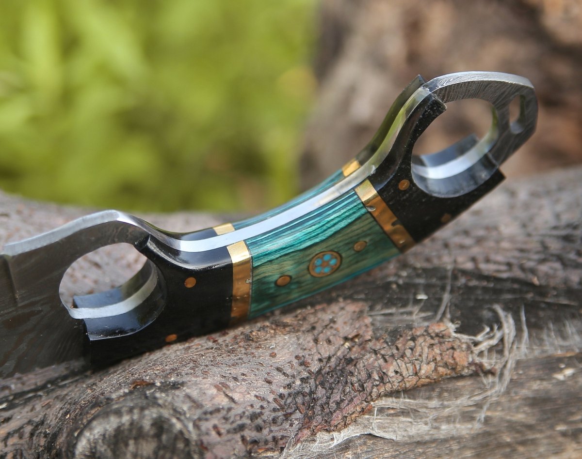 Materials: Hand forged damascus steel blade 300 layers, Brass inserts and brass mosaic pin, Hand stitched leather sheath, Free pro sharpening prior to shipping, free customized engraving, Micarta and diamond wood handle.
