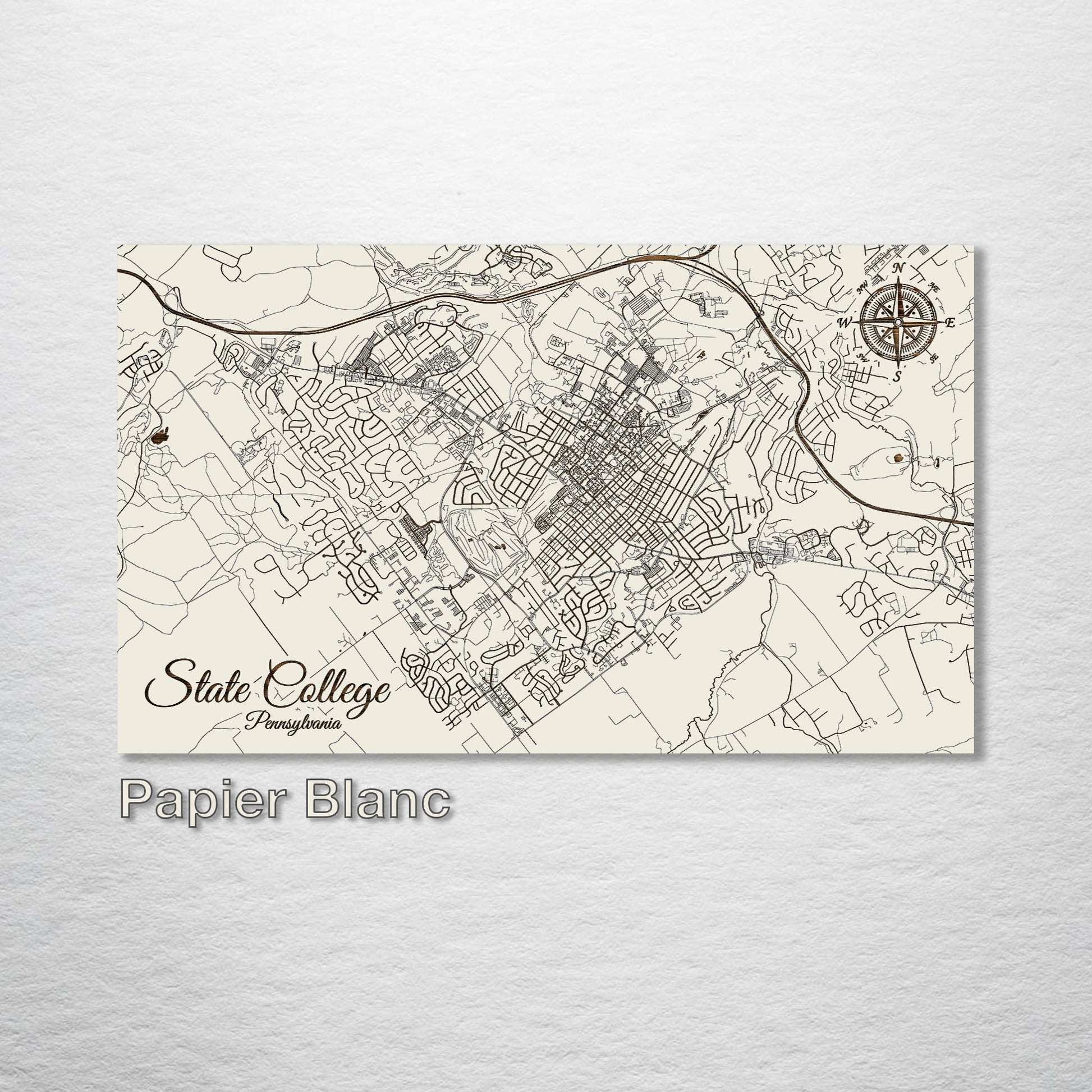 Unique Gift for Map Lovers and State College Admirers: Elevate any collection with our wood-engraved State College, Pennsylvania Street Map. This exceptional wall art, meticulously crafted from premium pine wood, showcases the intricate street layout of State College with unparalleled detail. It's an ideal choice for those fascinated by cartography or anyone with a special connection to State College.