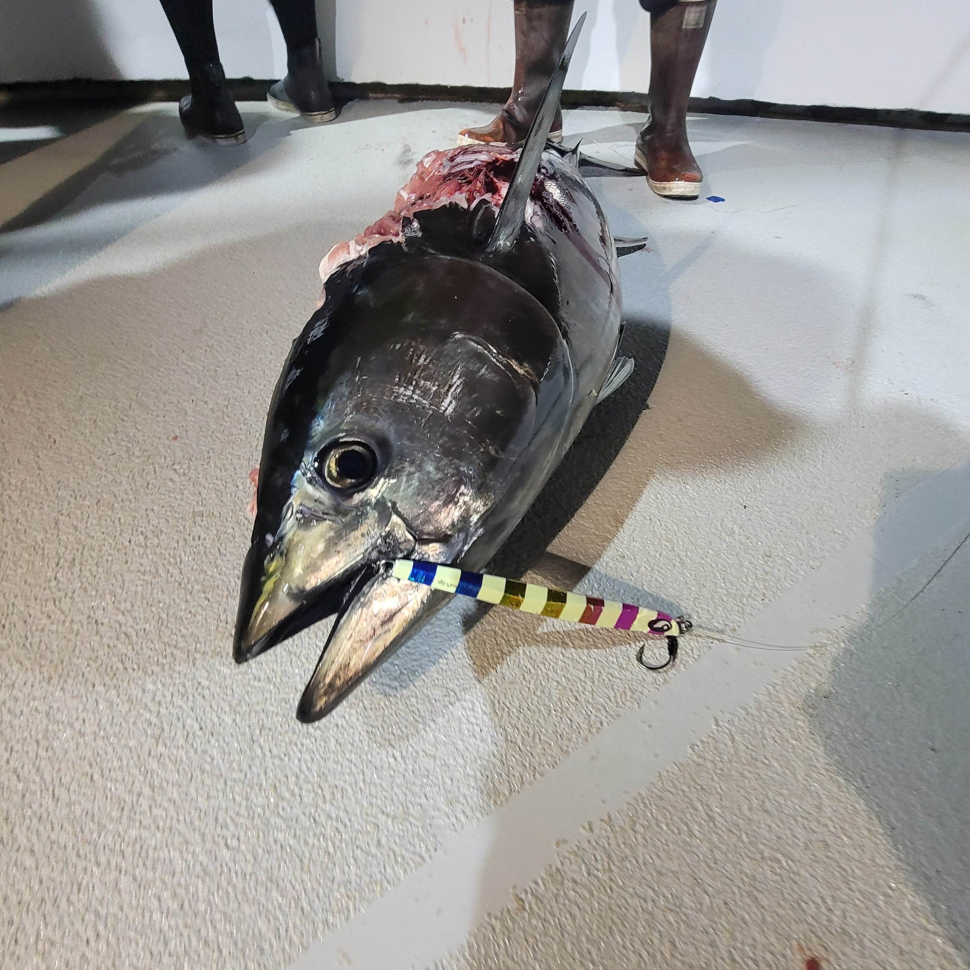 Once it's in the zone, its asymmetrical body kicks and rolls like a panicked baitfish. Big tuna, tilefish, grouper, and deep-dwelling rockfish don’t just see it—they react to it.