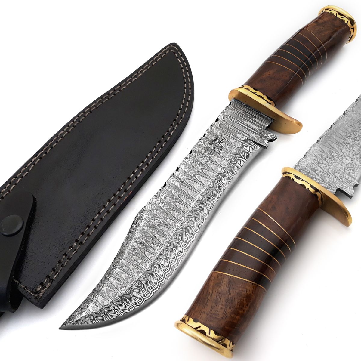 Surge Handmade Custom Damascus Bowie Knife with Sheath - 13.0" Overall with Highly Figured Exotic Rose Wood Handle, Hand Stitched Leather Sheath, Pro Knife Sharpening & Personalized.
