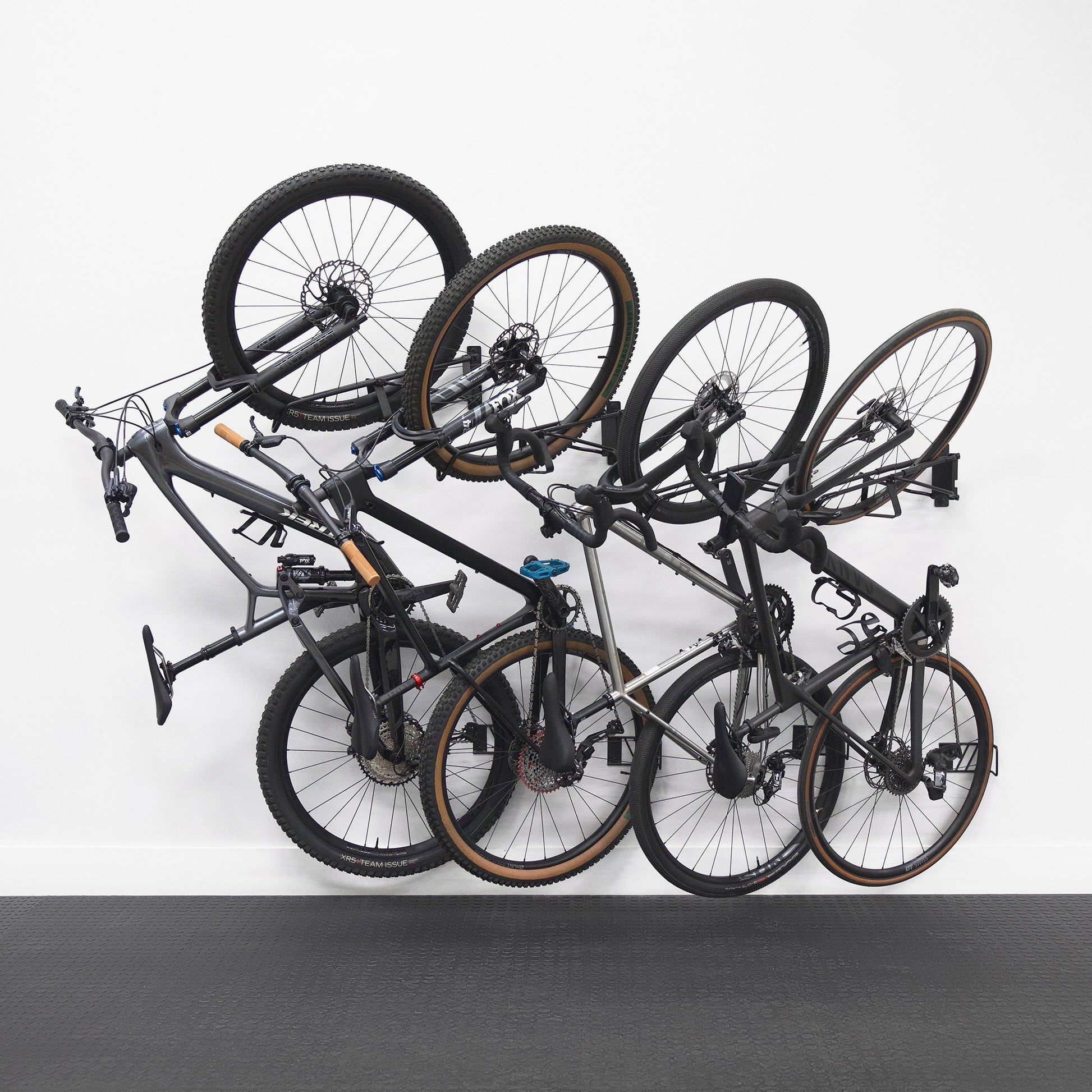 - No-lift swivel mount bike storage rack for four road and gravel bikes