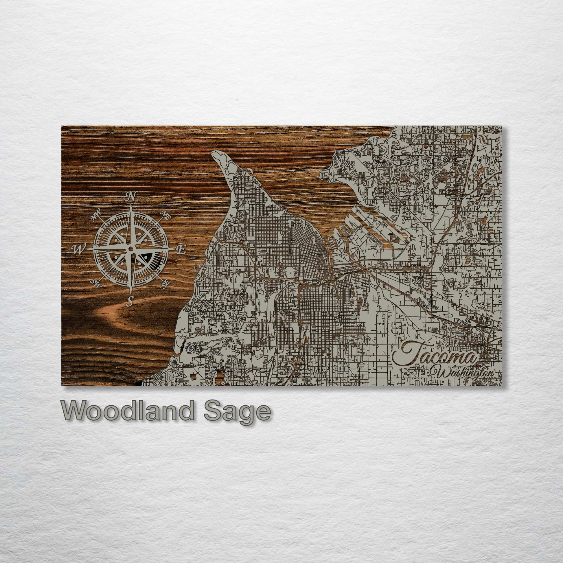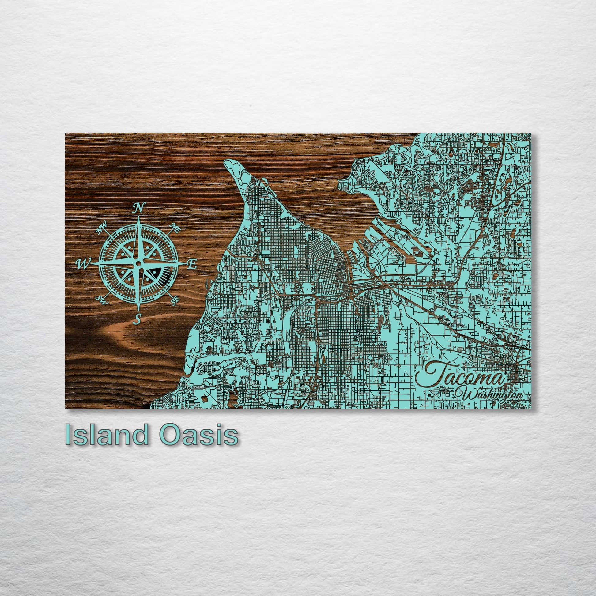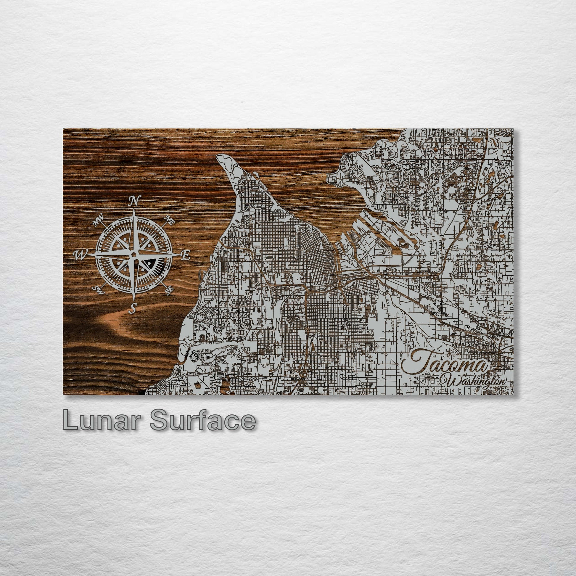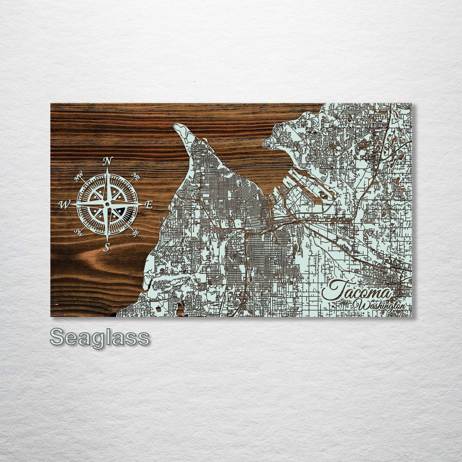 This Tacoma, Washington street map is made from pine wood. The map features the streets, waterways, and landmarks of Tacoma, all accurately engraved.