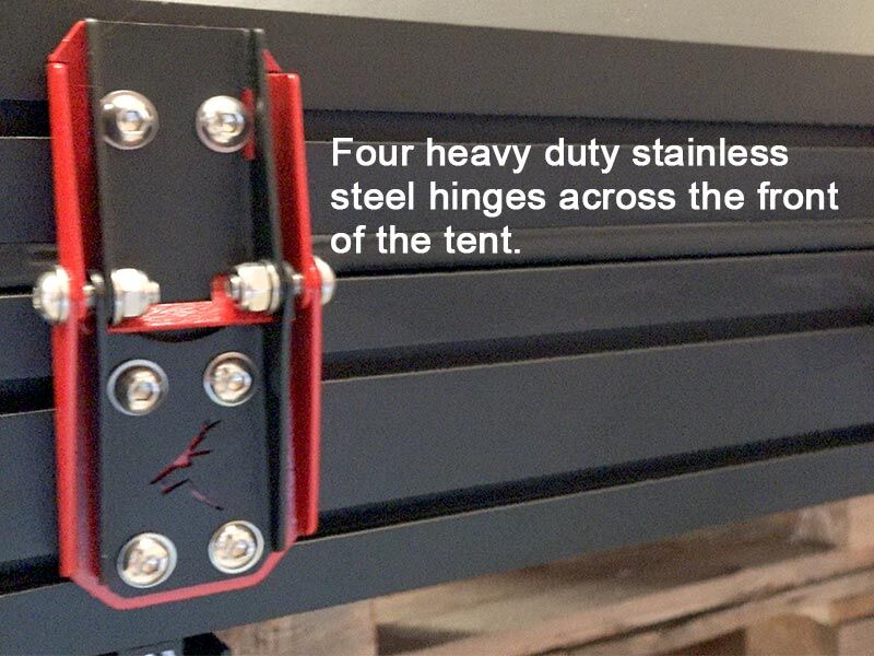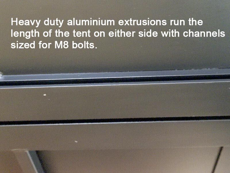 - Two heavy duty 20mm (0.08" high) aluminum extruded foot rails underneath tent with M8 slots on sides and base for easy mounting, set 1050mm / 41.34" apart center to centers joined by multiple 25mm thick sections of welded box tubing for additional strength and floor support.