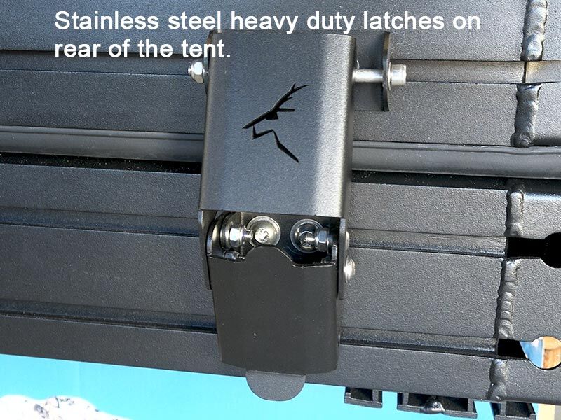 Industry leading features include an extruded and welded aluminum alloy frame, a large rainfly at sides and rear, full length roof mounting rails, plus the convenience of setting up/packing down in under 90 seconds,