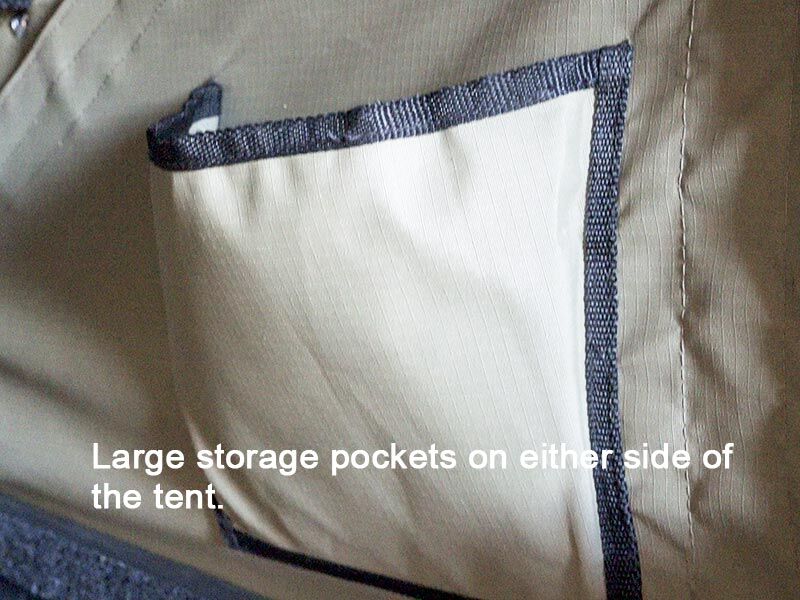- 3 storage pouches on inside of roof, and 1 large pouch on each side at hinged end.