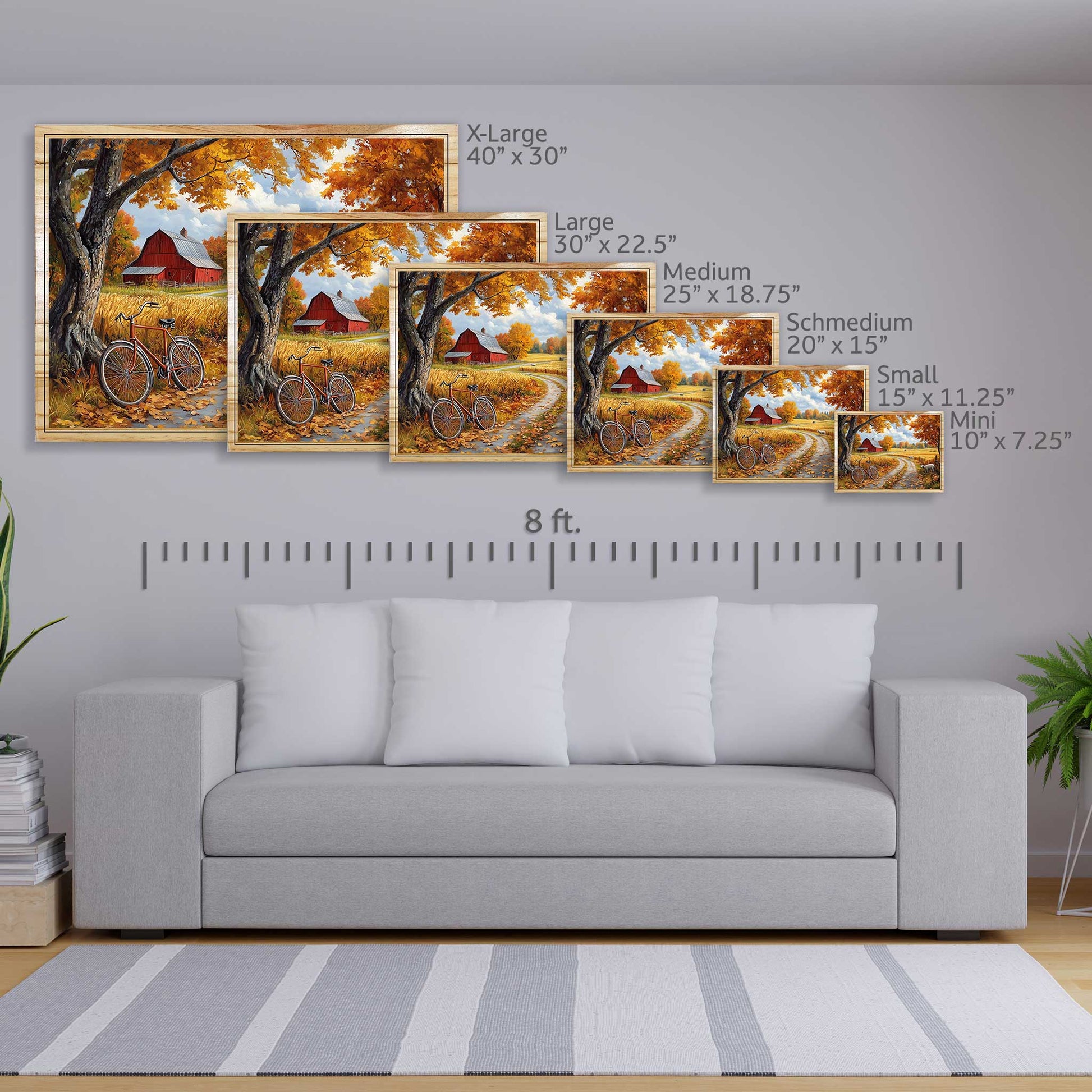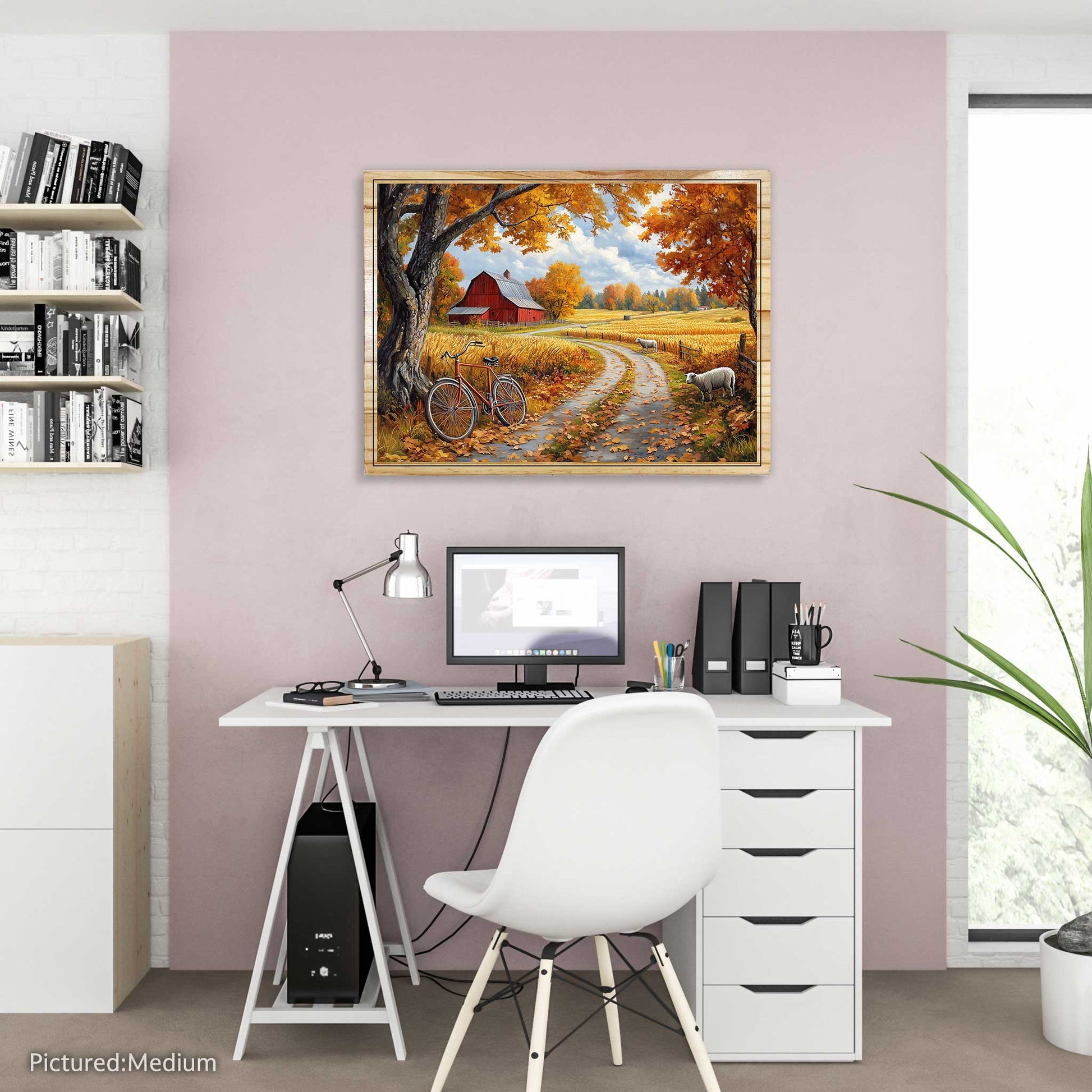 Embrace the warmth and nostalgia of harvest season with our Autumn Farmstead art print. This scene captures the quiet charm of country life — a red barn nestled among golden fields, a winding path blanketed in fallen leaves, and a vintage bicycle resting beneath an old tree. Soft autumn light dances across the landscape, while sheep graze peacefully along the roadside, evoking a sense of serenity and timeless simplicity.