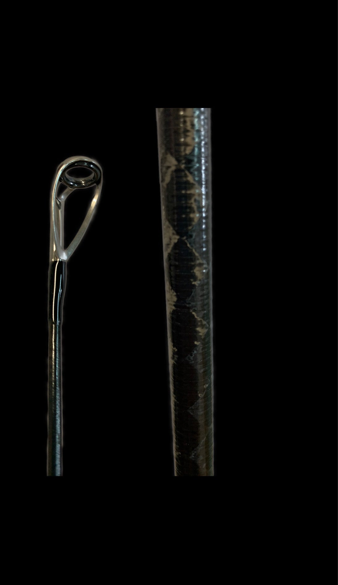 The Stealth Series is a slower action parabolic rod with a ton of backbone. These rods are best suited for throwing eels, darters, Dannie’s and any other lipped swimming baits that are not aerodynamic. The slower recovering action prevents extra tumble that a faster action rod will produce in the un-aerodynamic plugs. This rod is also good for the guys using light leaders for light bait with circle hooks. The moderate tip lets you throw 3 and 4 oz sinkers on very light 15# Fluorocarbon leaders without having to worry about the leaders breaking.