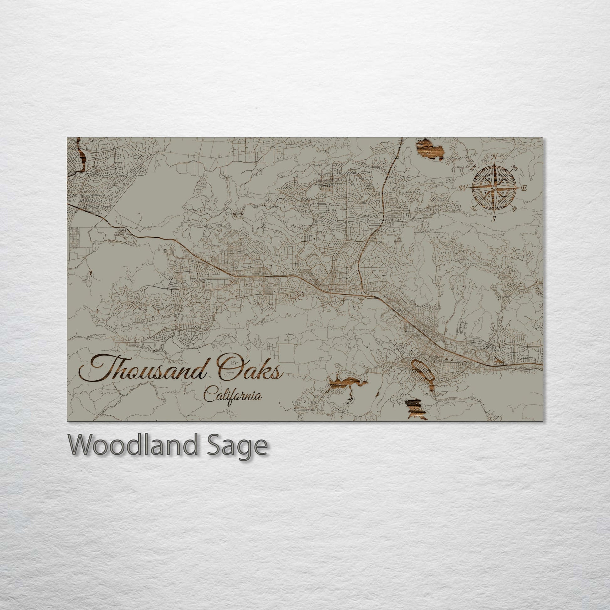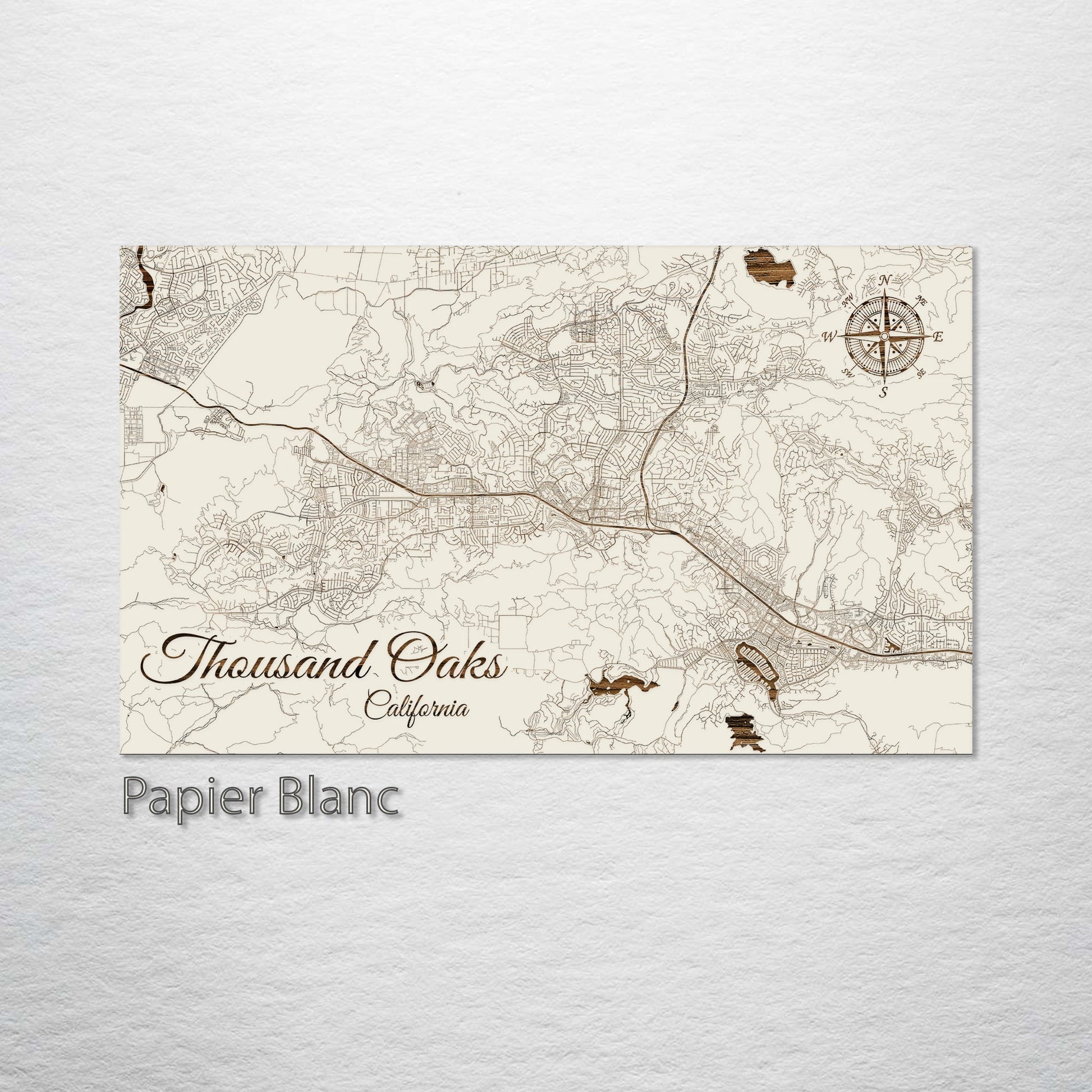 This wood-engraved Thousand Oaks, California Street Map is a superior selection for anyone's collection of local or geographic art. Meticulously carved into premium pine wood, the elaborate network of Thousand Oaks' roadways is expertly captured, making this a prime piece for those passionate about maps, geography, or California history.