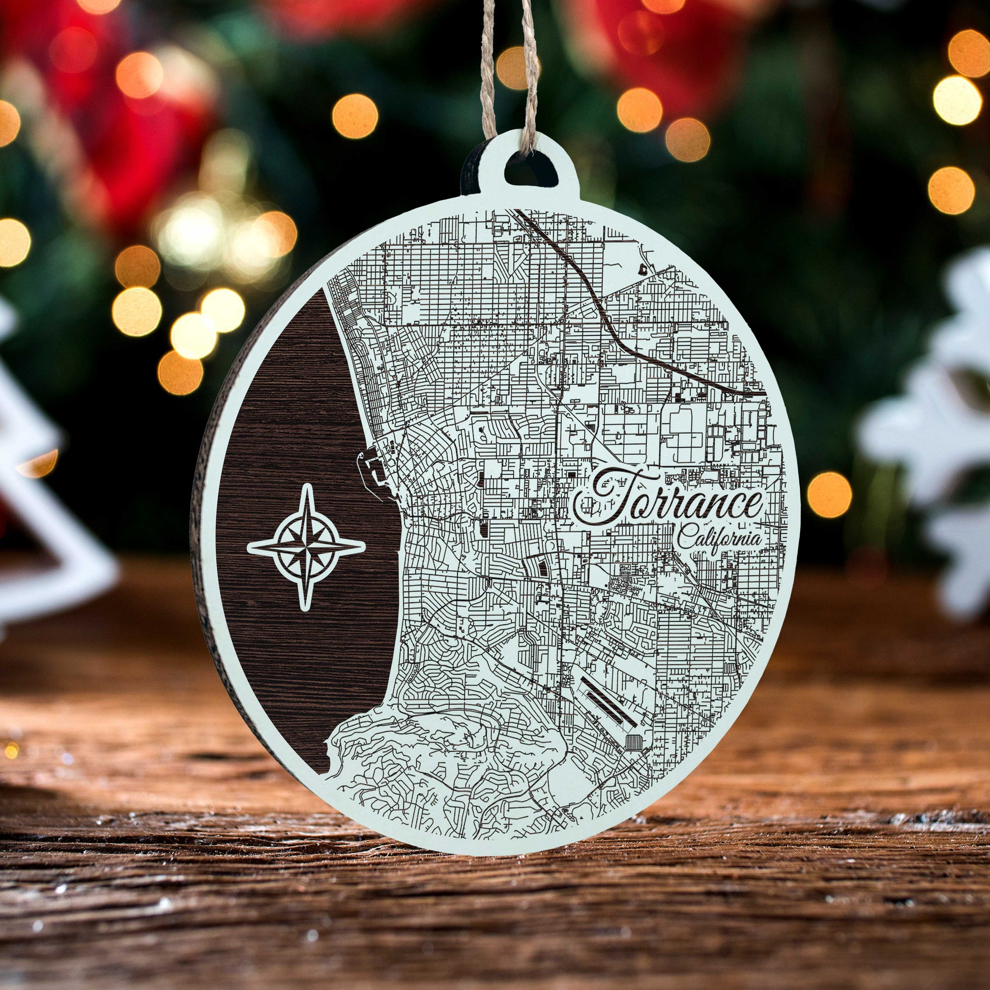 Enjoy Torrance, California during the holidays with our handcrafted wooden map ornament! Sized at 4” x 5” and available in 6 color options, this ornament is meticulously carved from premium pine wood, featuring Torrance, California's unique layout. It's an artistic blend of memory and decor, ideal for the holidays or as a treasured memento.