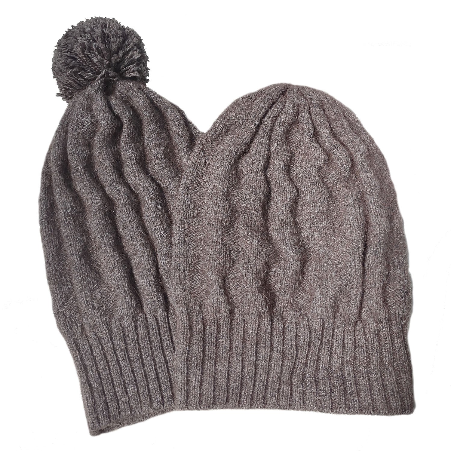 This hat is designed with a looser fit as a slouchy hat. The knitted pattern is diamond. Available in five colors, natural (undyed), blue, black, burgundy, and green.