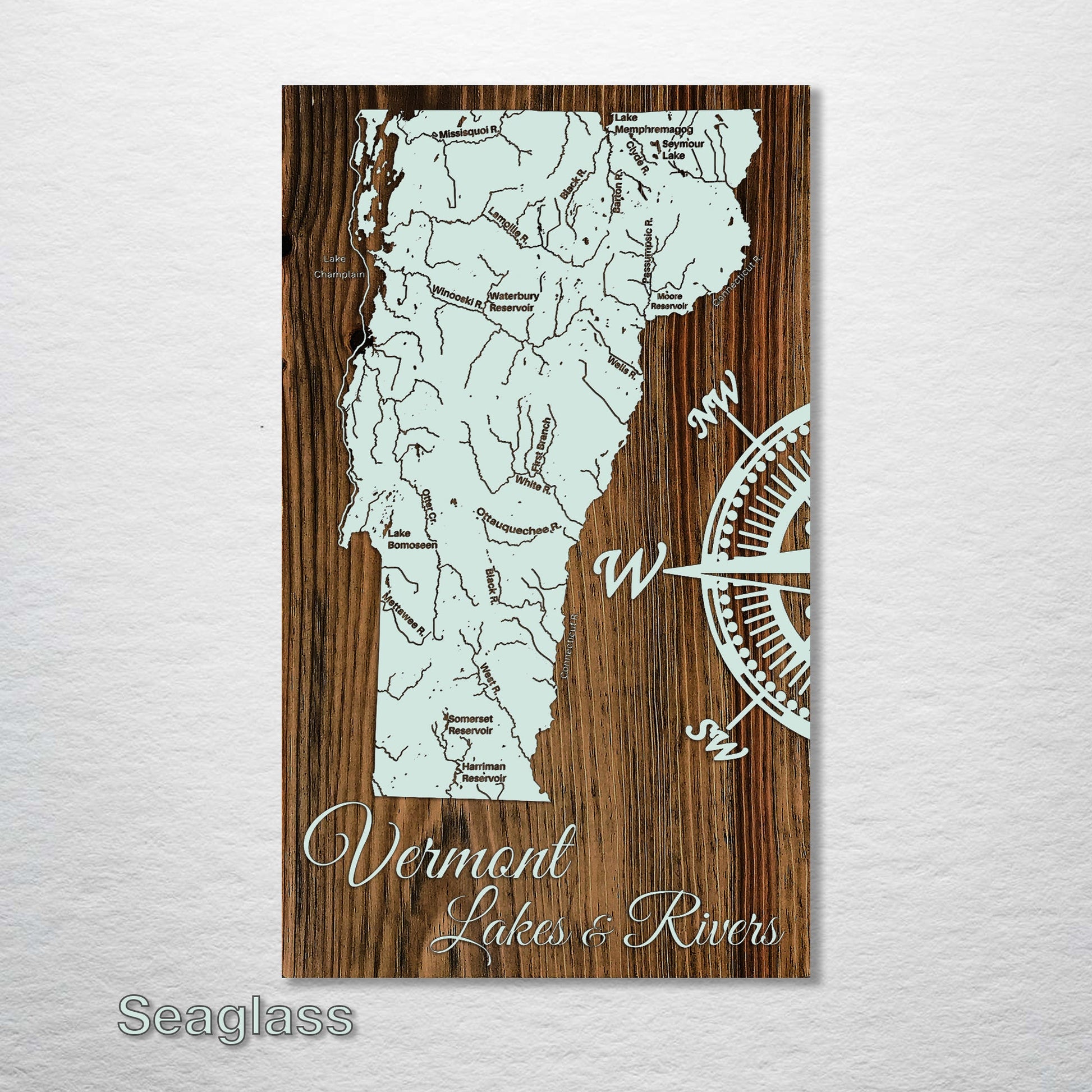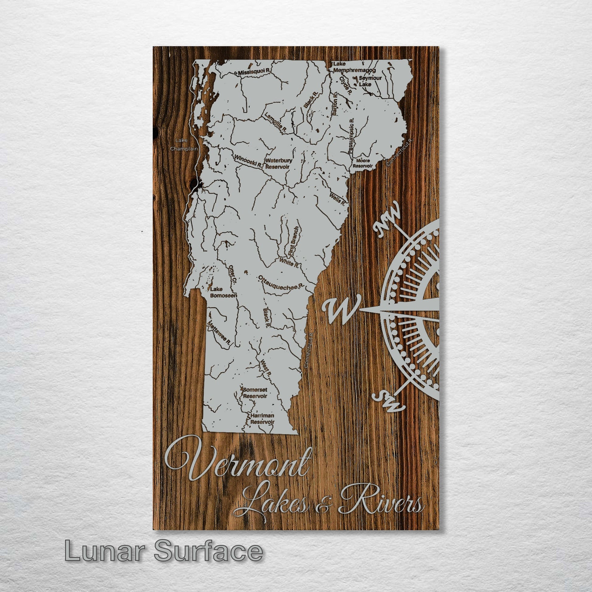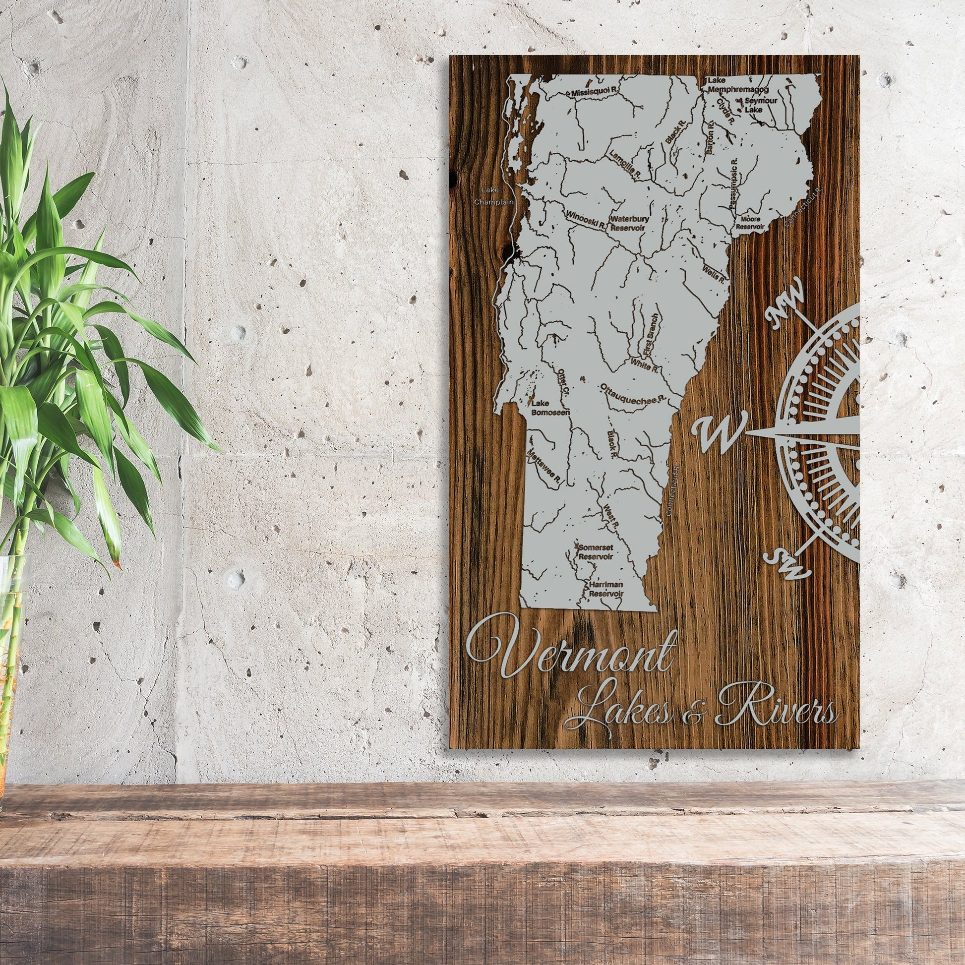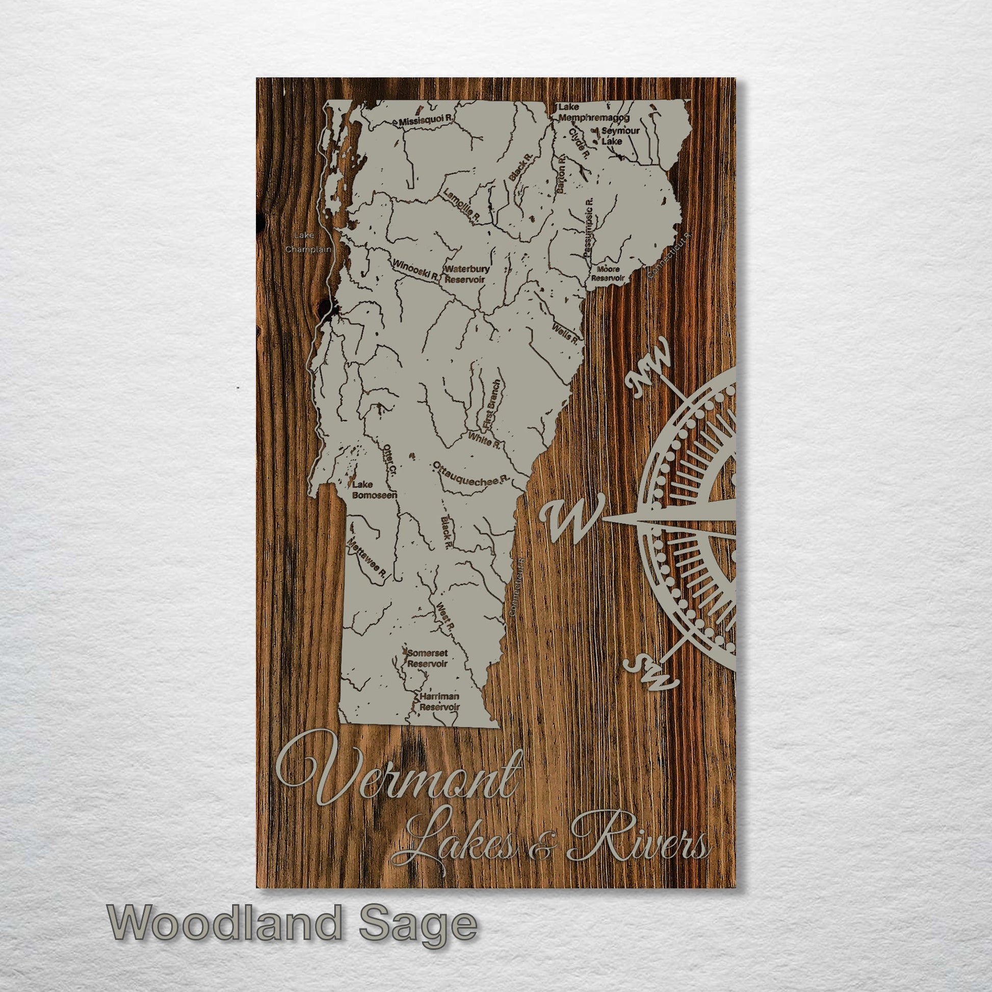 This is a map of the major lakes & rivers in Vermont designed by Fire & Pine artists.