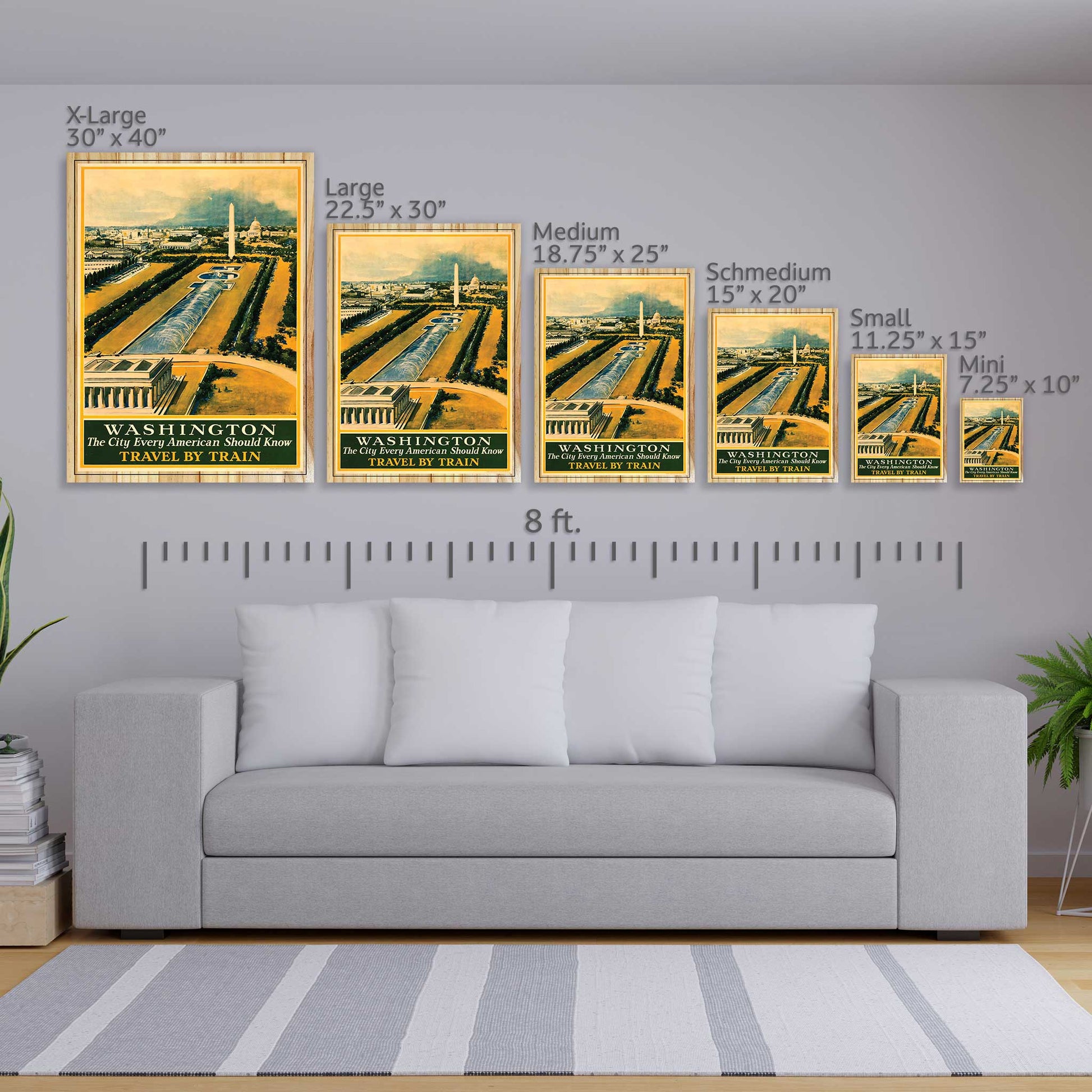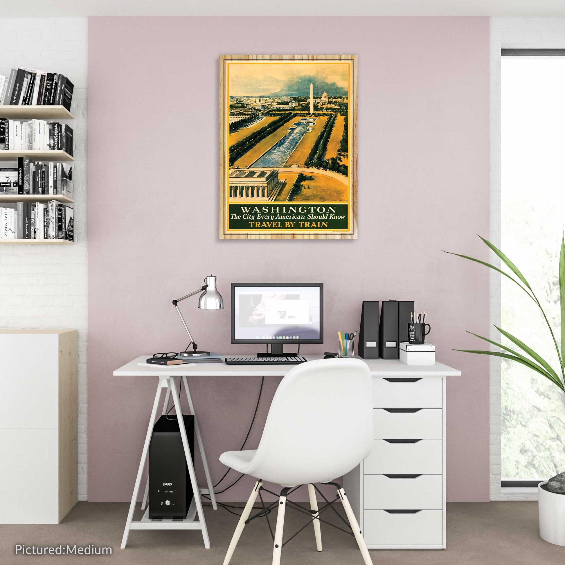 The wood printed poster is crafted with utmost care and attention to detail, featuring a meticulously designed scene that showcases the iconic landmarks and symbols associated with Washington, D.C. From the majestic dome of the United States Capitol to the stately Washington Monument piercing the sky, every element is thoughtfully incorporated to create a visually stunning representation of this historic city.