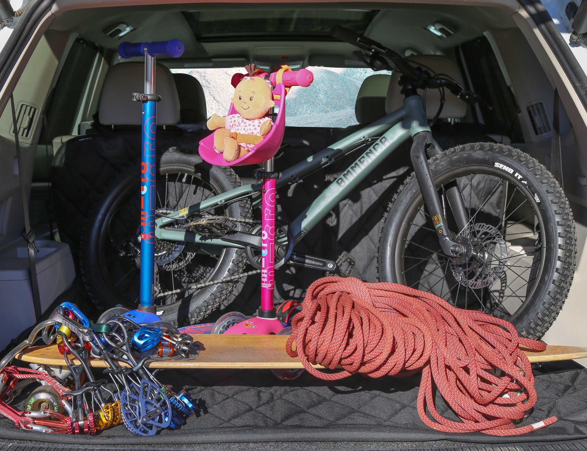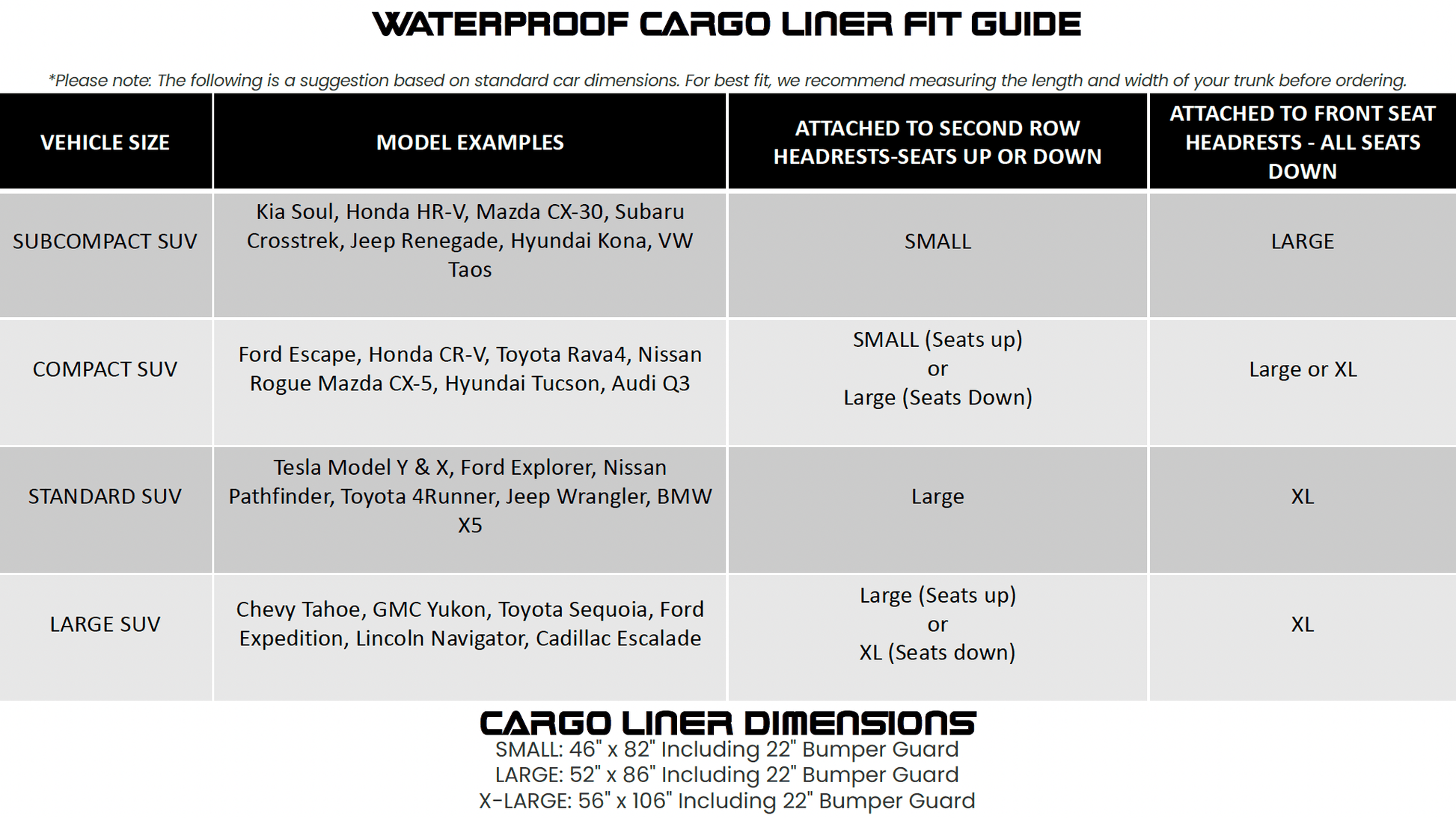 Our Multi-Function, Multi-Use Divided Black SUV Cargo Liner with a Bumper Guard is perfect to protect your vehicle and gear for all-season activities from skiing & riding to biking & hiking, beach adventures and transporting your dog. It's waterproof, heavy-duty fabric is easy to clean after use and stores in the included compact drawstring bag.