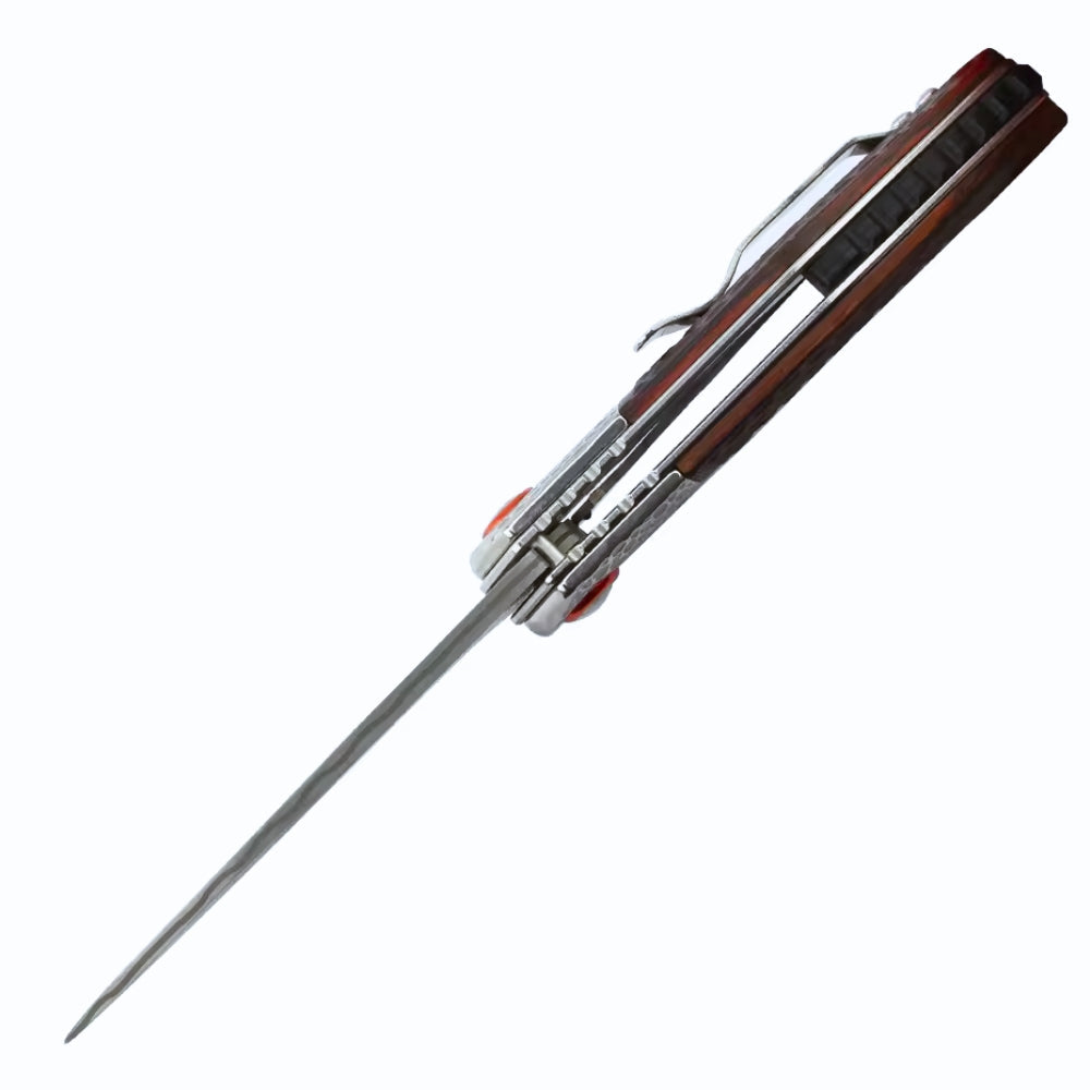 The elegant handle is made using real exotic sandal wood scales. It has been sealed to prevent cracking or drying and preserve the handle for lifetime comes with Under lock ball bearing folding mechanism.
