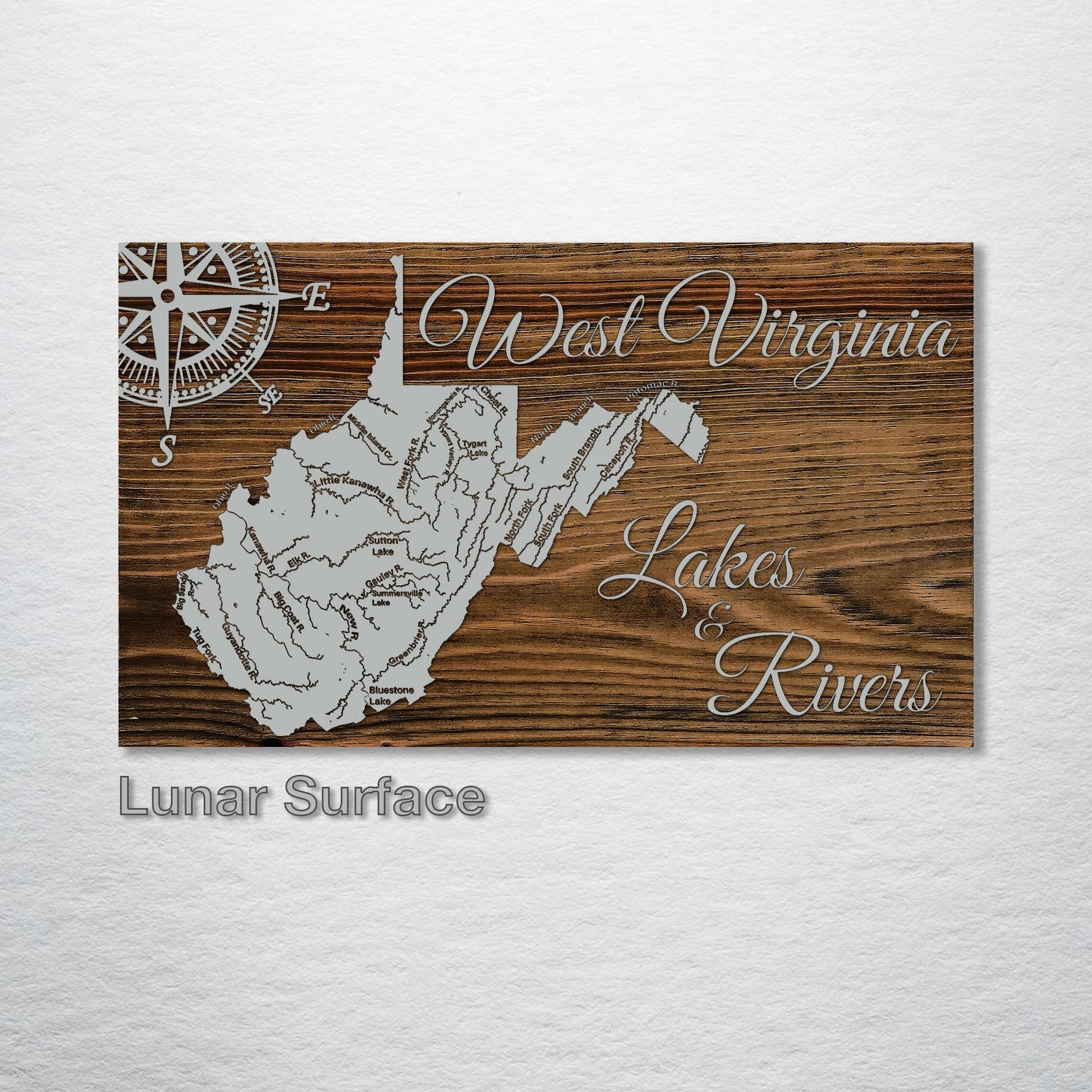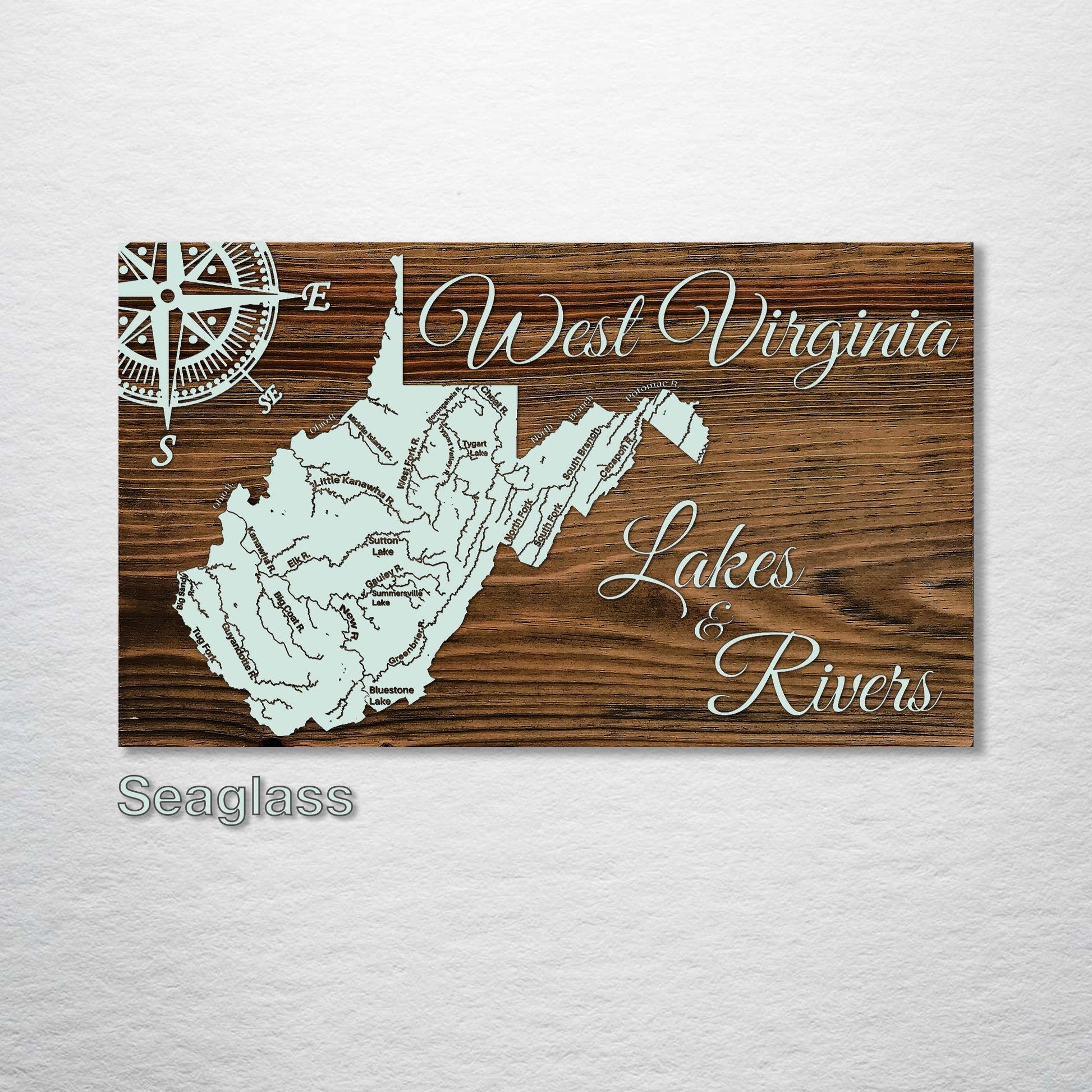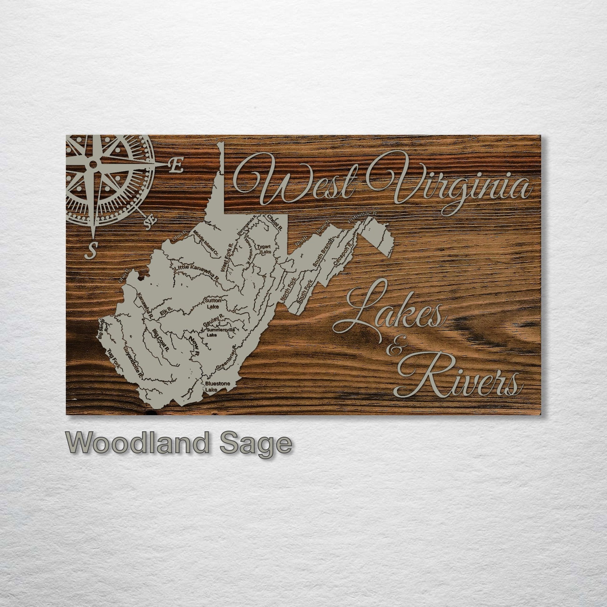 This is a map of the major lakes & rivers in West Virginia designed by Fire & Pine artists.
