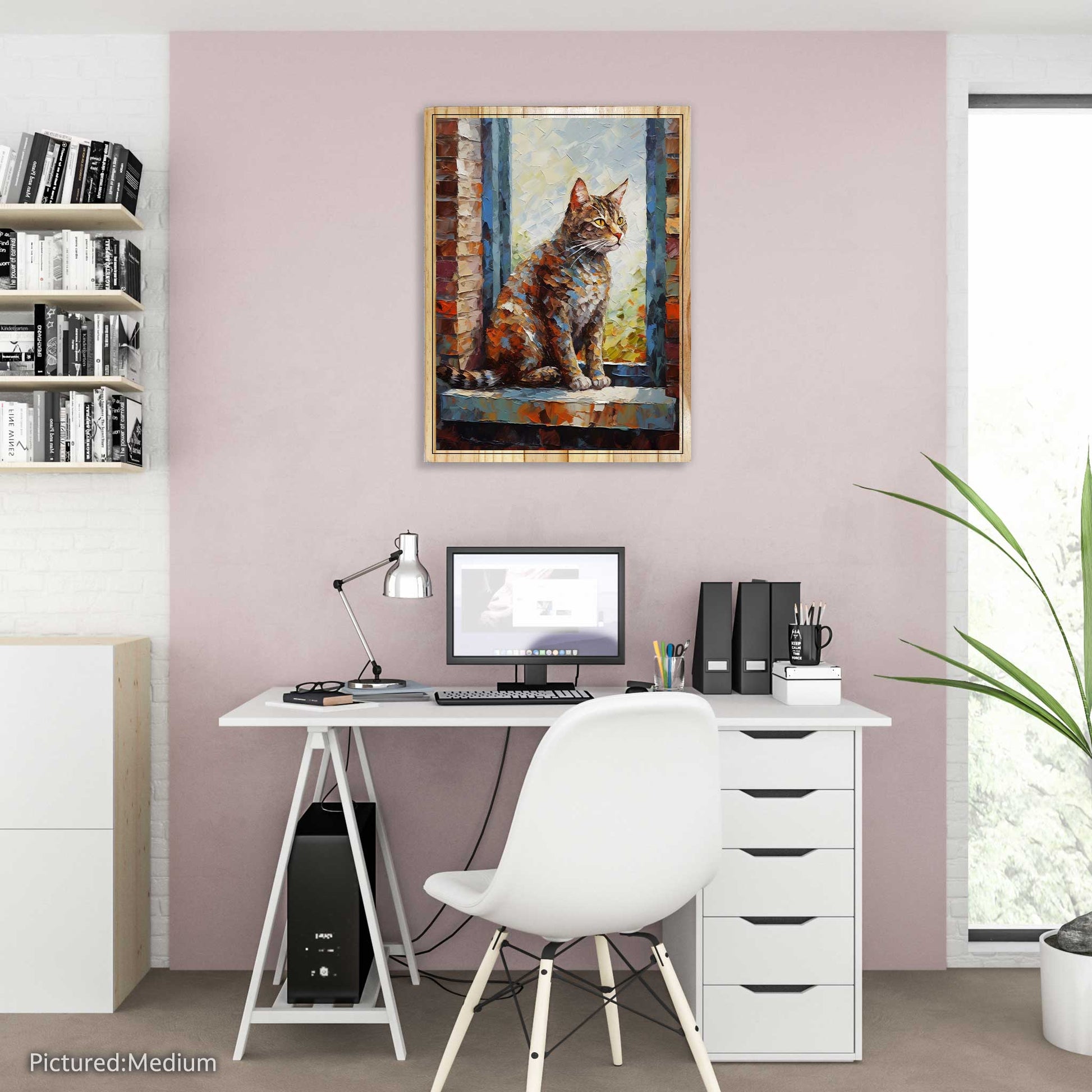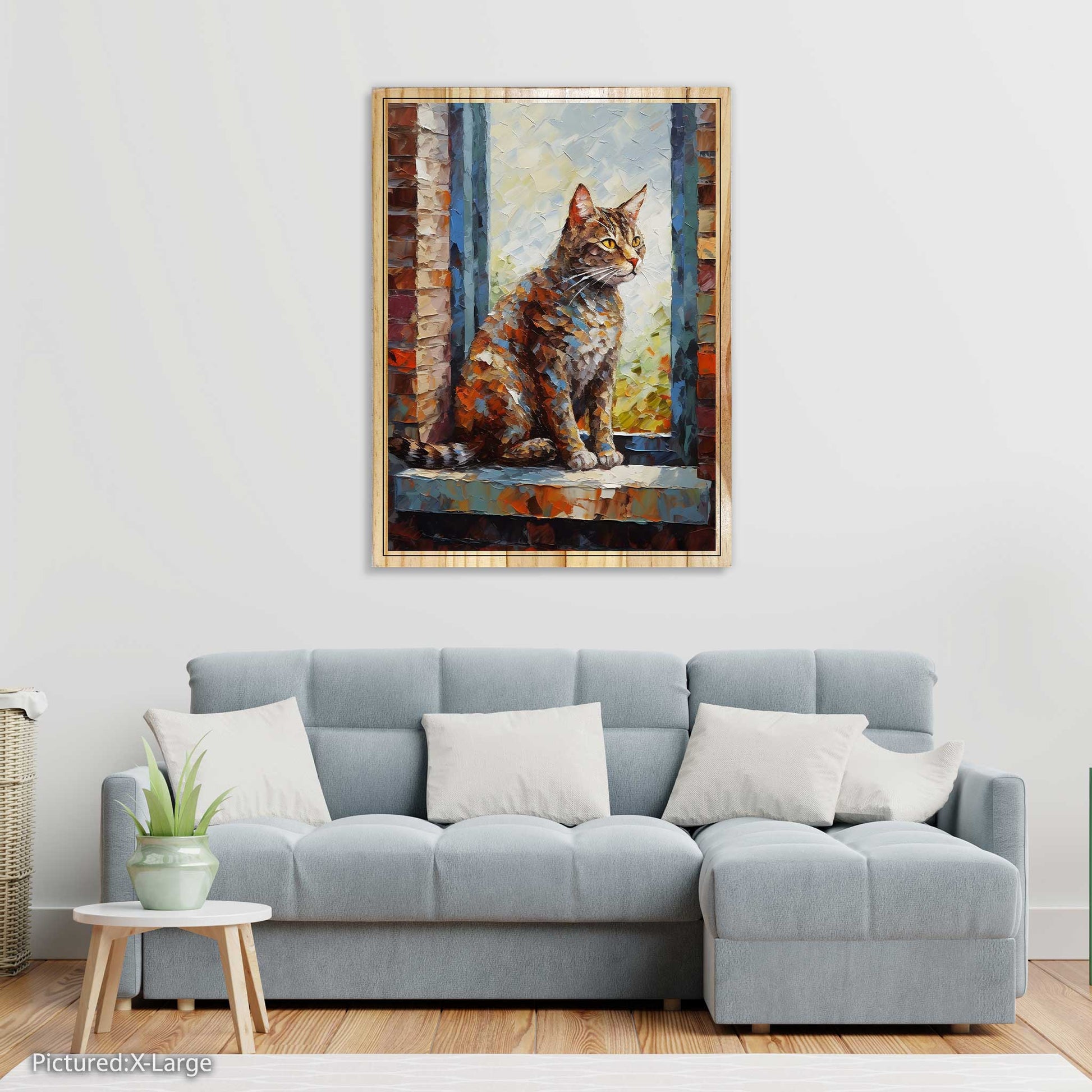Perfect for your living room, office, or study, the 'Window Cat' print brings the warmth and charm of a cat companion to your space. Available in various sizes, this pine wood print combines the rustic texture of wood grain with the vibrant hues and intricate details of traditional oil painting.