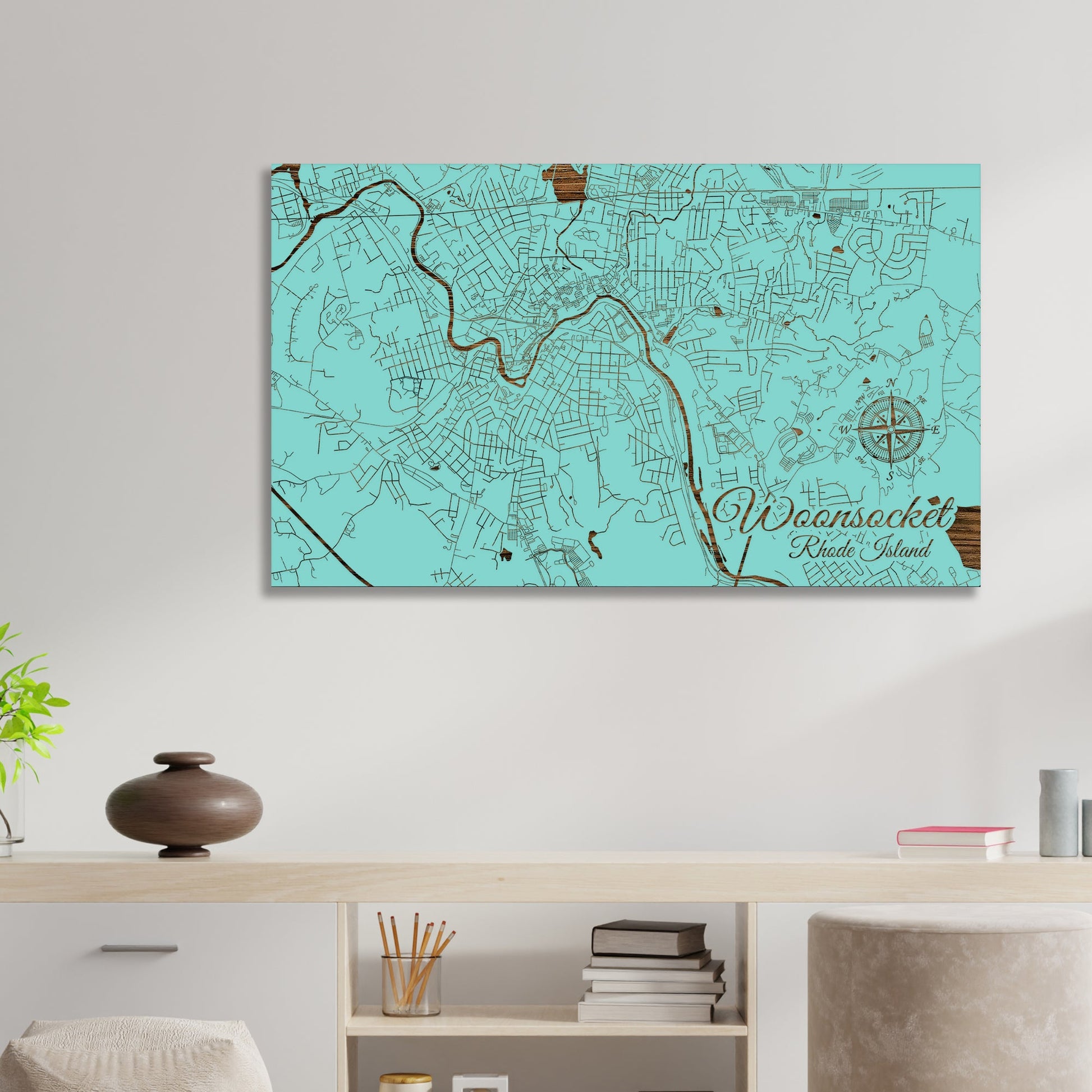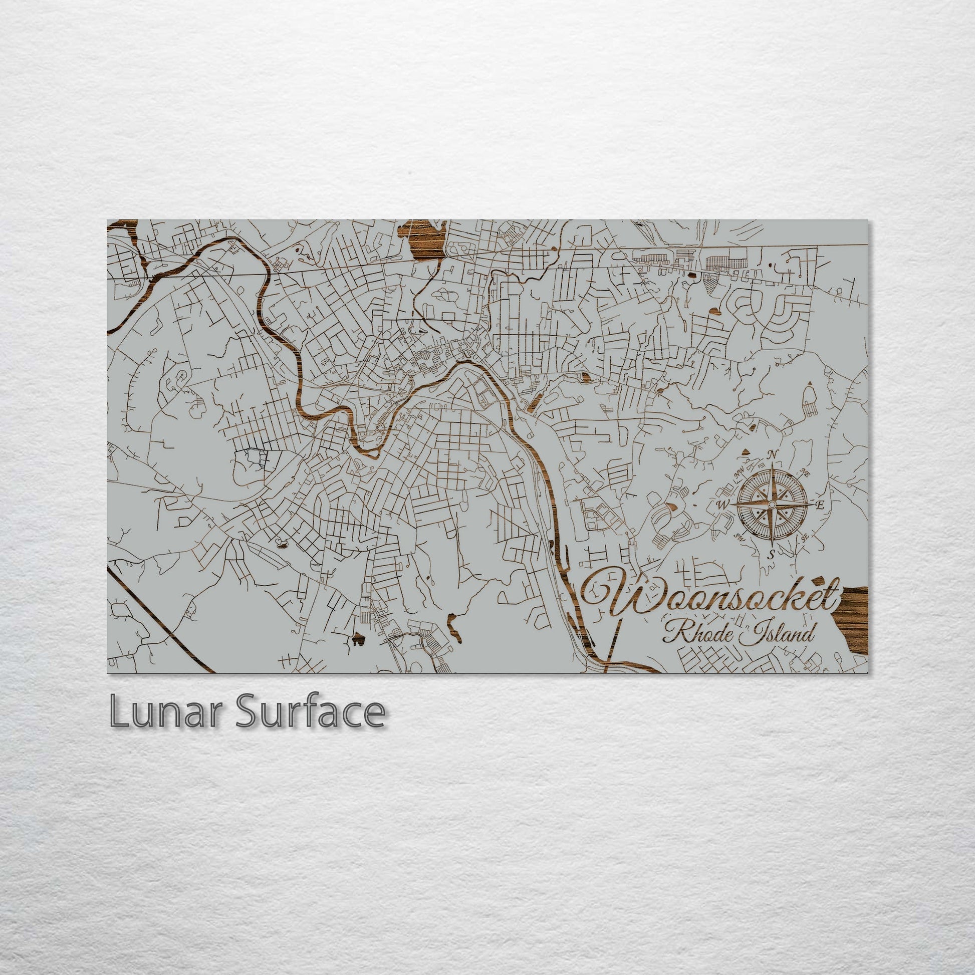 This is a street map of Woonsocket, RI designed by Fire & Pine artists.