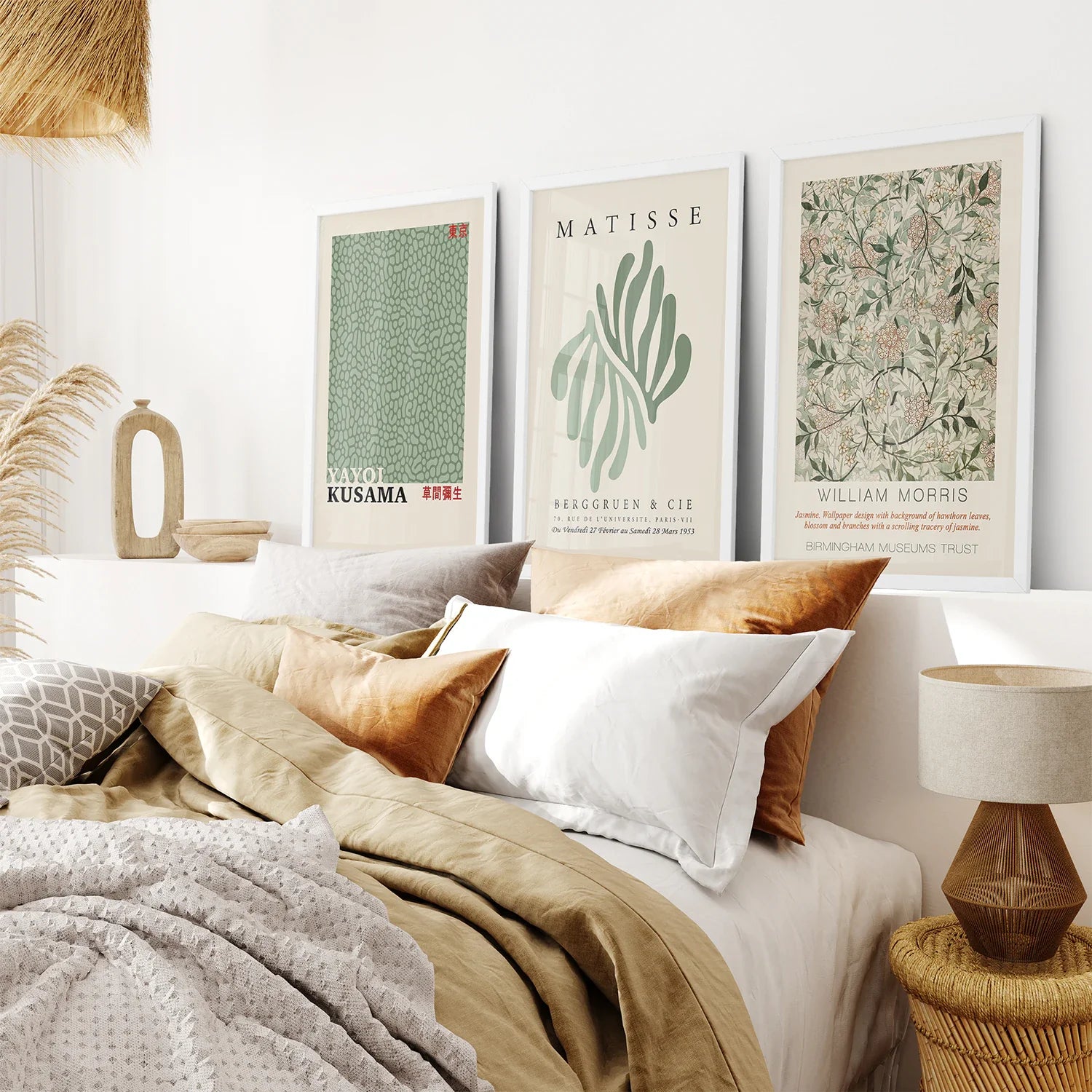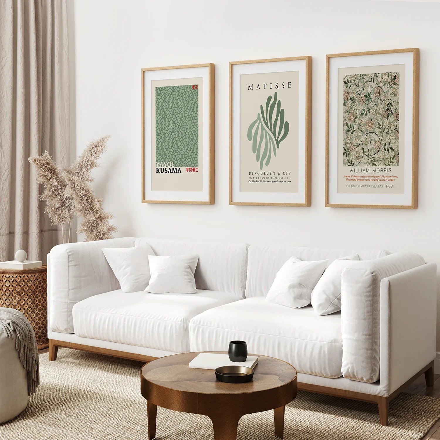 Add a touch of contemporary elegance to your home decor with our Yayoi Kusama Sage Green Print Set of 3. This framed museum poster set is perfect for any art lover, featuring exhibition-style pieces by Yayoi Kusama, Matisse, and William Morris. Perfect for your gallery wall, these canvas prints will bring a unique and modern touch to your living room.