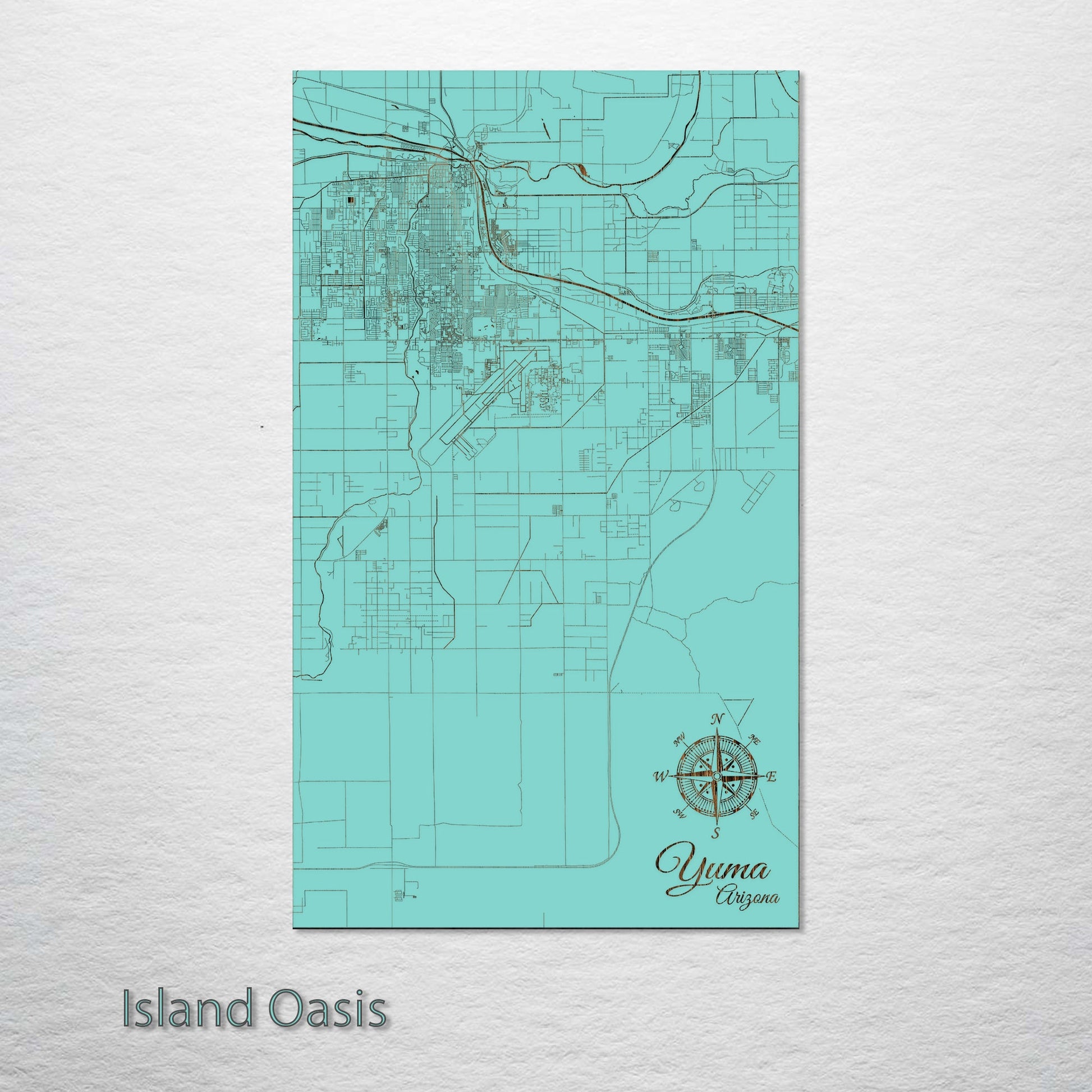 Unique gift for cartography enthusiasts: This wood-engraved street map of Yuma, Arizona showcases the intricacies of the city's roadways. Using premium pine wood, the fine detailing ensures a blend of accuracy and artistry.